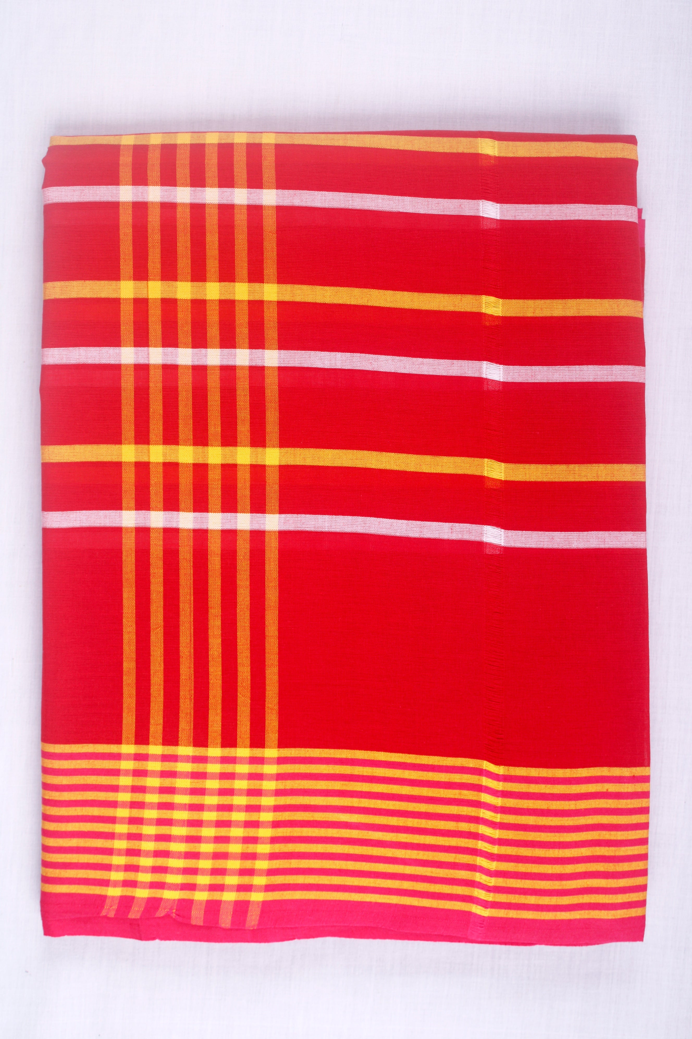 Red Dhoti Dupatta with White and Yellow Stripes and Magenta Border