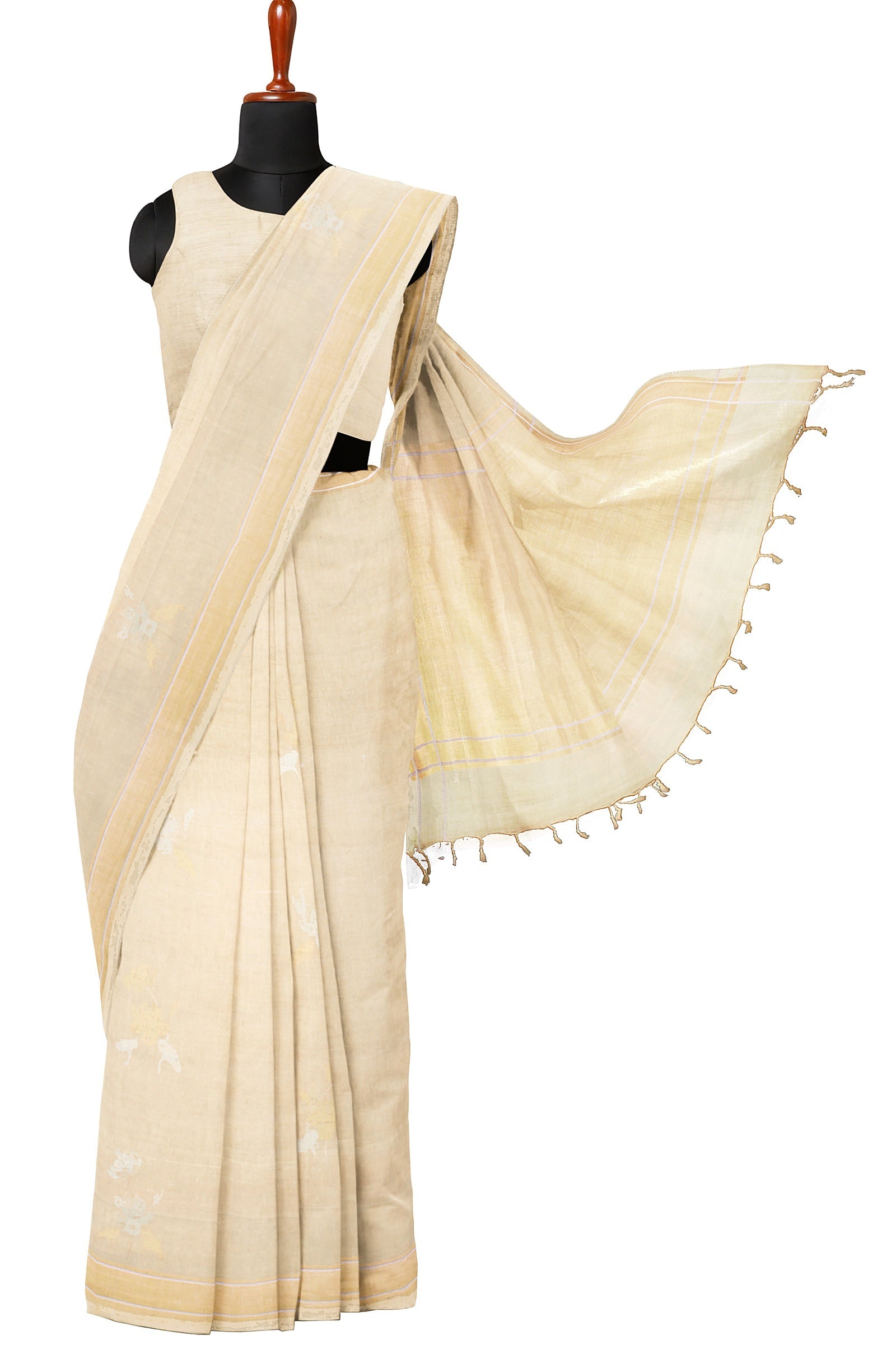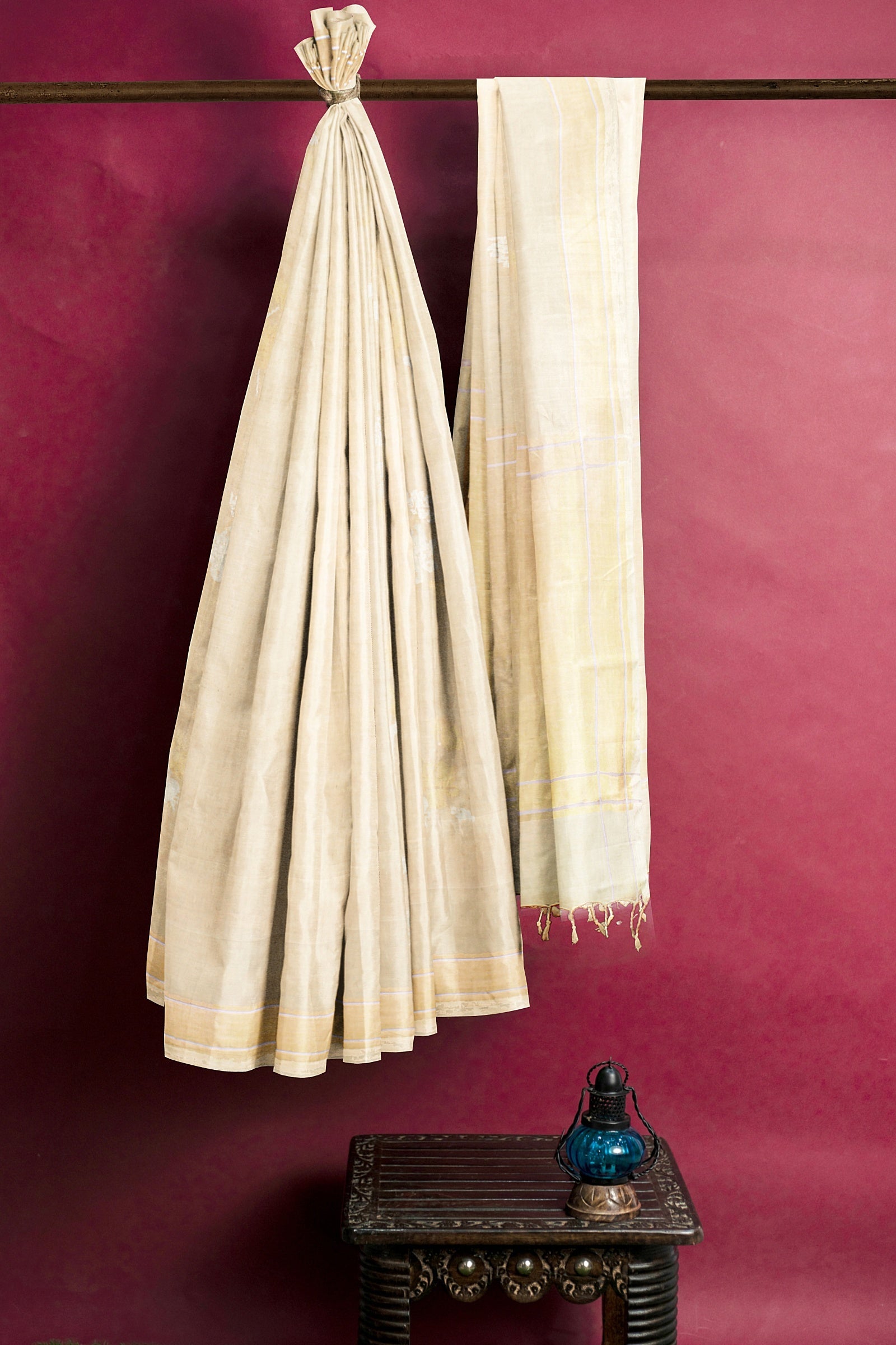 Off White Organic Jacquard Saree with Silver and Golden Zari Border and Butis