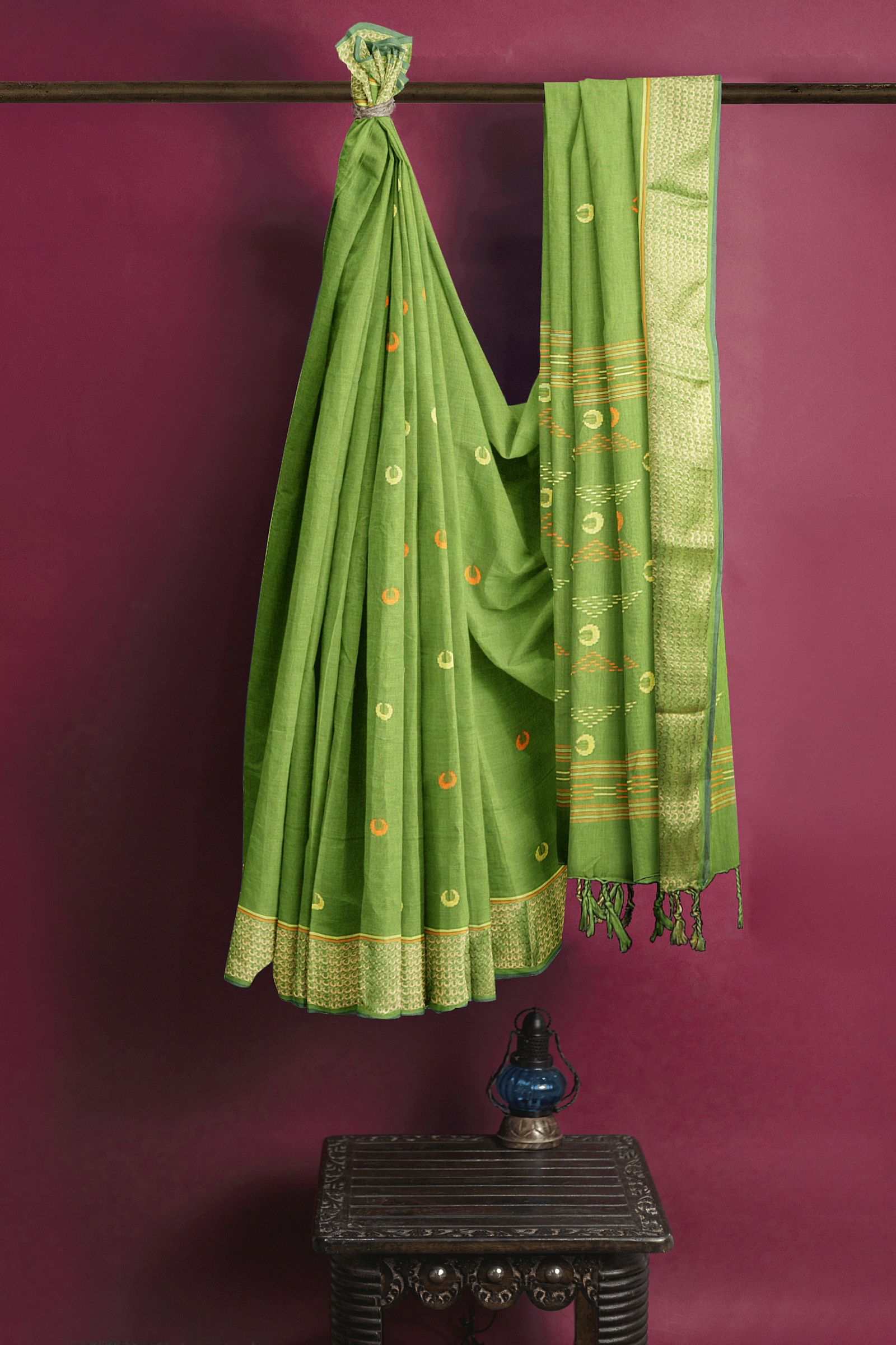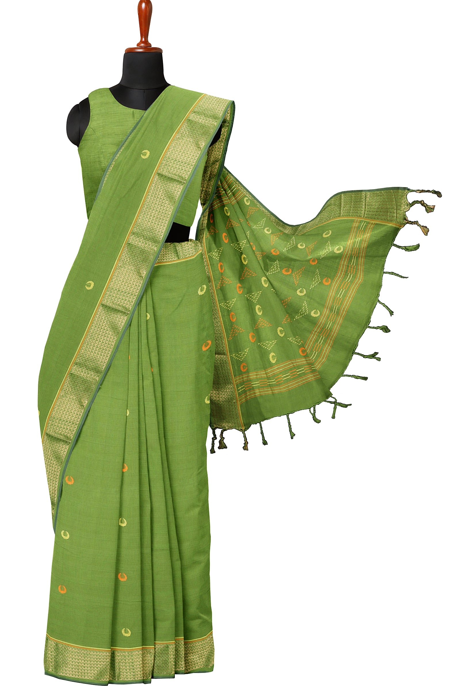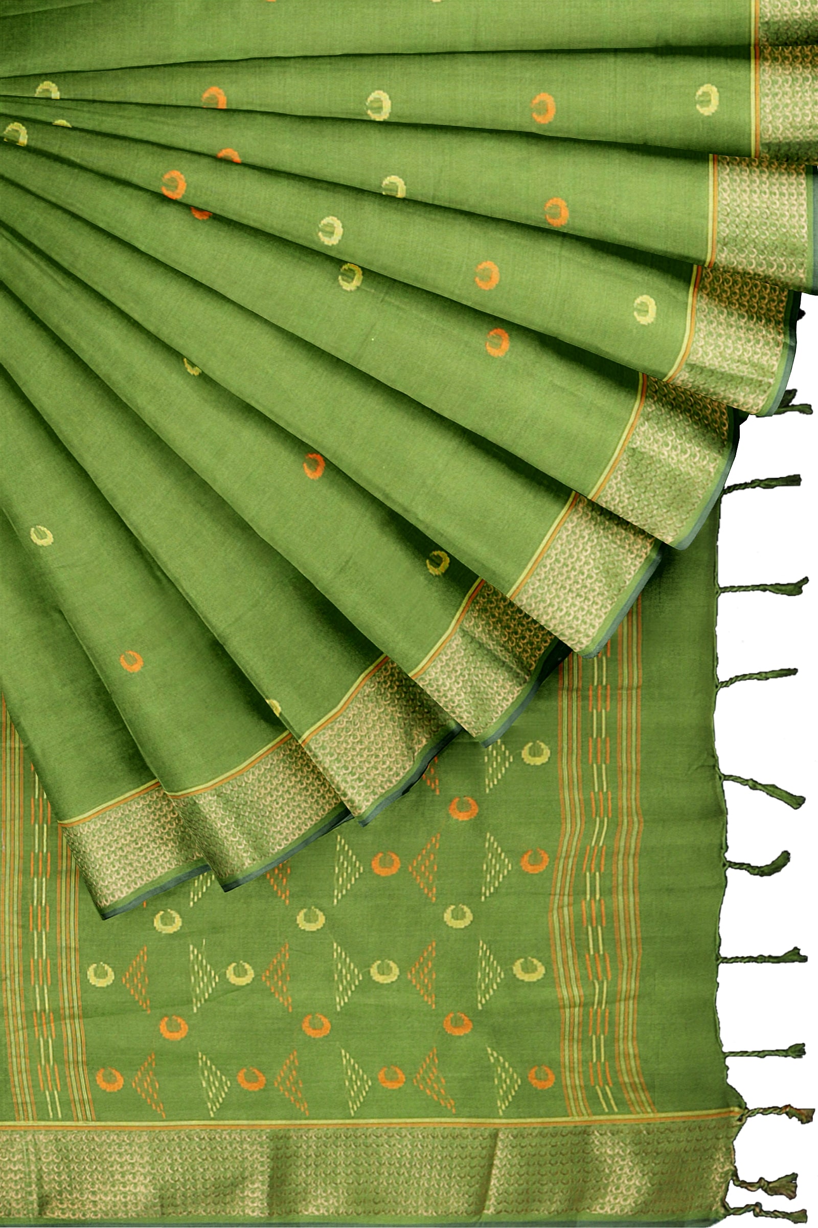 Green Mercerised Cotton Saree with Golden Zari Border and Butis