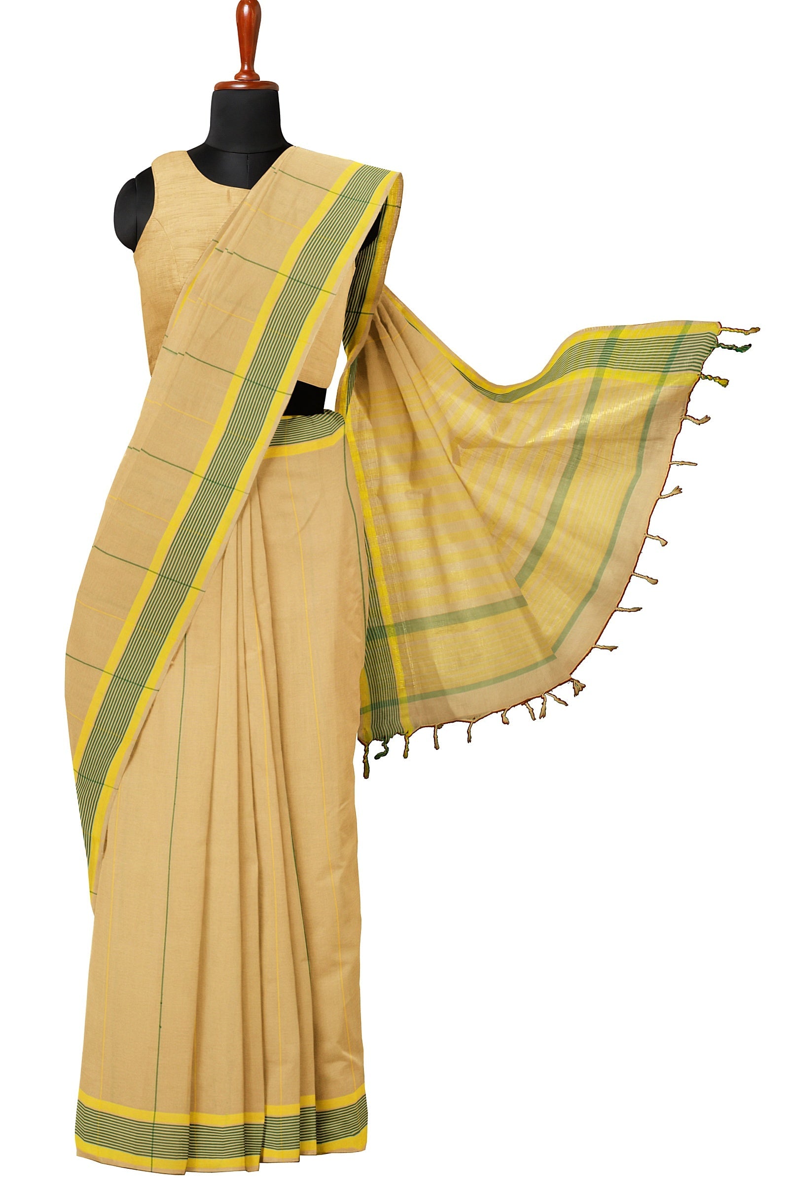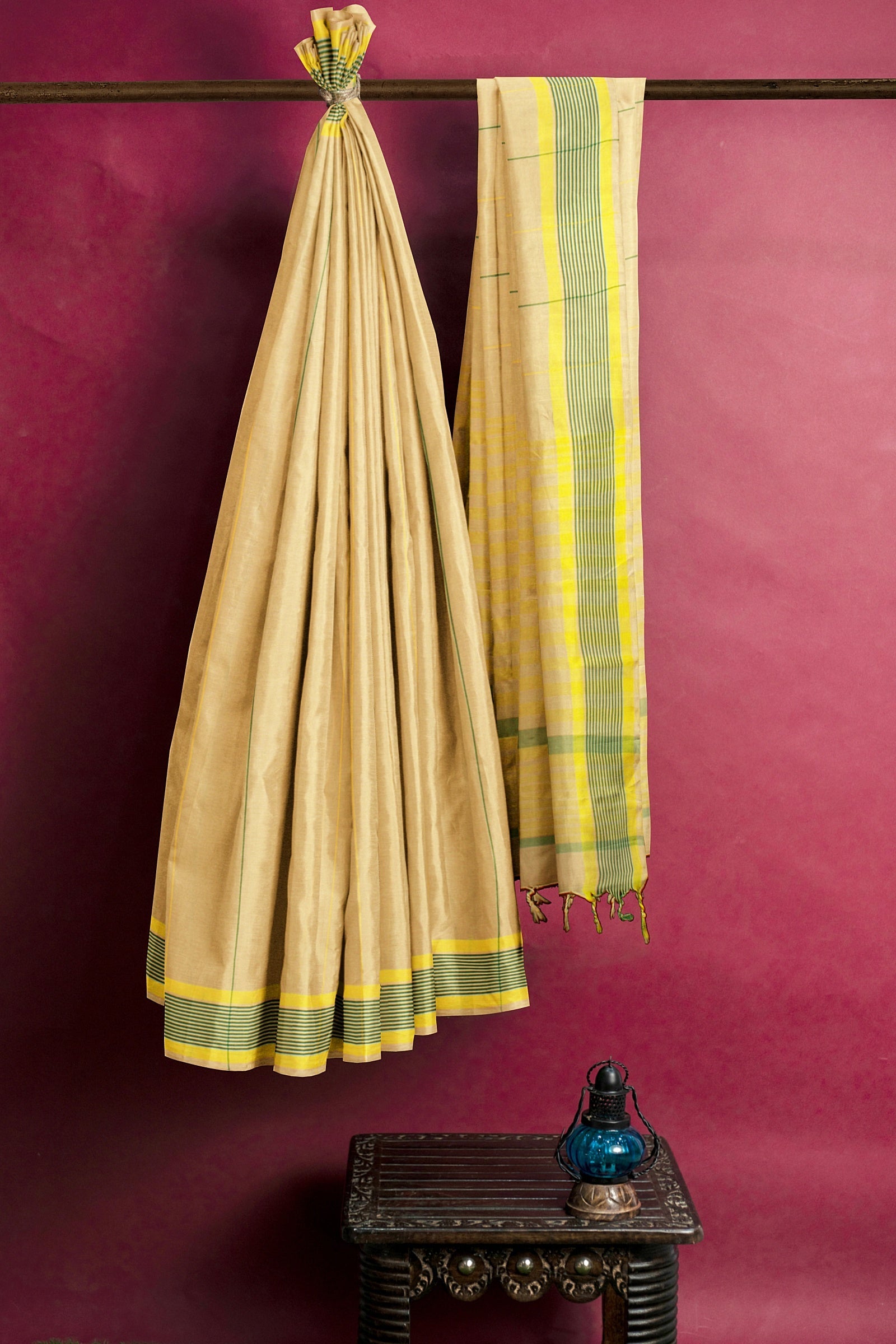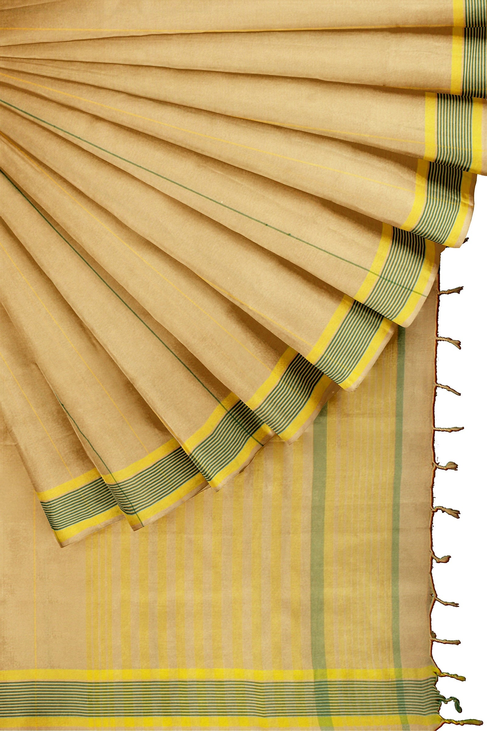 Brass Yellow Saree with Bright Yellow and Green Lines and Border