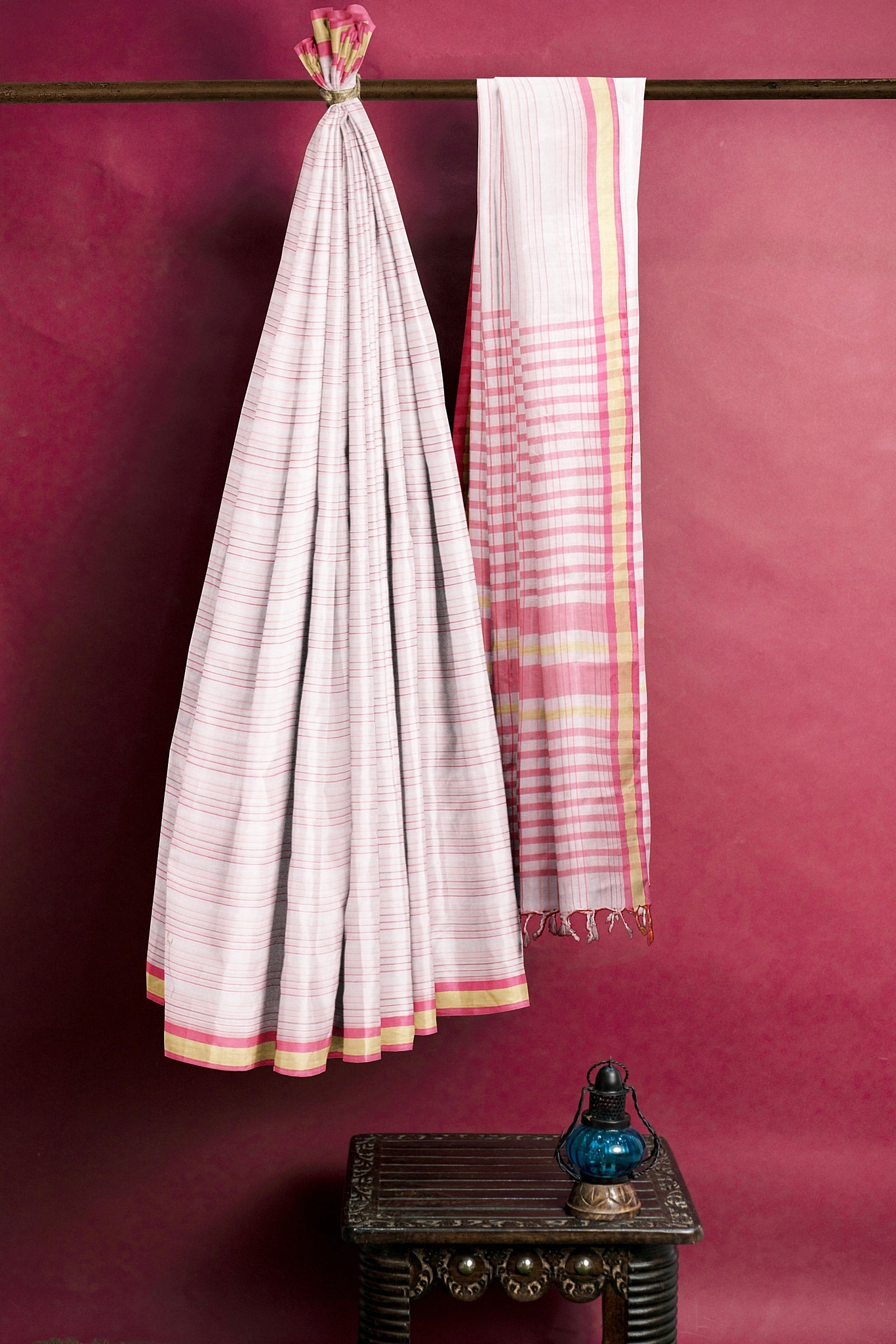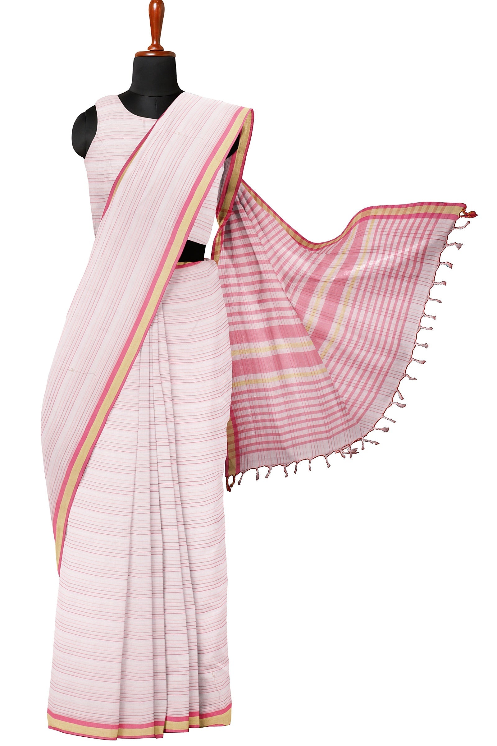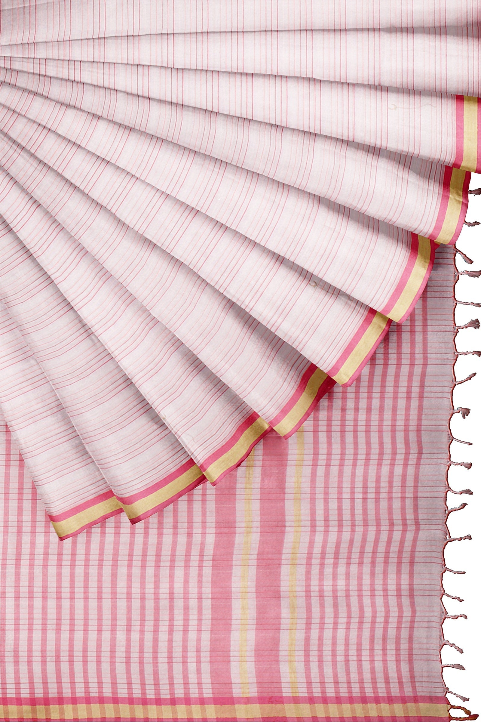 White Saree with Pink Multi Shade Linings and Magenta and Beige Border