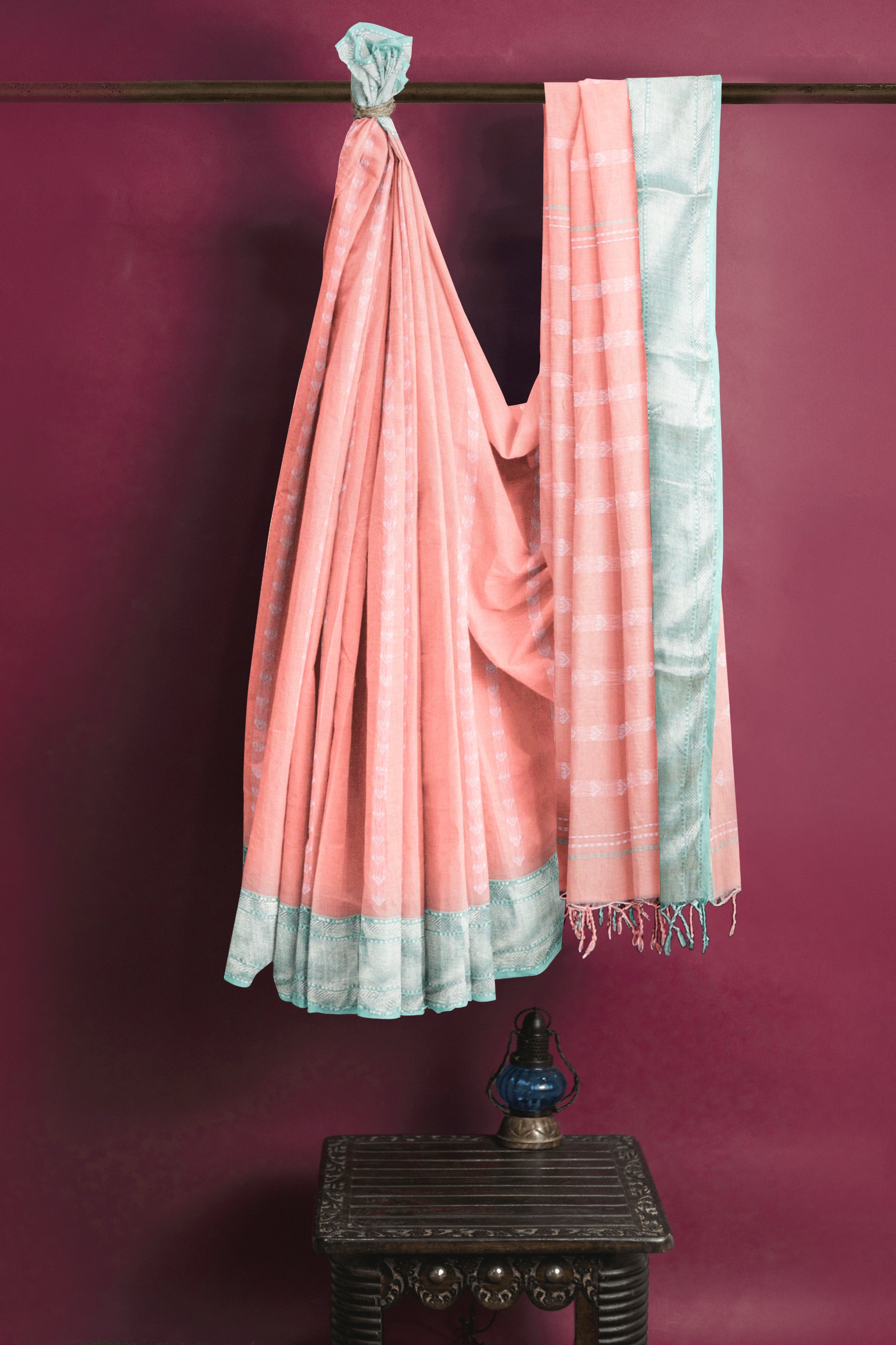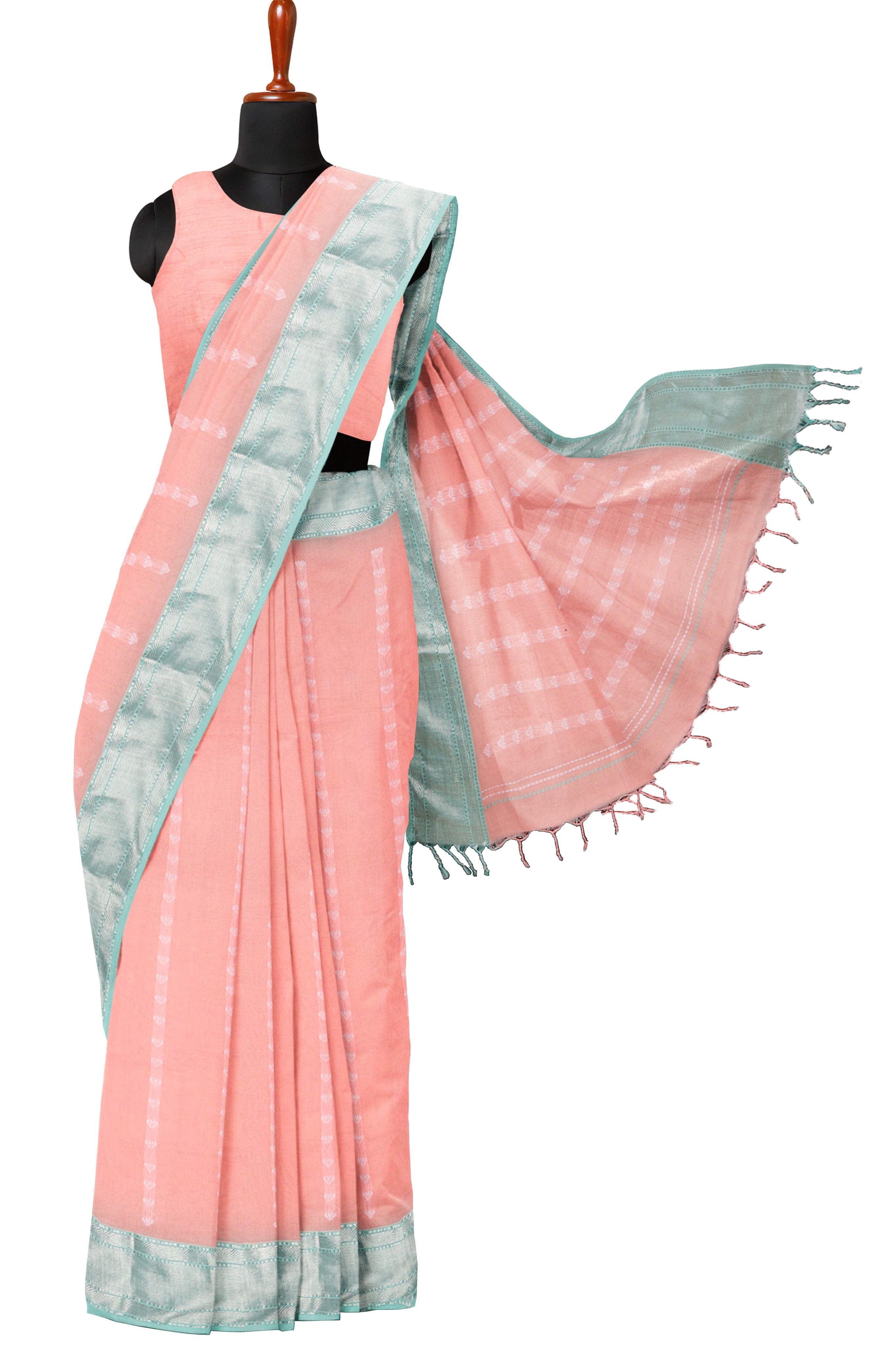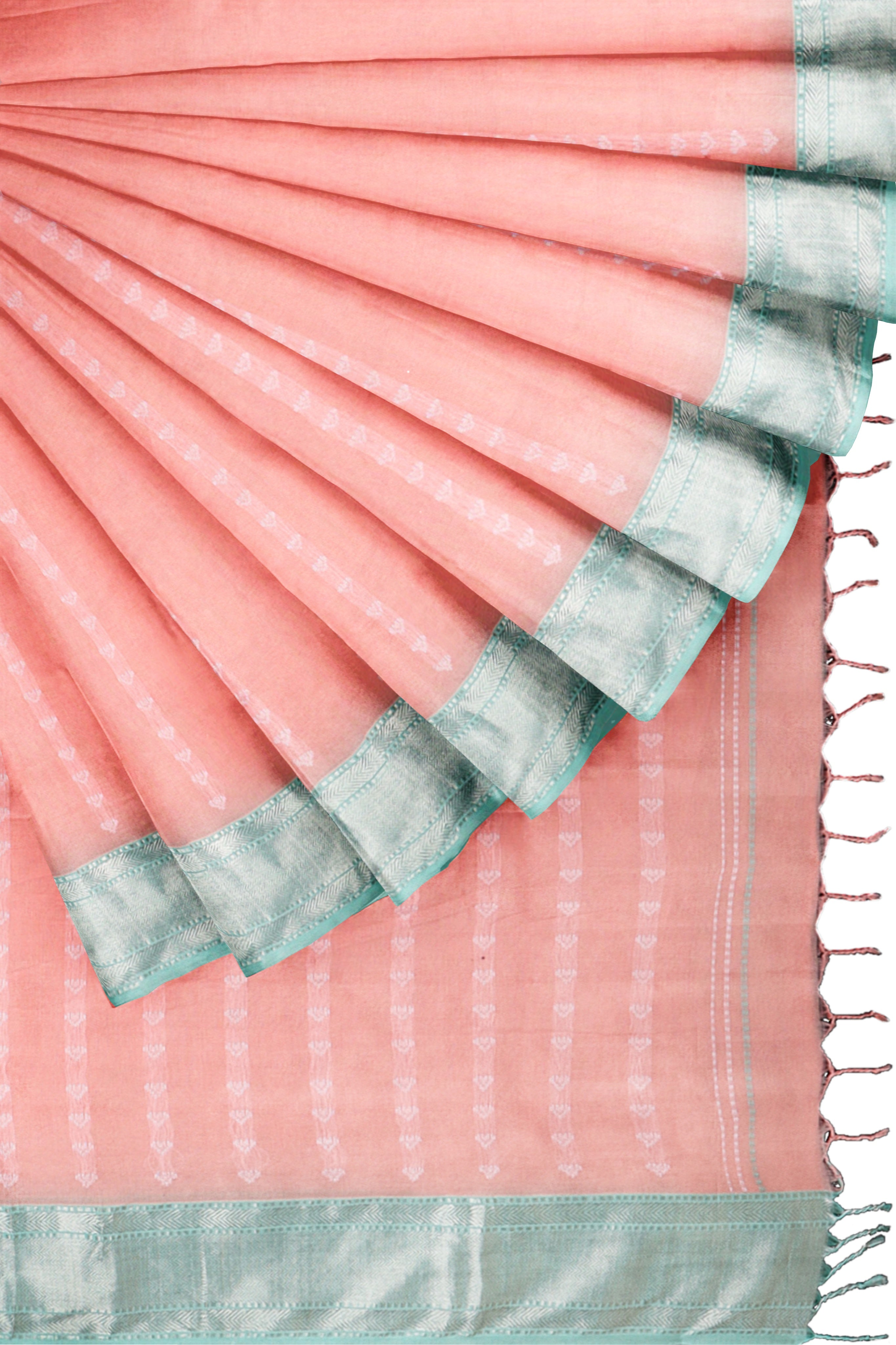 Peach Dobby Saree with Butis and Silver Zari Border