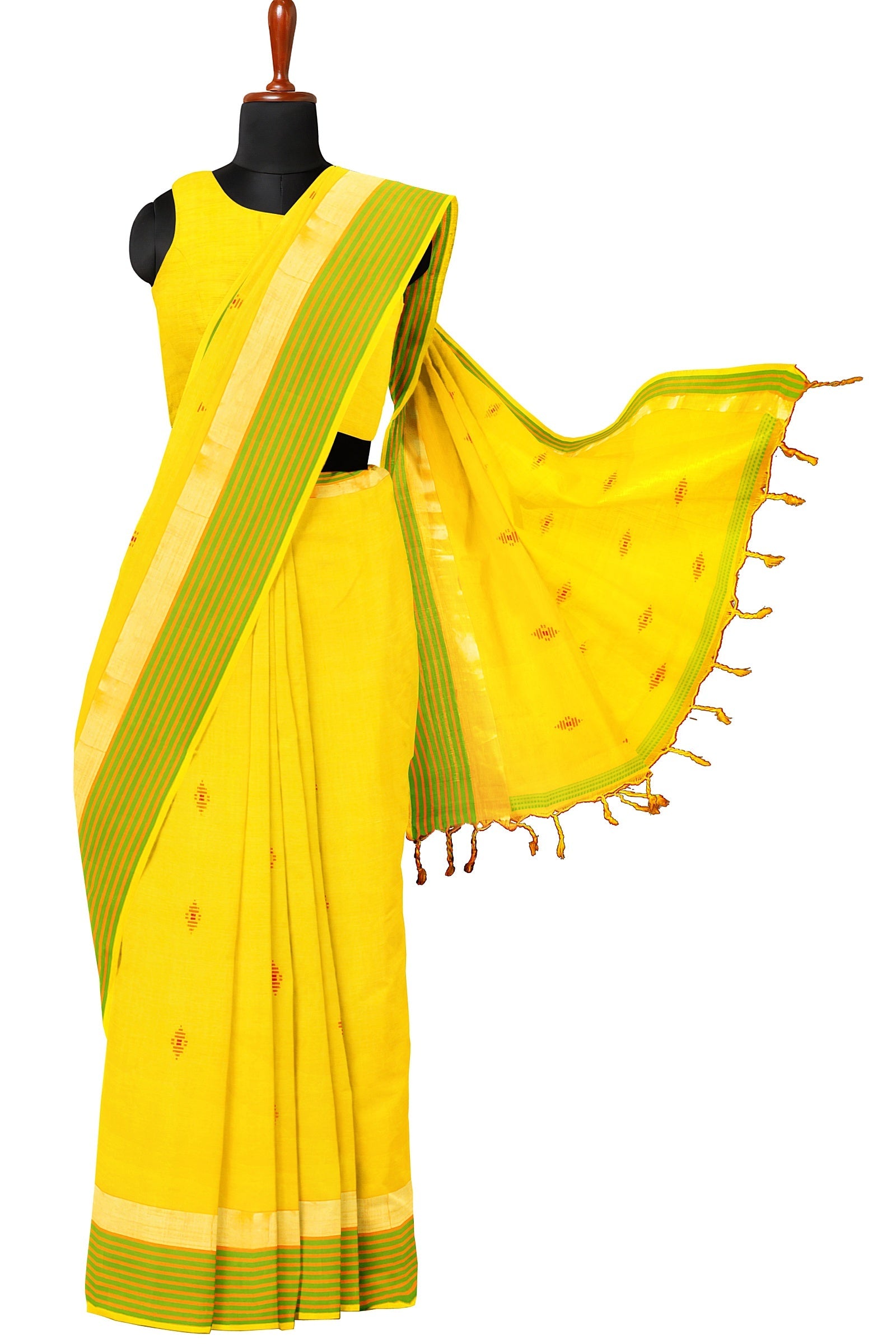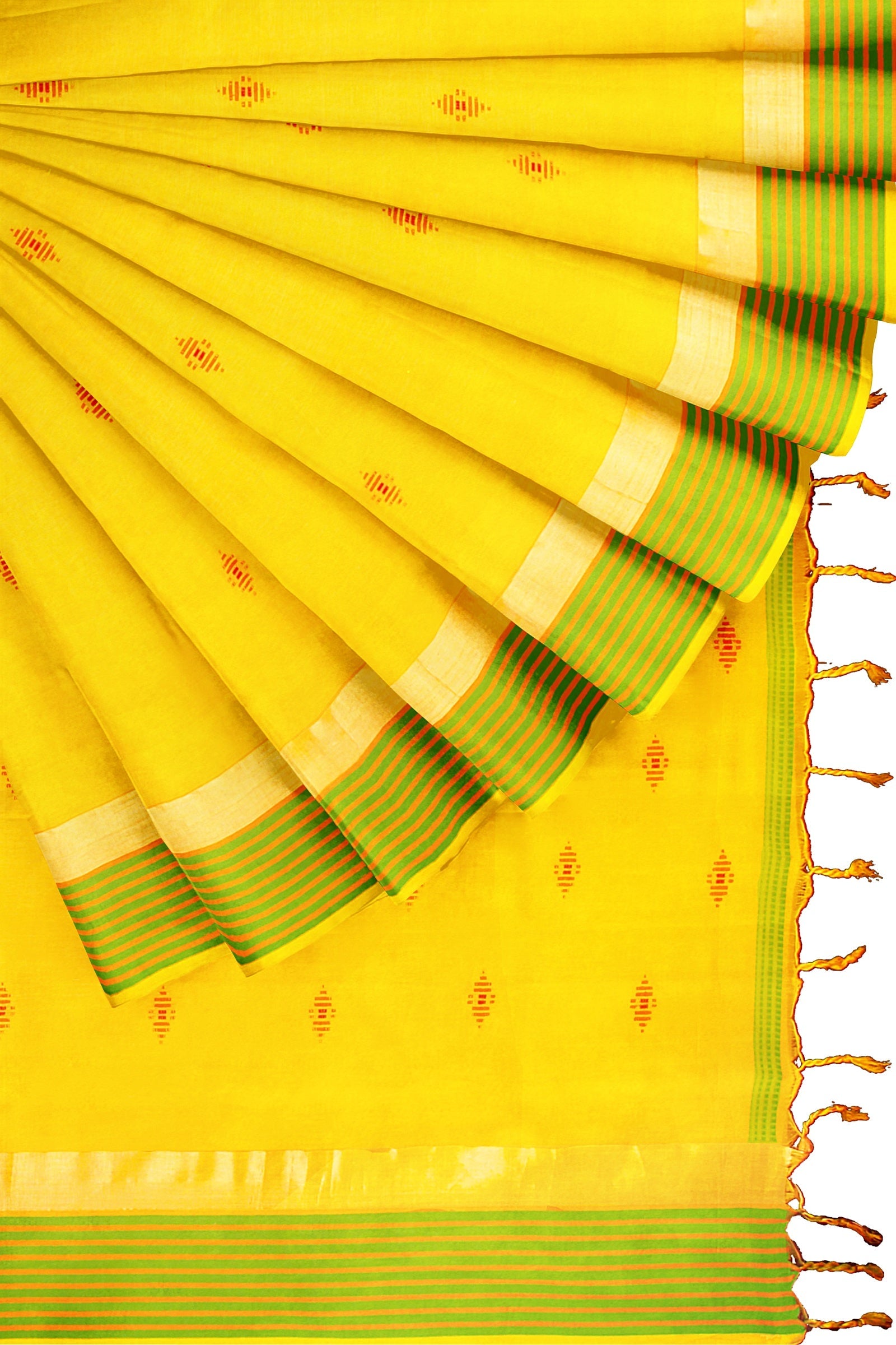 Yellow Saree with Golden Zari, Orange and Green Border and Red and Orange Butis