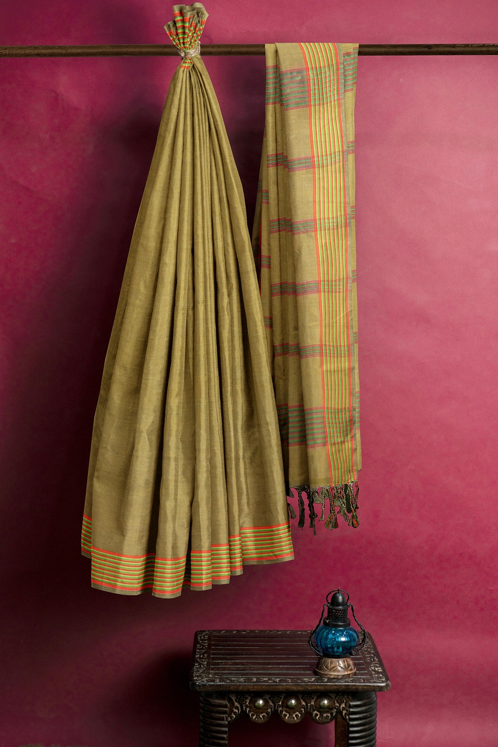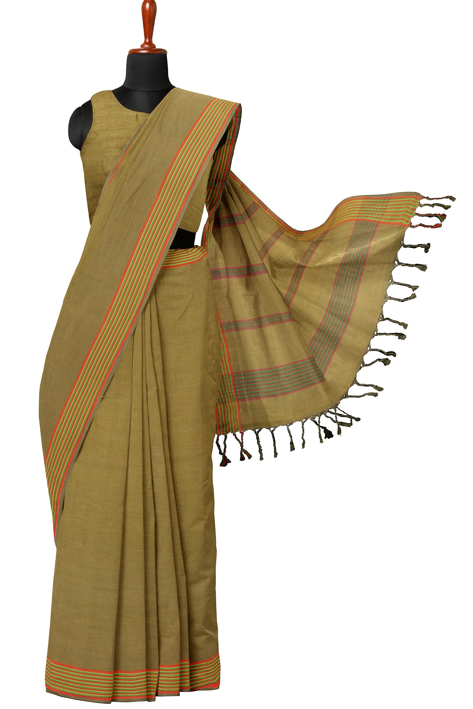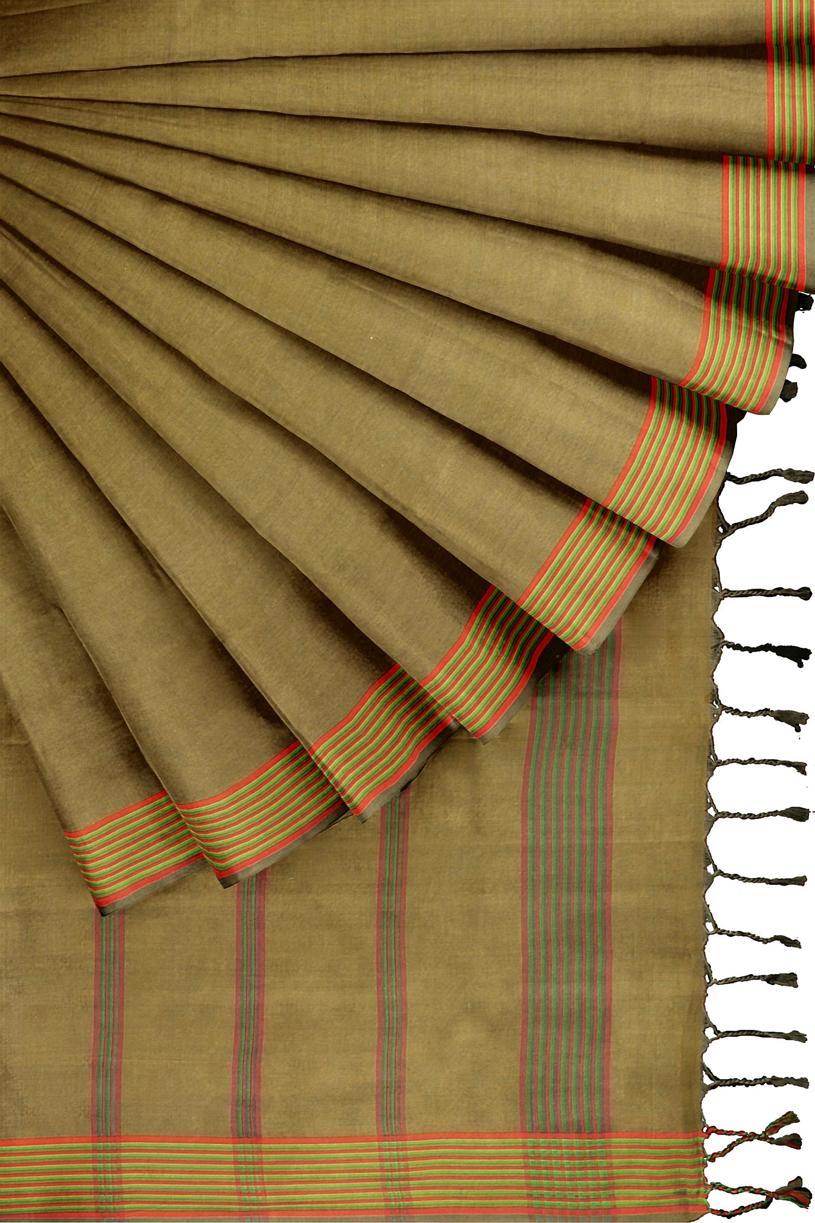 Olive Green Saree with Yellow, Green and Orange Border