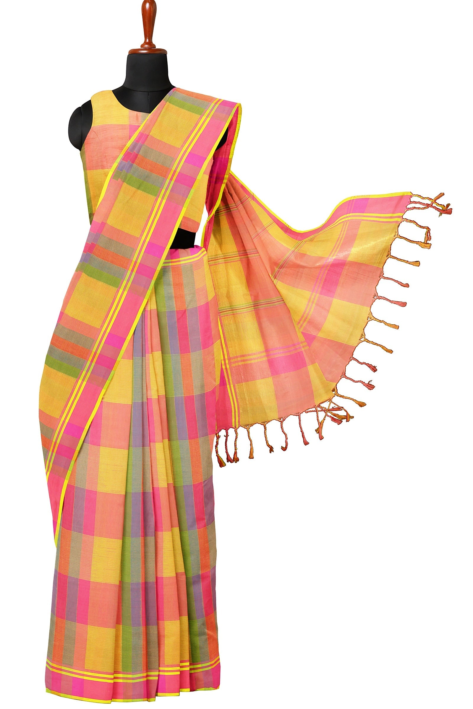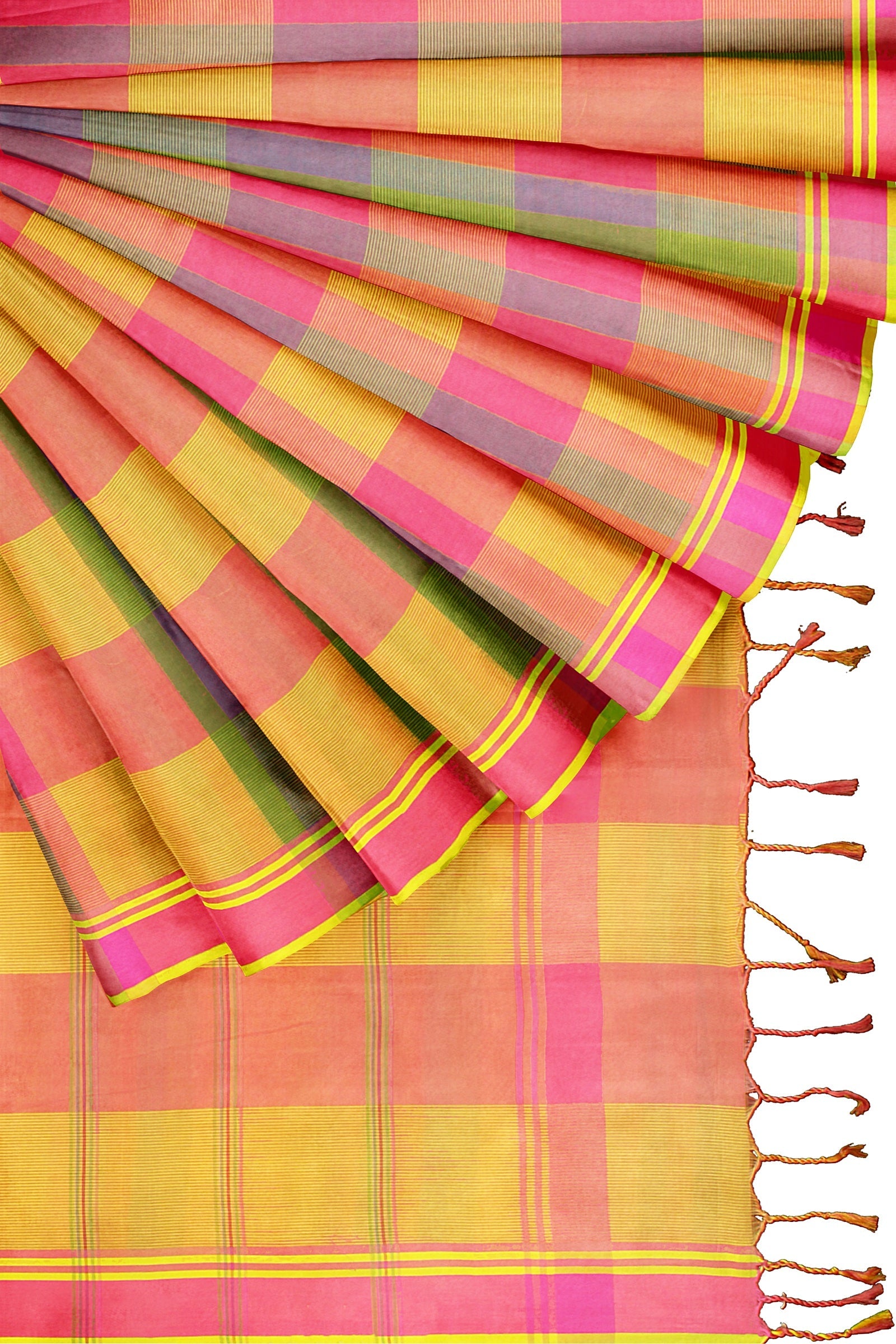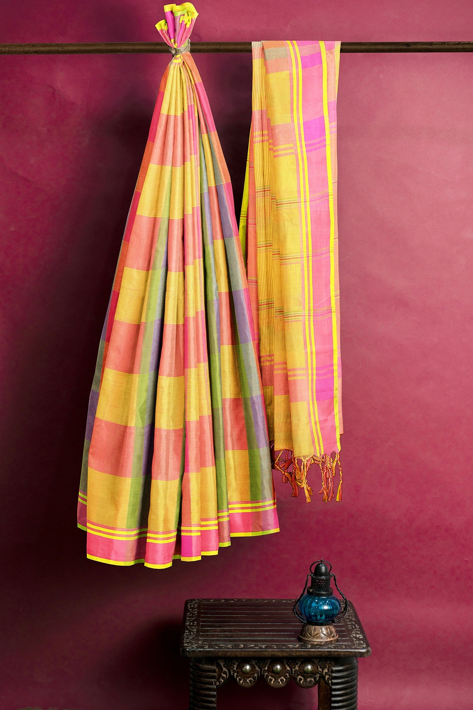 Yellow and Magenta Lining Multi Colour Check Saree with Same Border