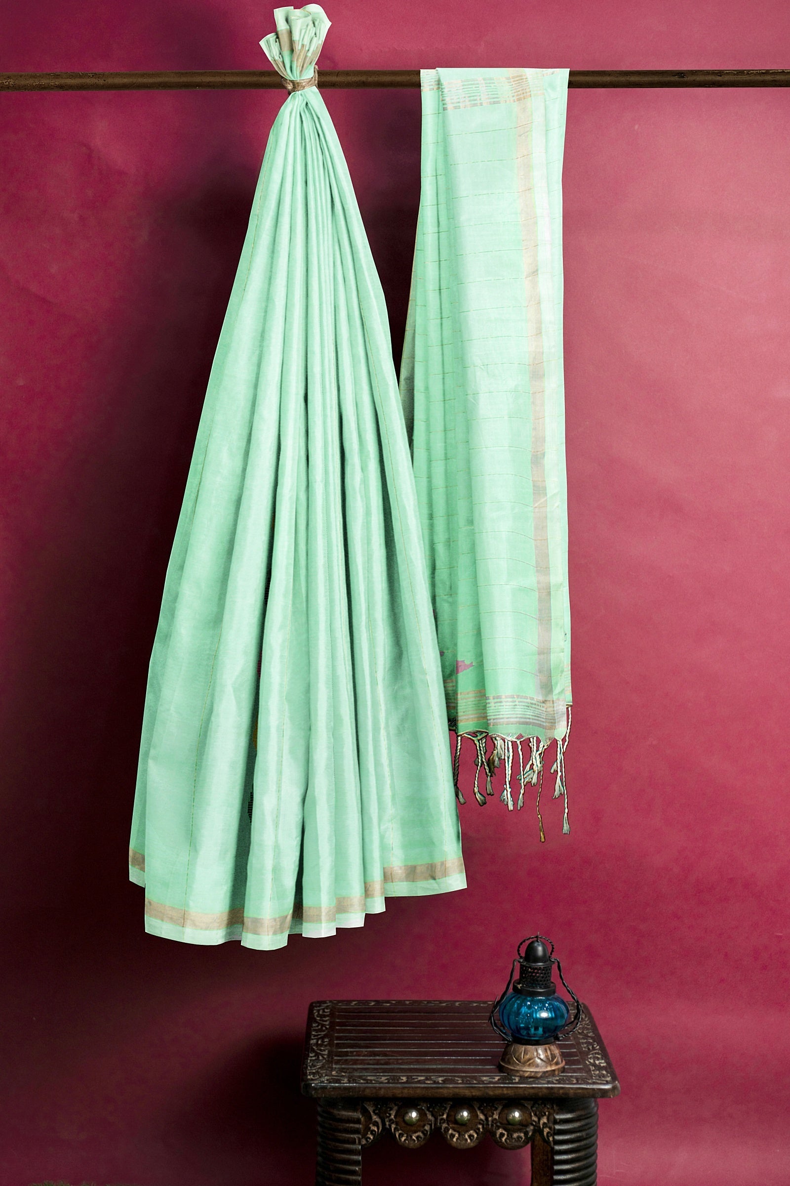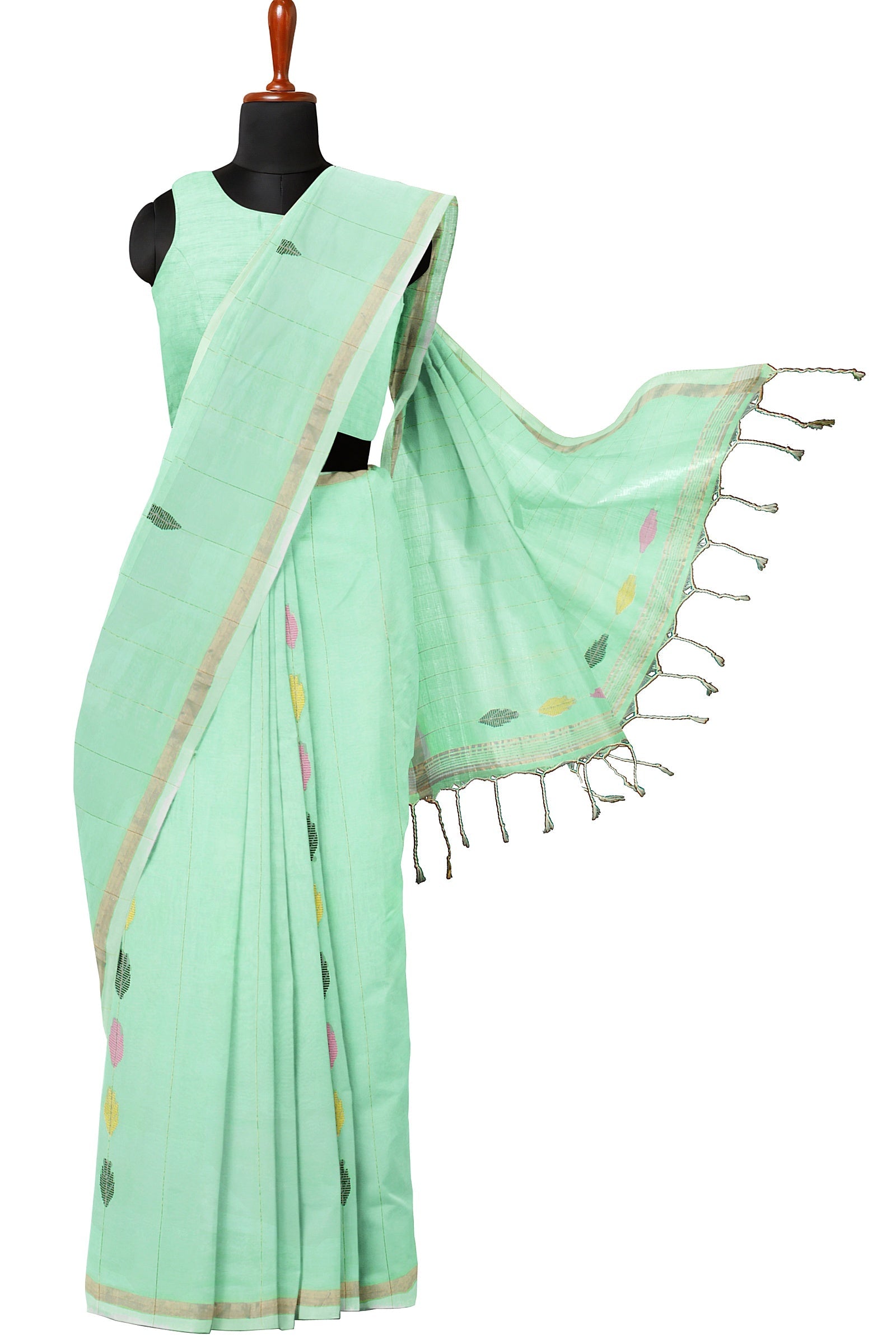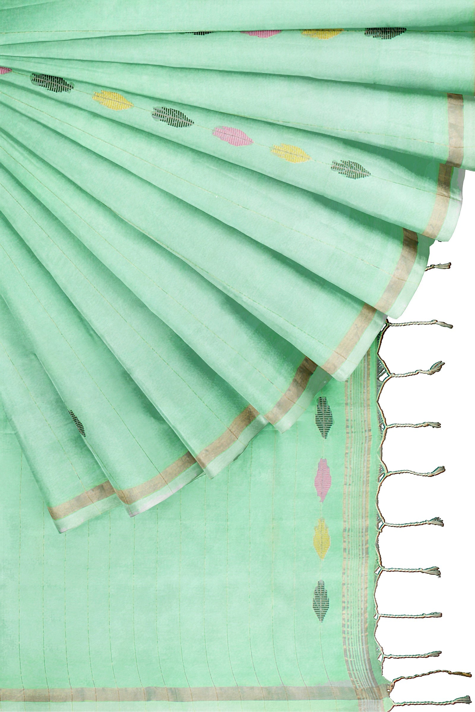 Aquamarine Green Saree with Golden Zari Linings and Border and Multi Colour Butis