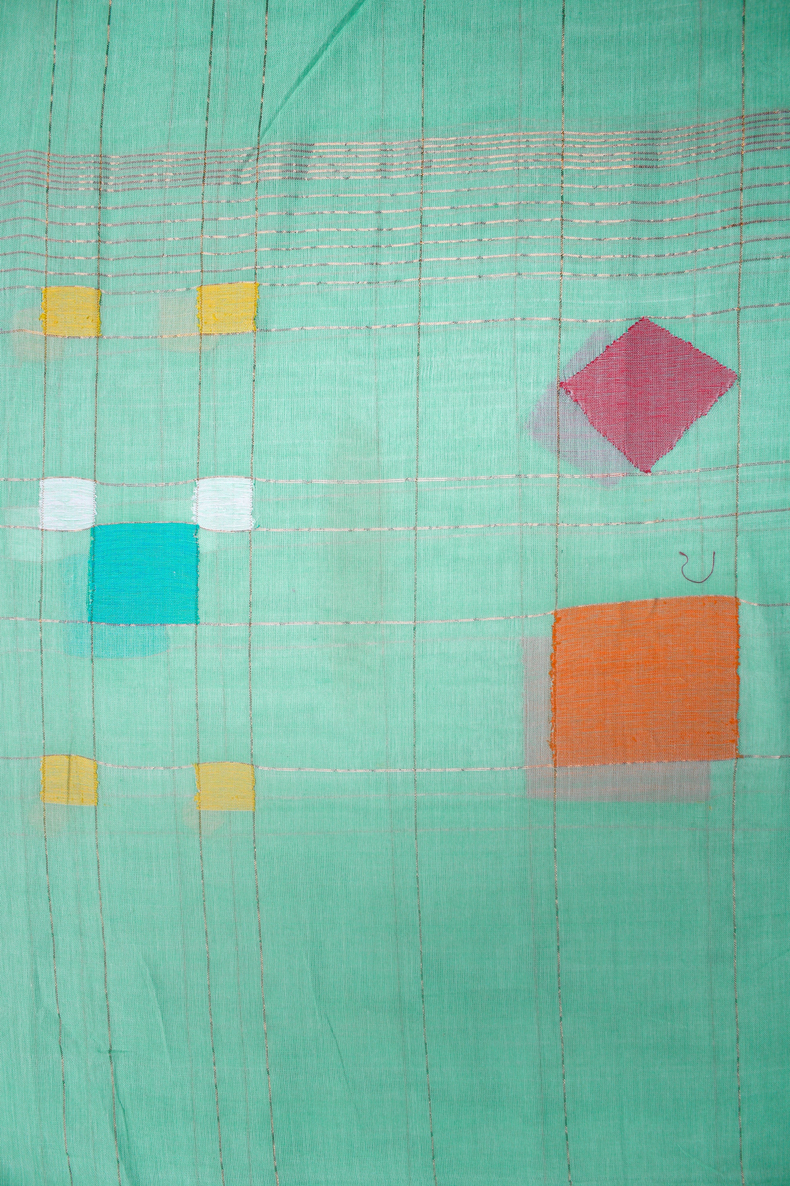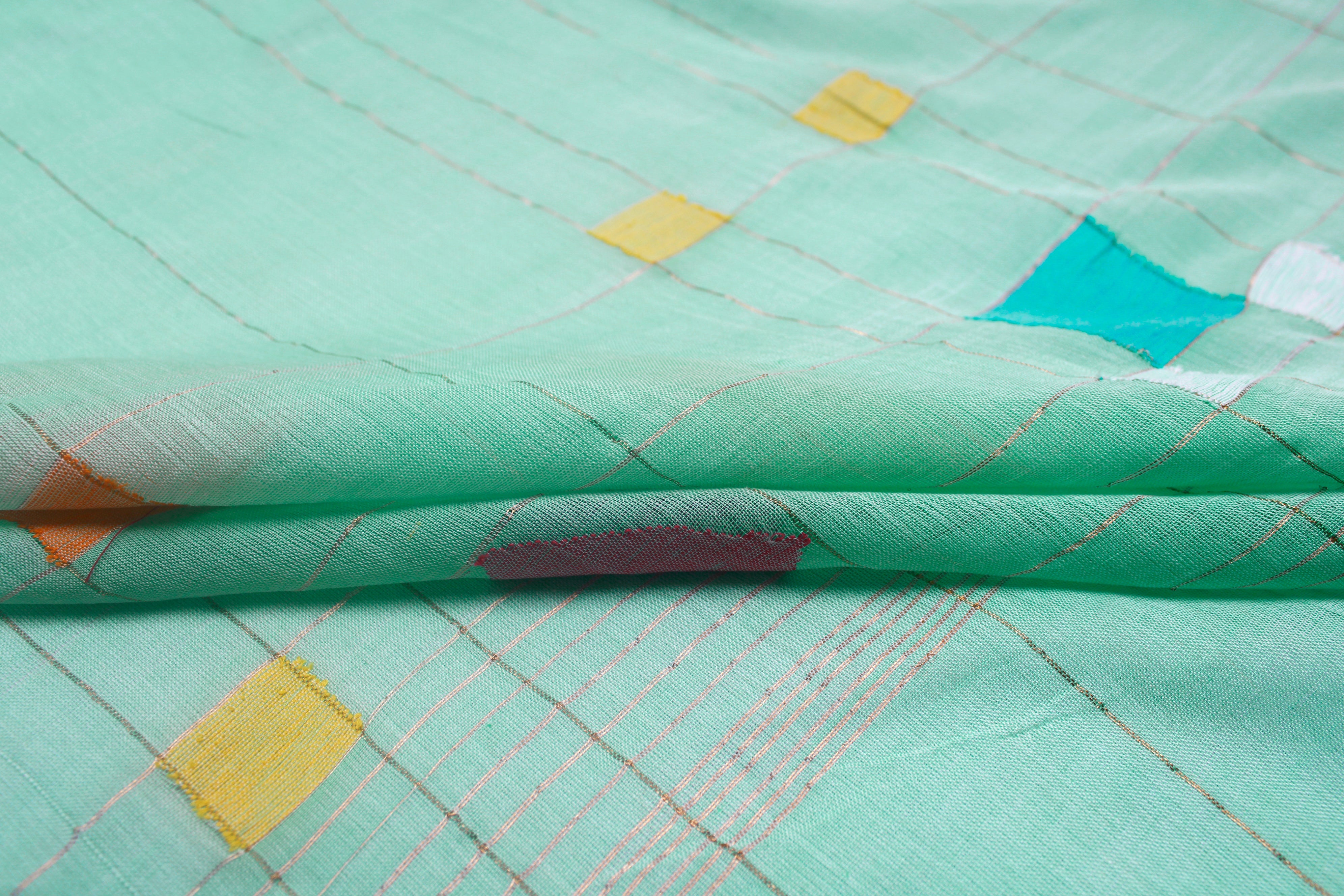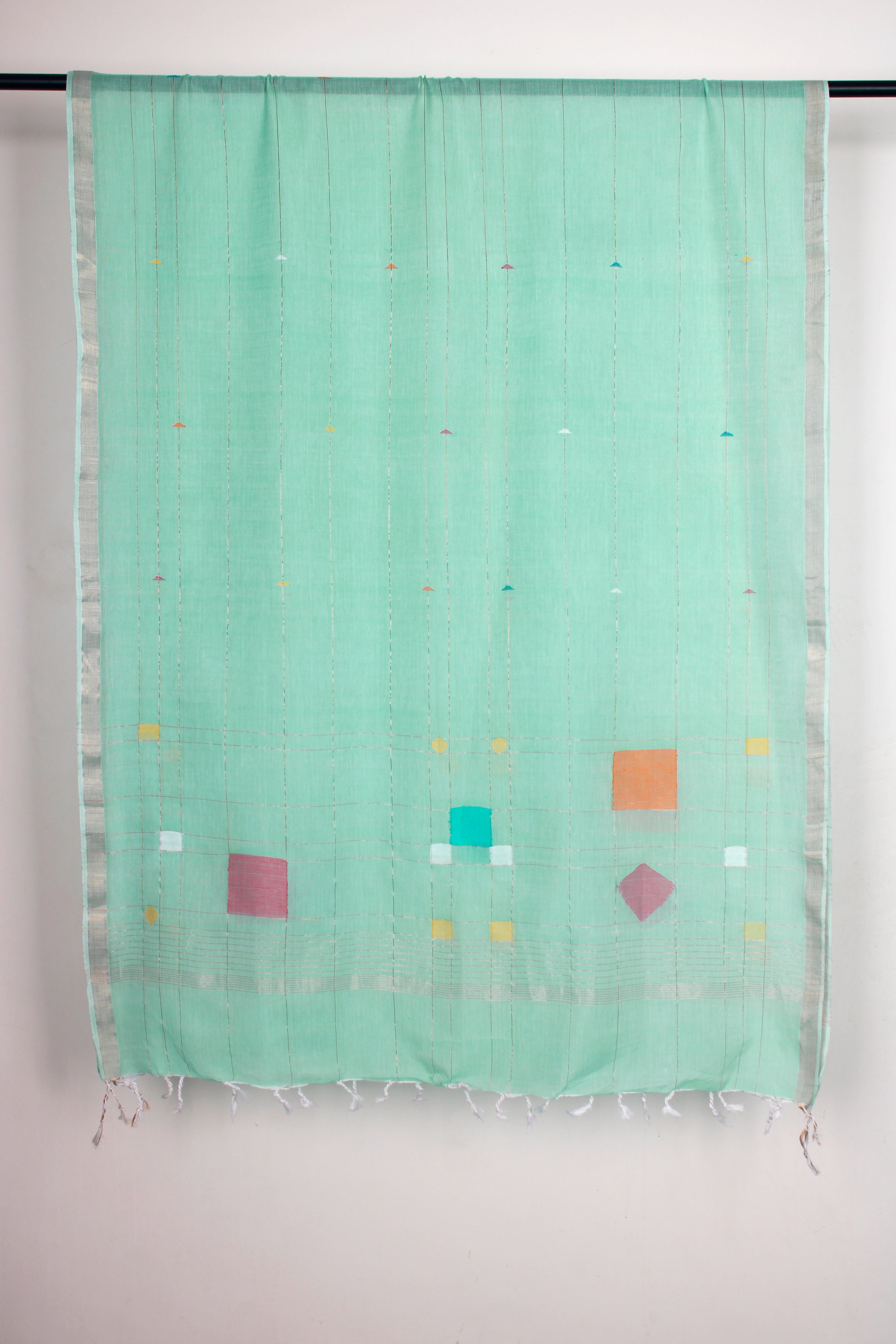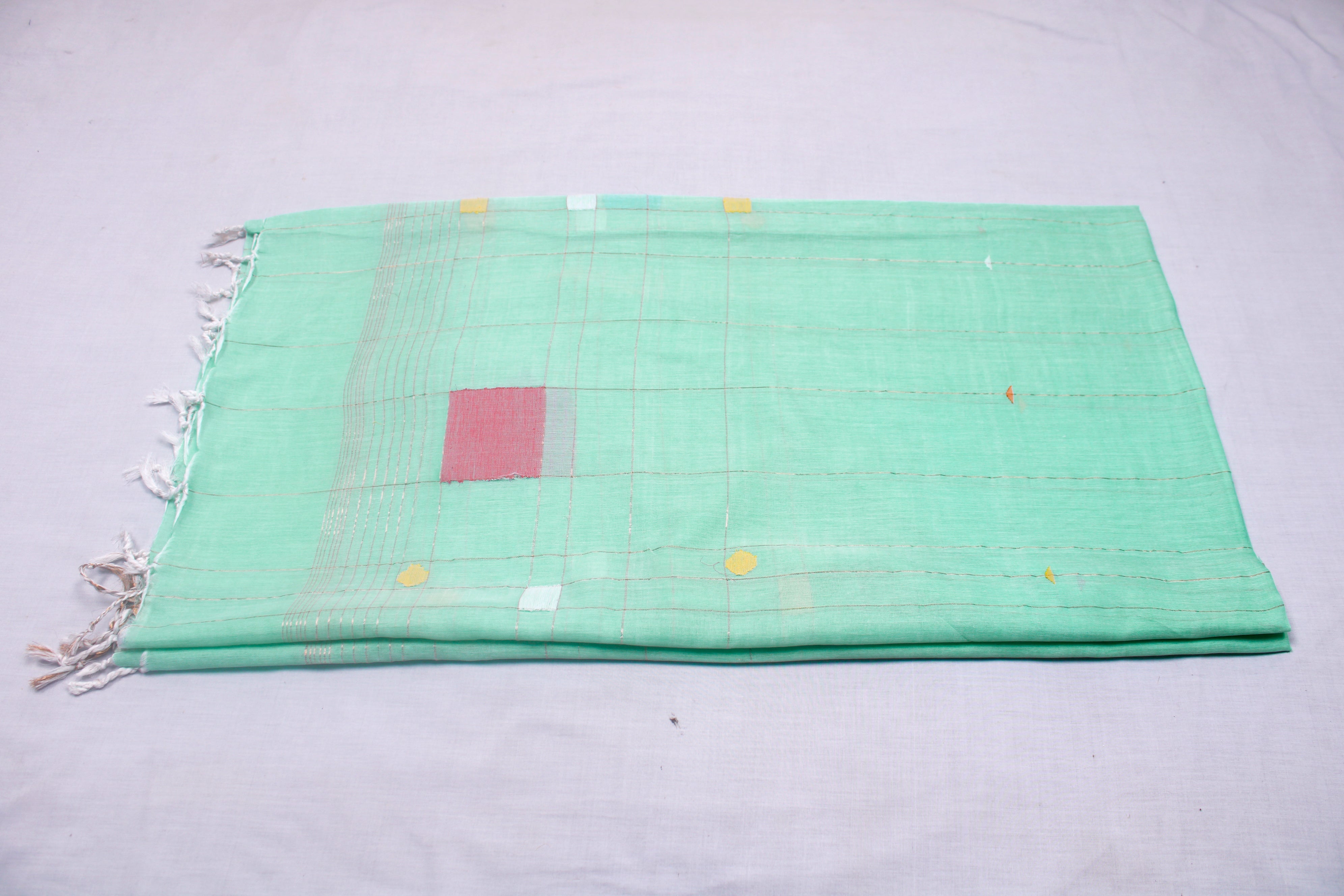 Green and Multi Colour Jamdani Dupatta with Golden Zari Linings and Border