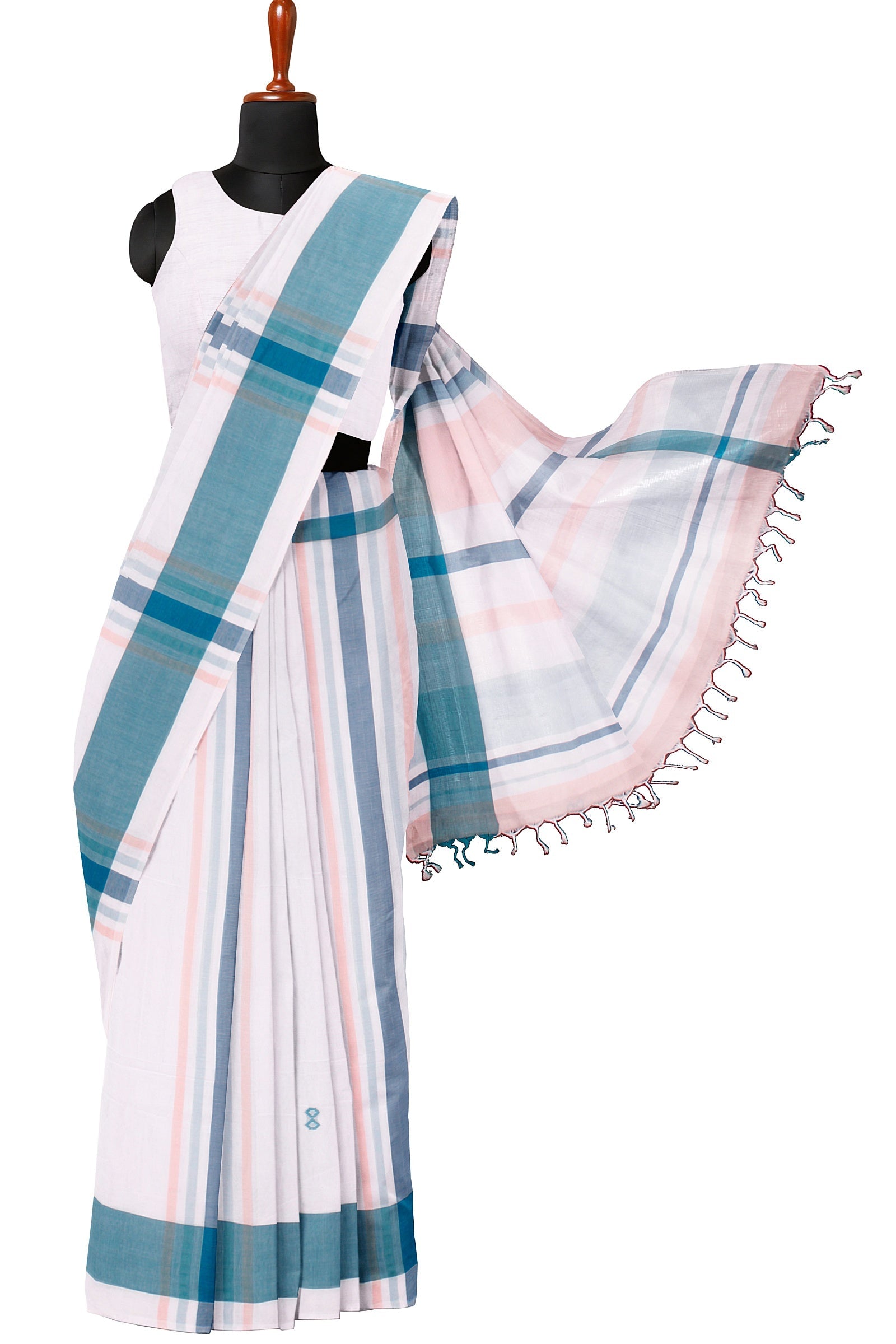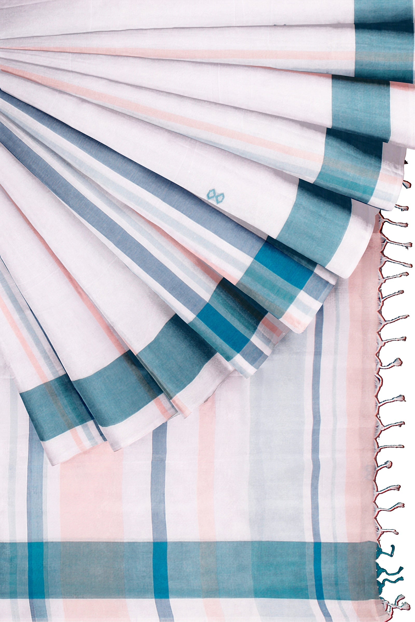 Cream and Blue Striped White Saree with Cerulean Green Border and Butis