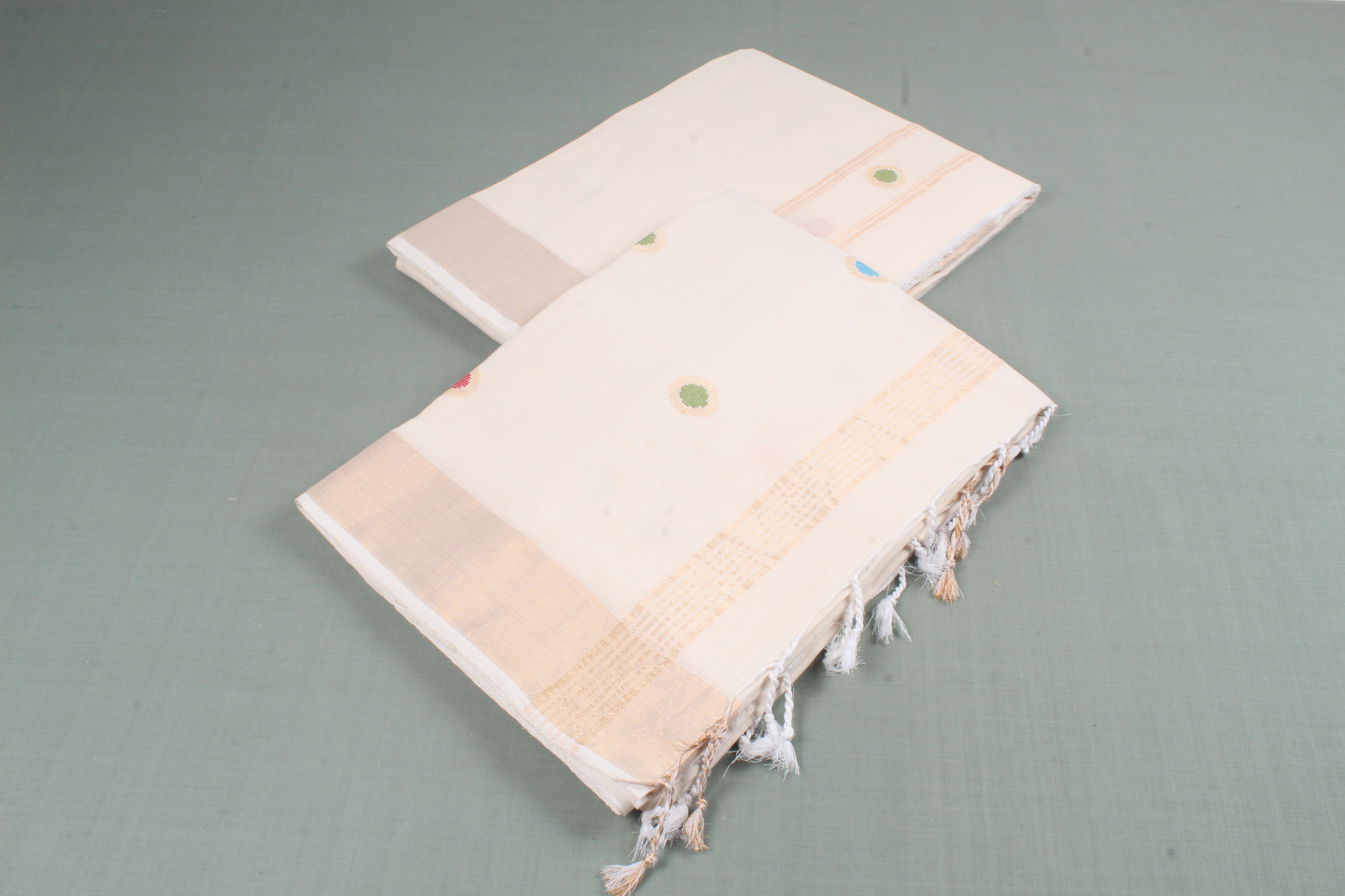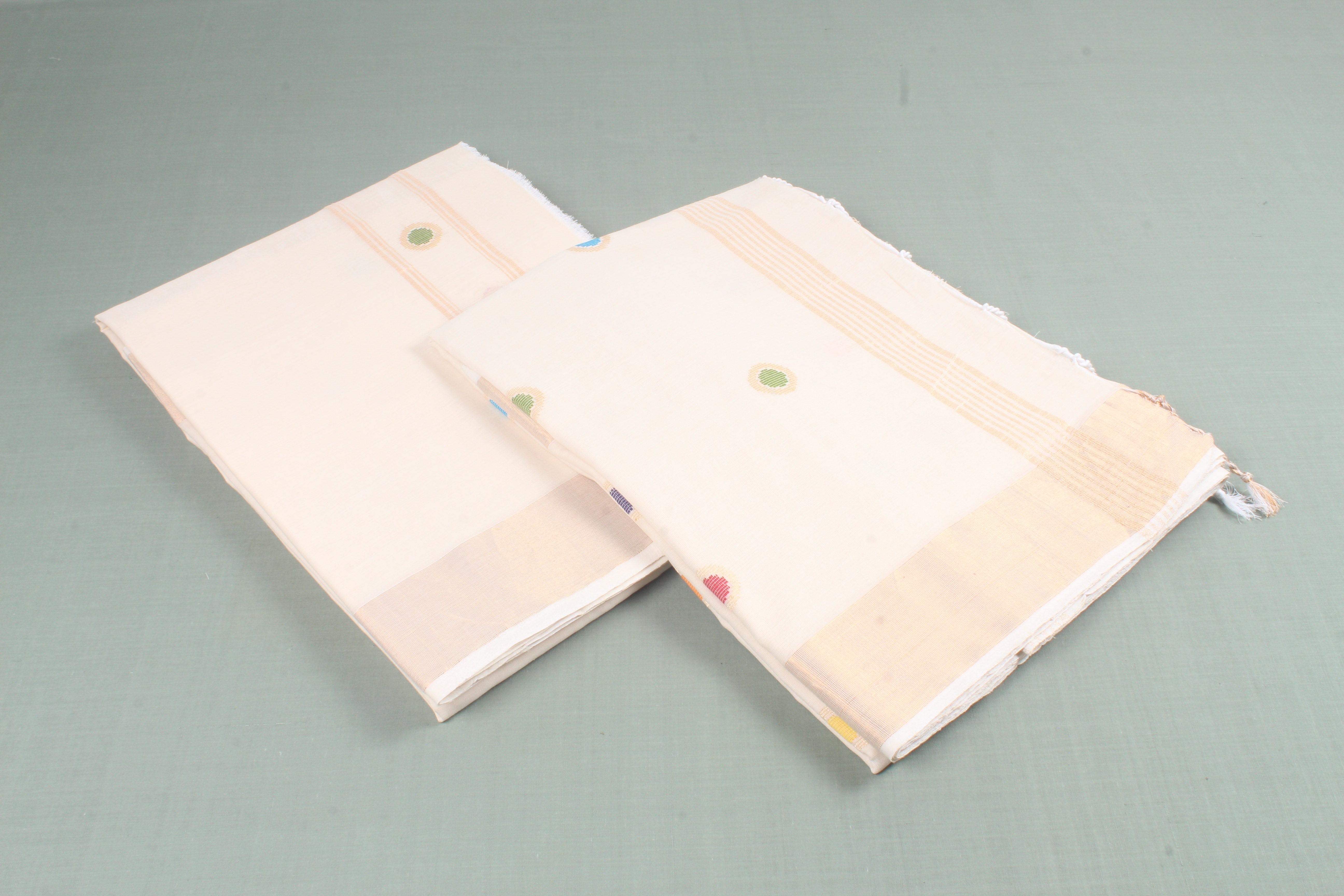 Traditional Handloom Joda Set in Cream with Buti and Goldan Zari Border.
