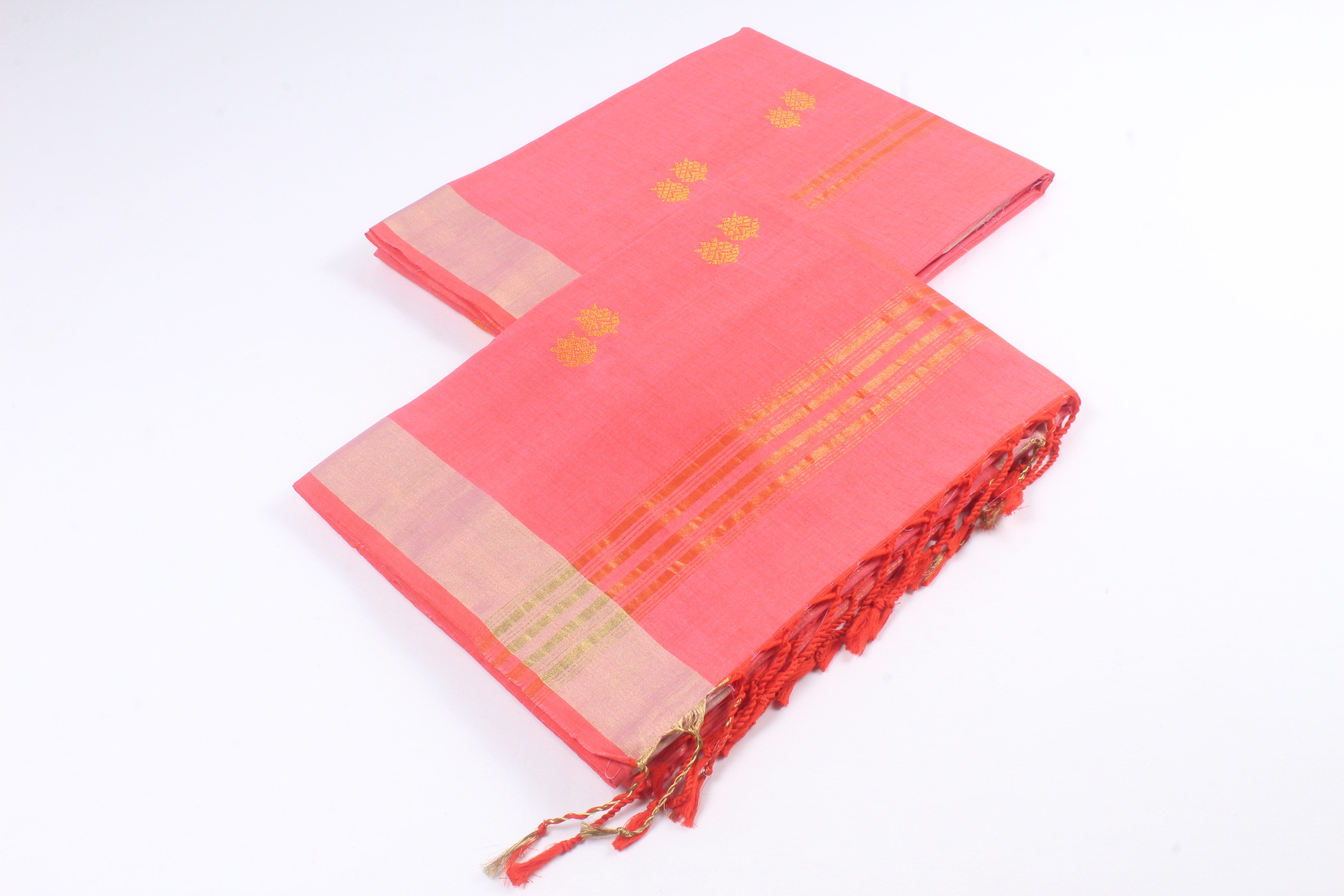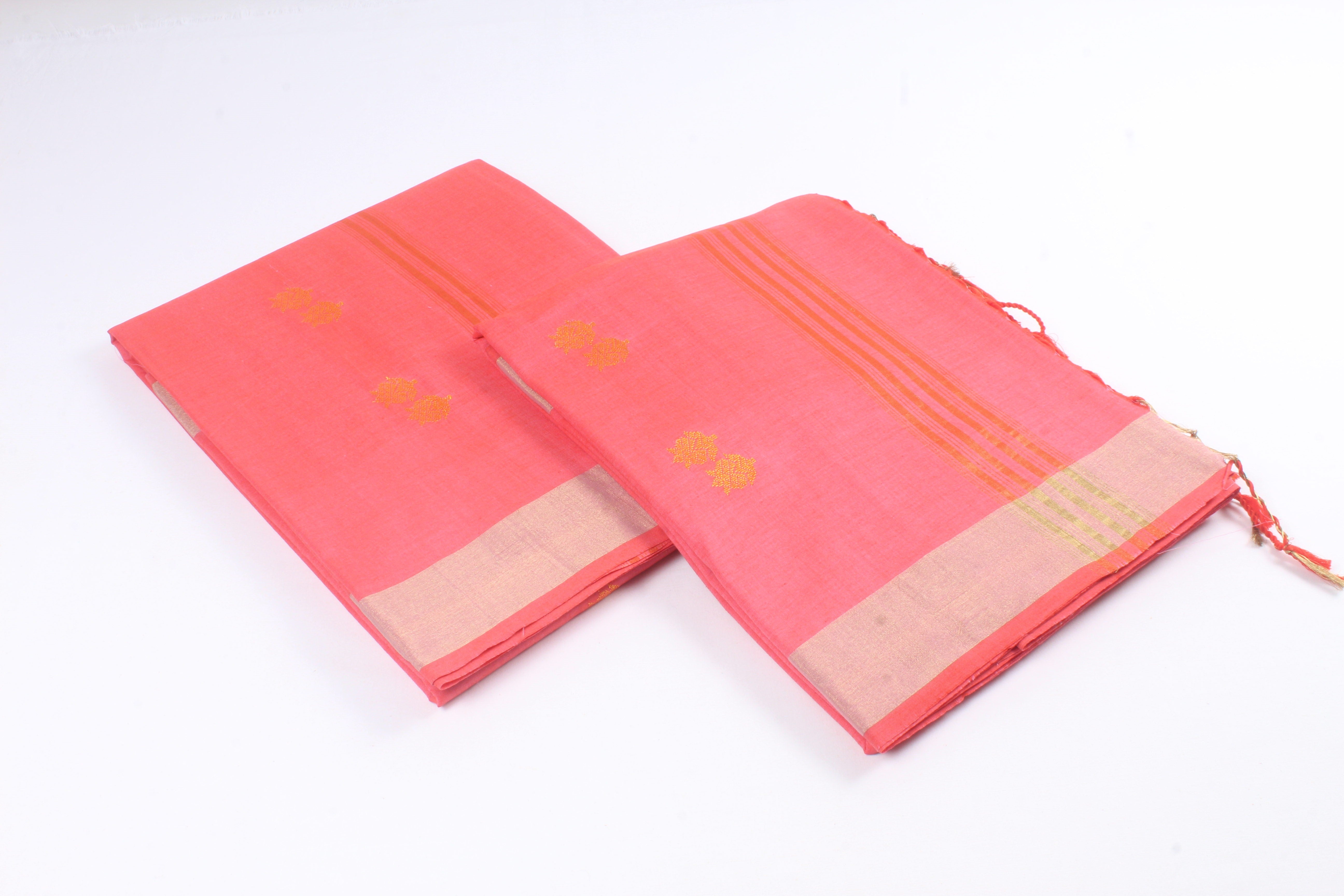 Traditional Handloom Joda Set in Coral with Butis and Goldan Zari Border