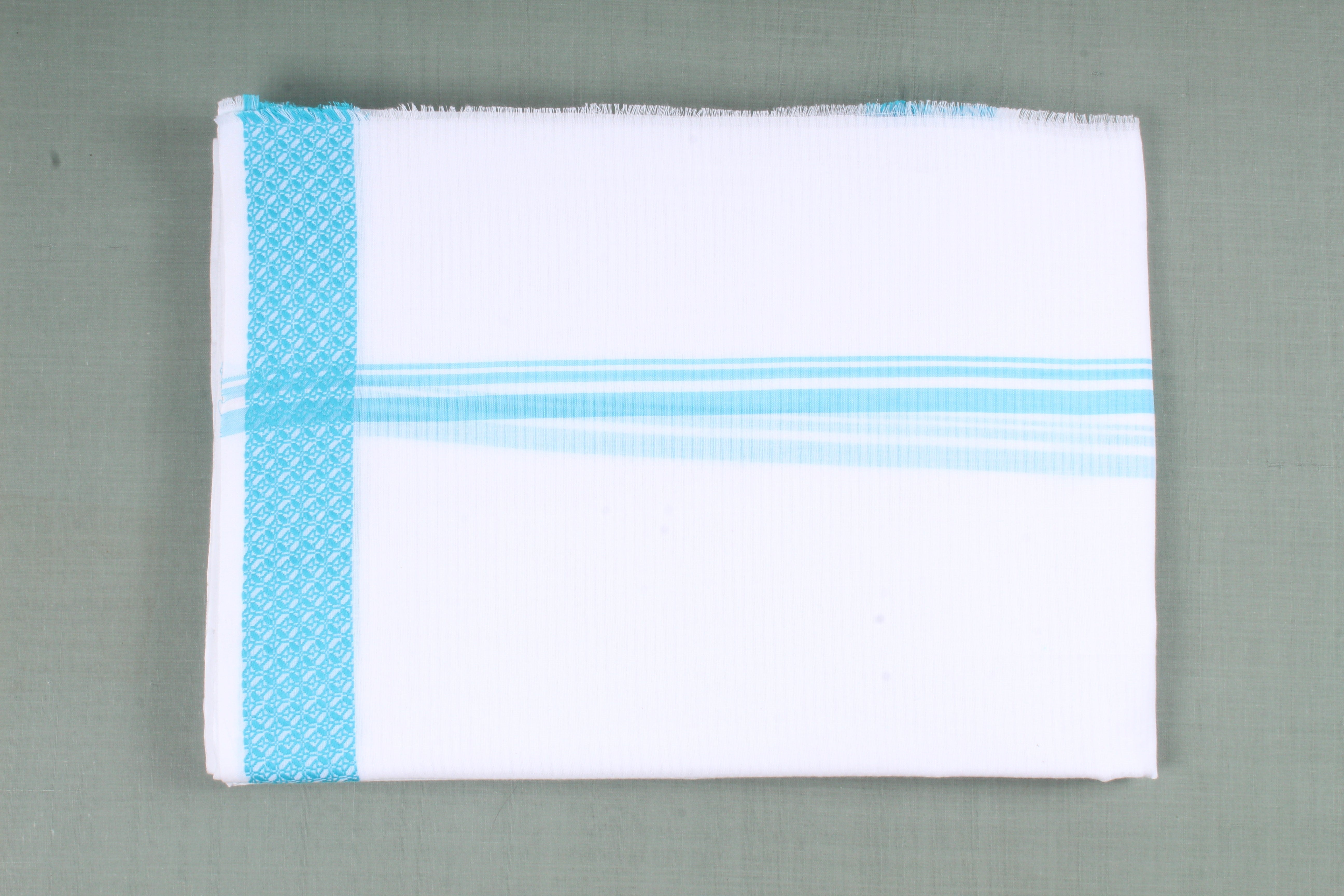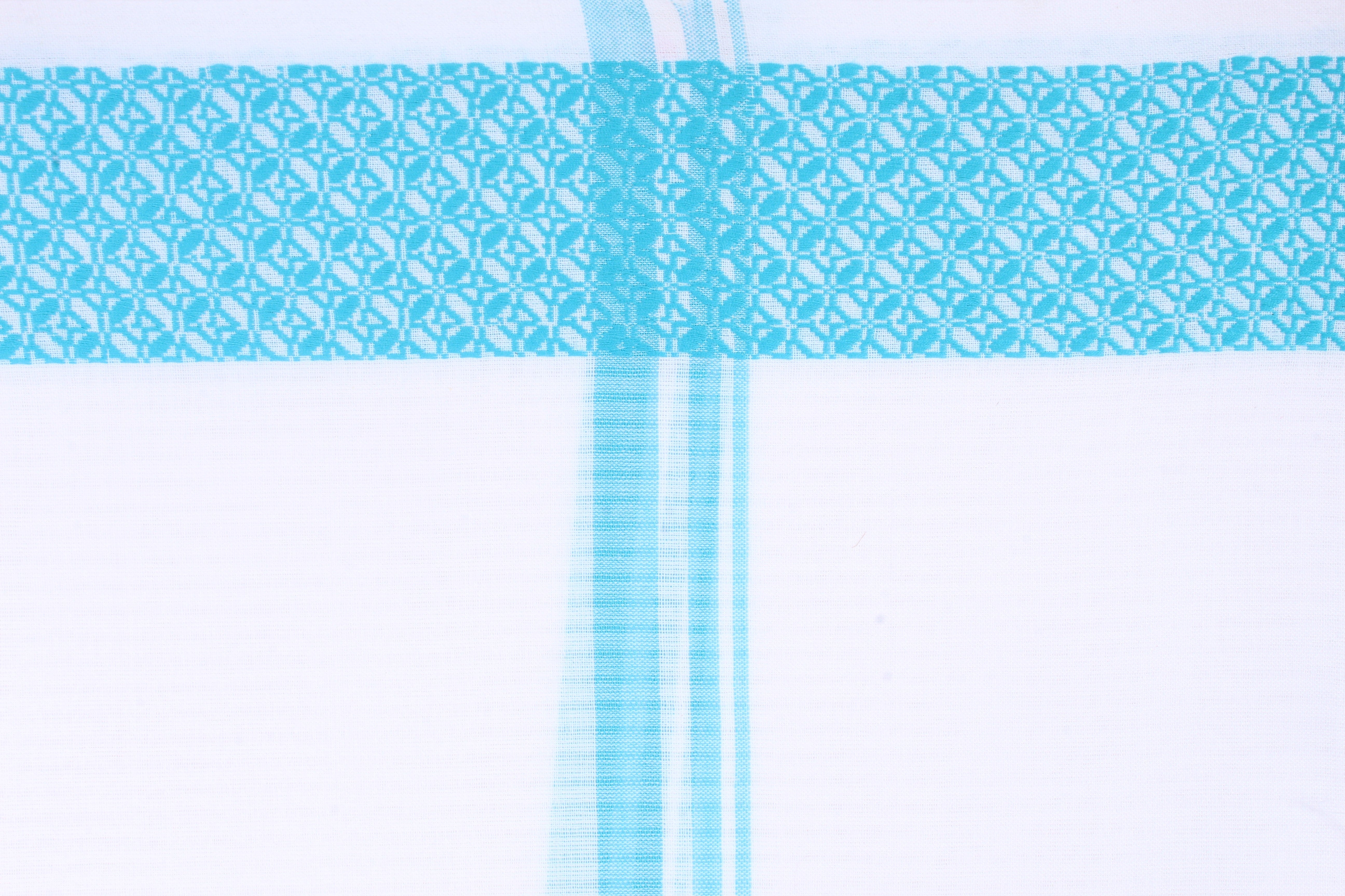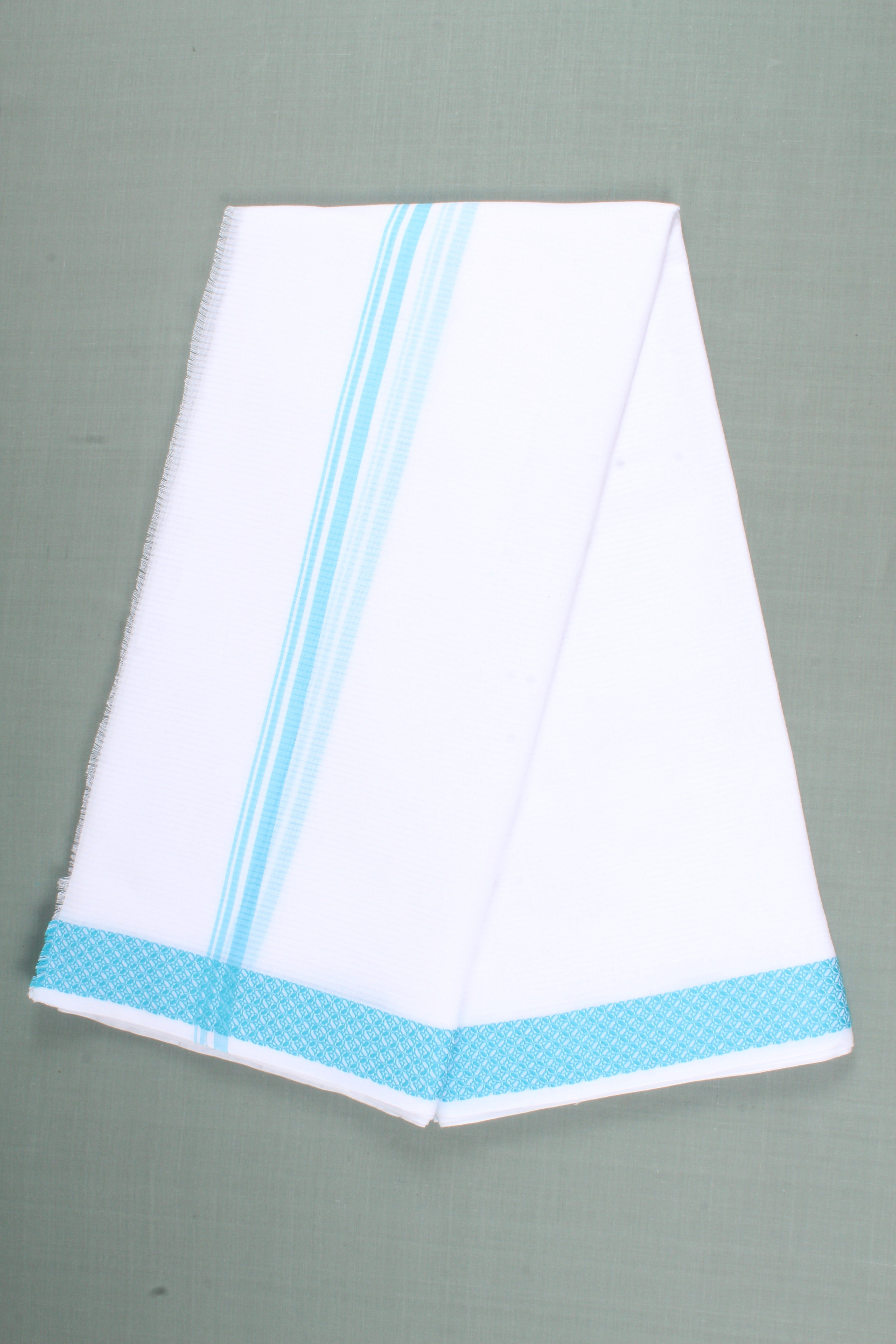 • White Dhoti Dupatta with Sky Blue Dobby Border
