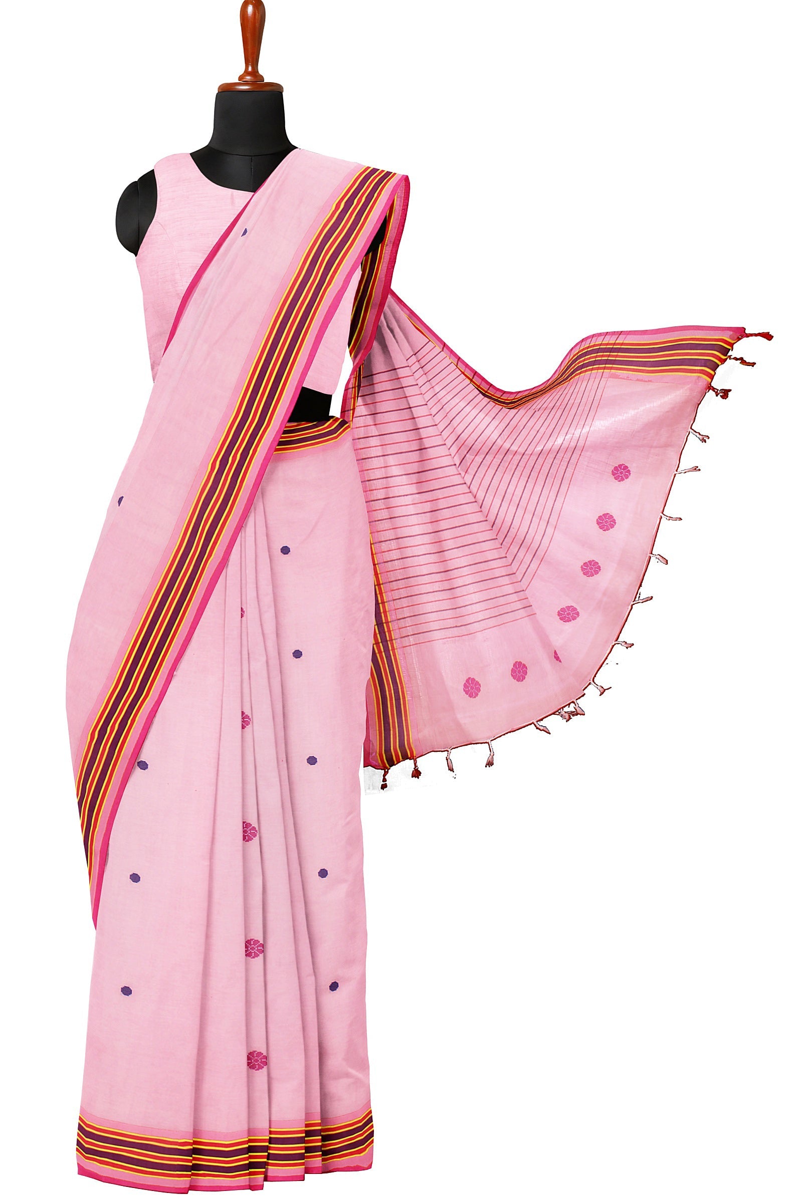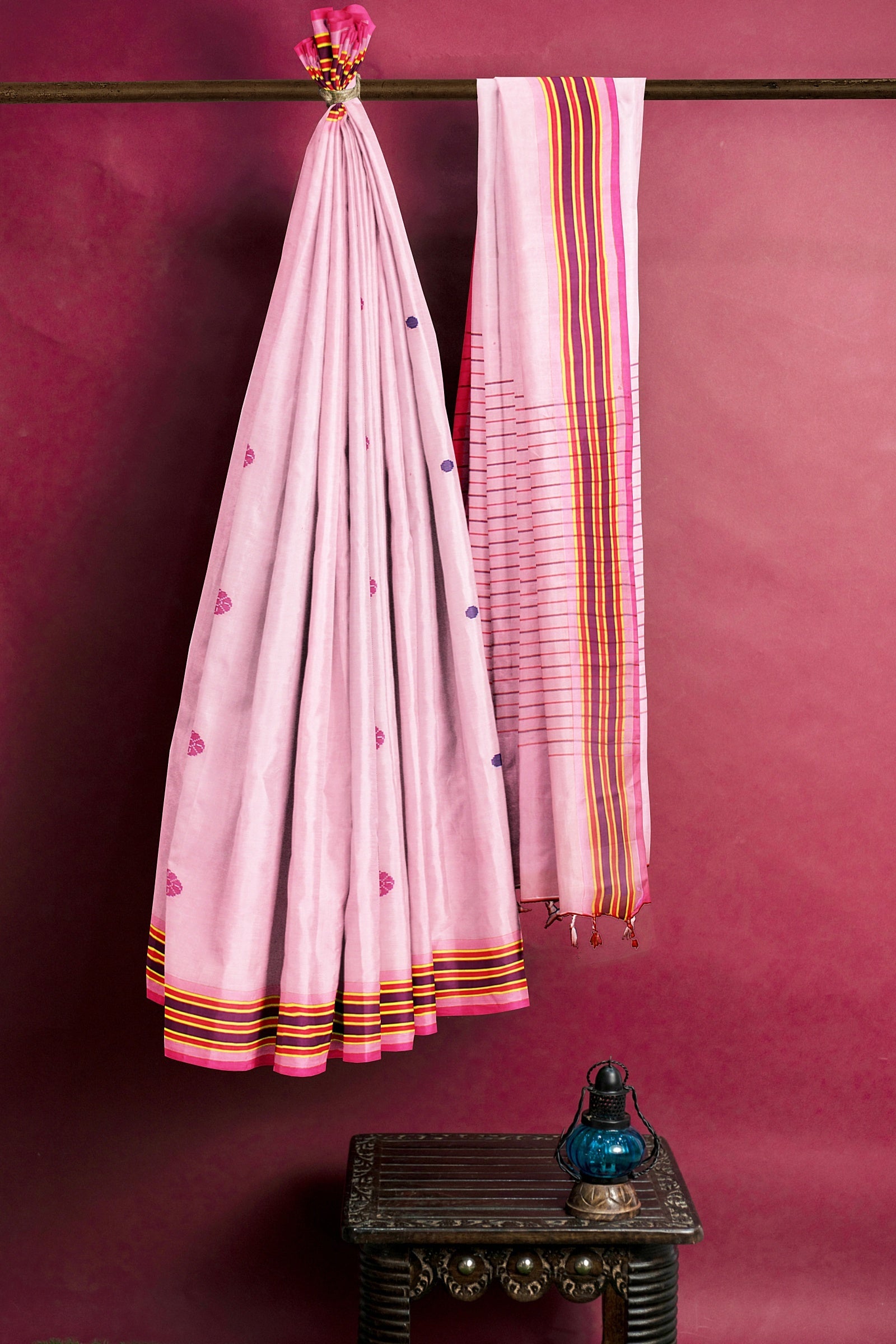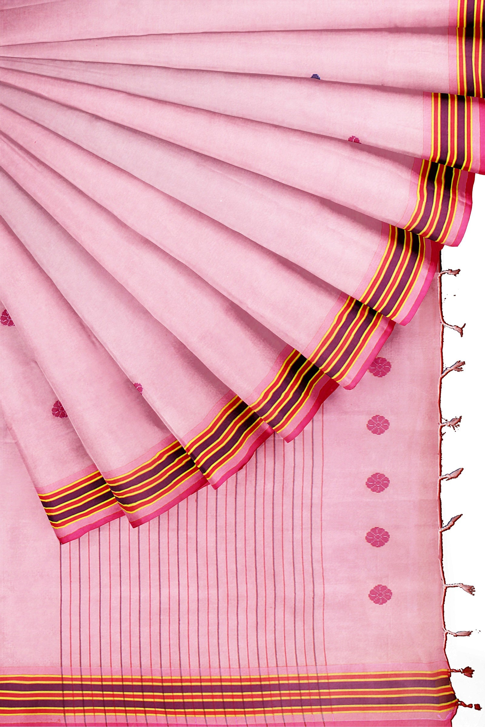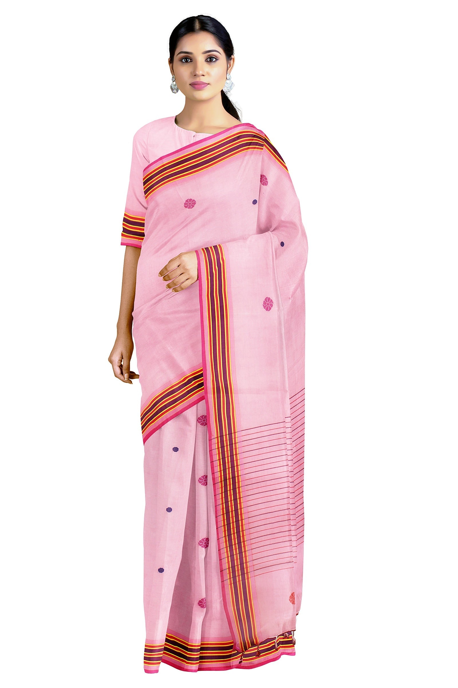 Pink Saree with Yellow, Magenta and Blue Border and Butis