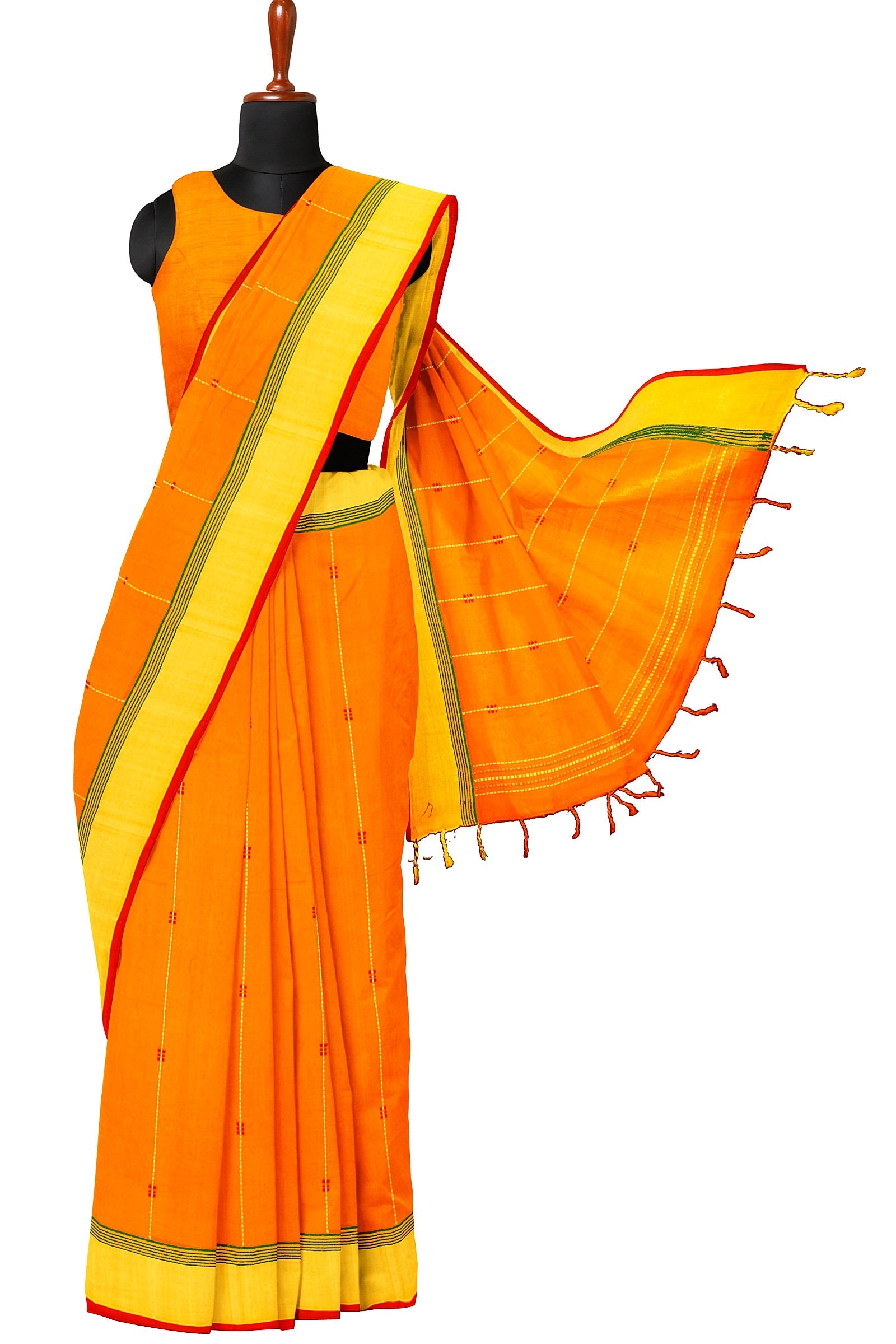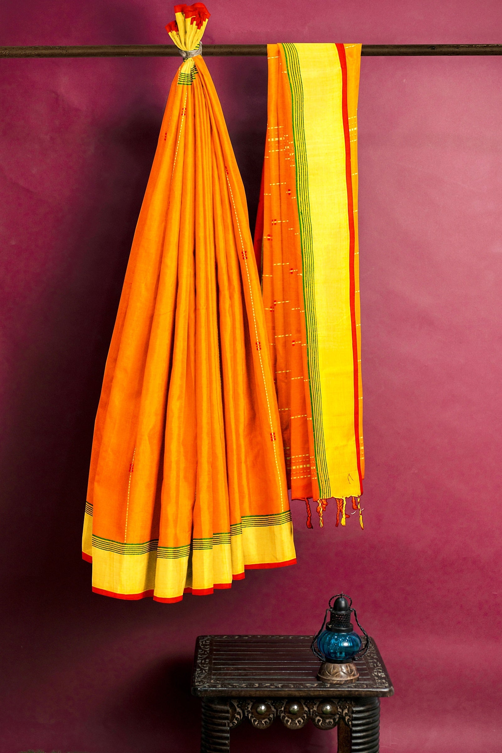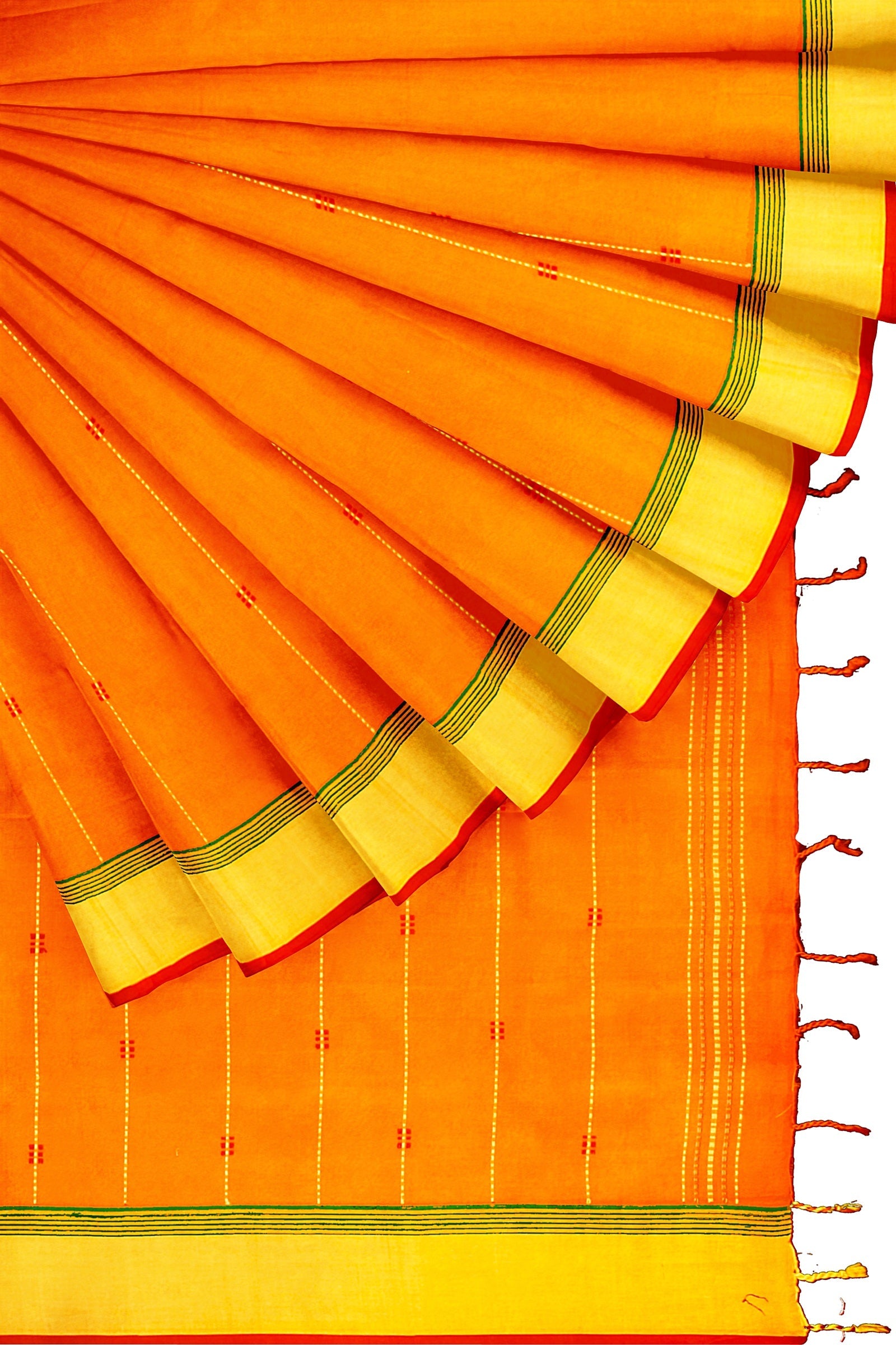 Orange Saree with Green, Yellow and Red Border and Lined Butis