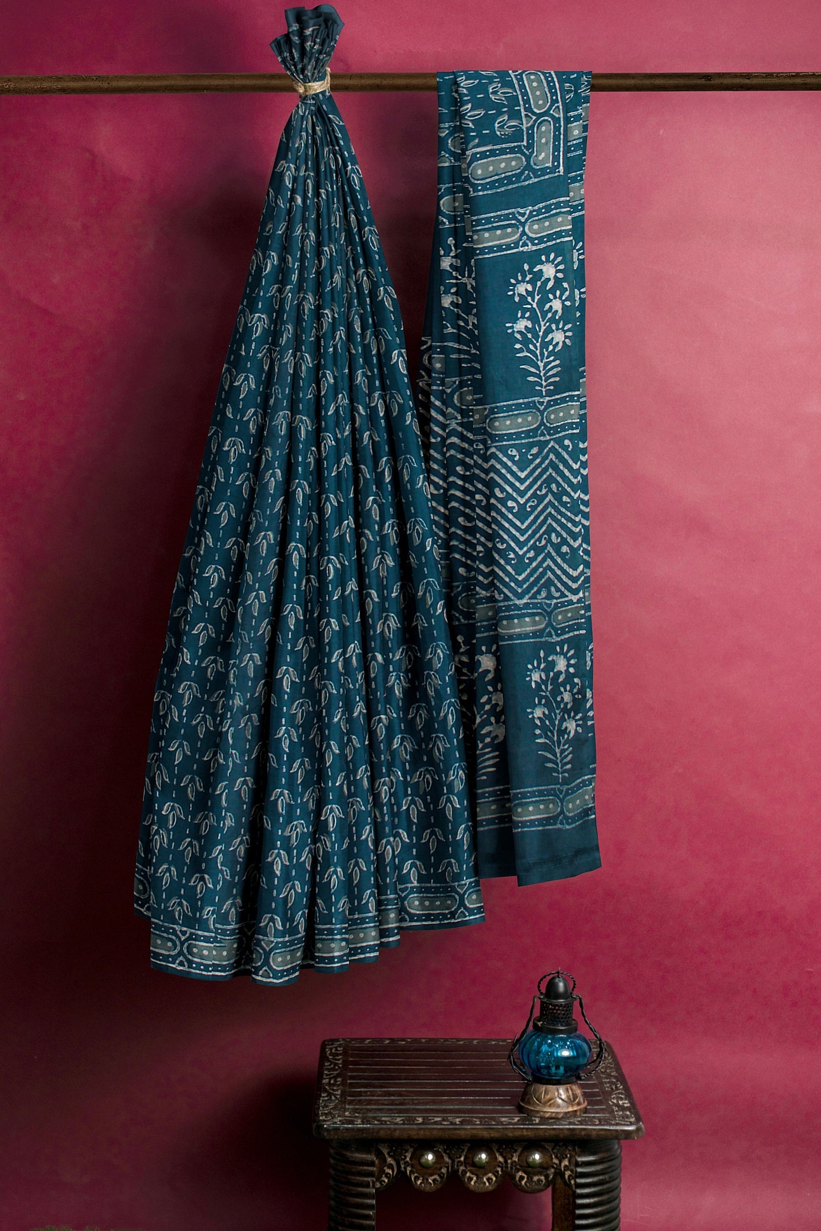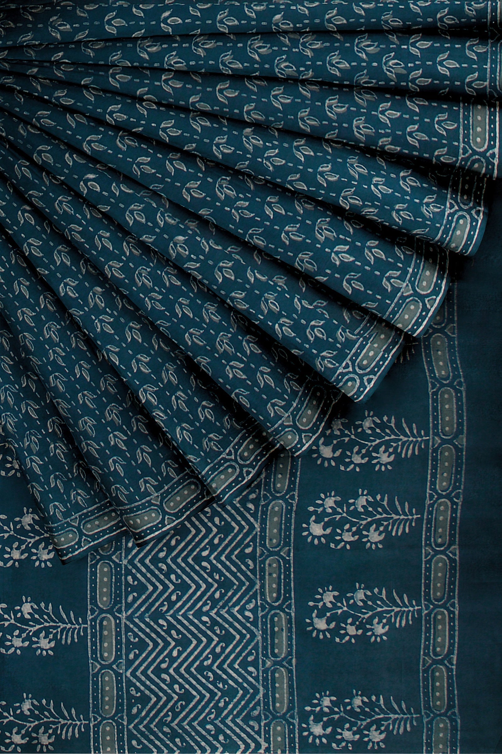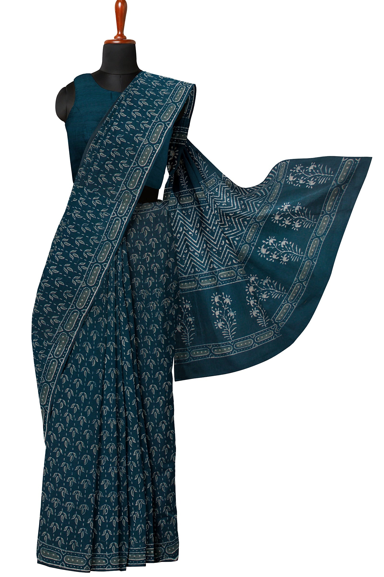 Leaf Patterned Blue, Grey and Off White Dabu Printed Saree