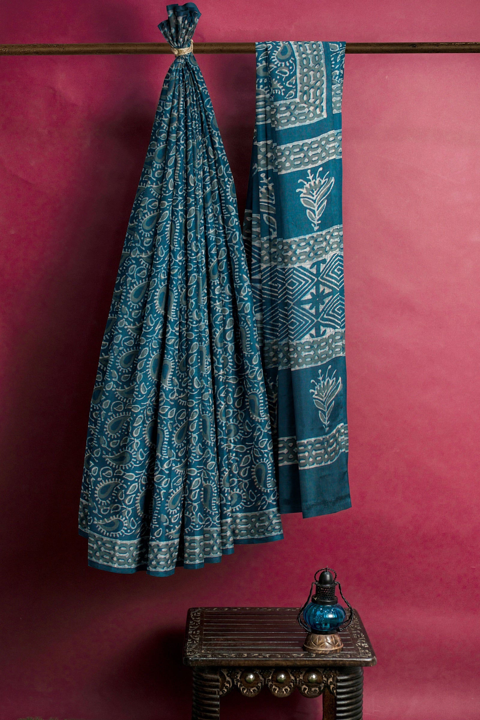 Mango Patterned Blue, Grey and Off White Dabu Printed Saree