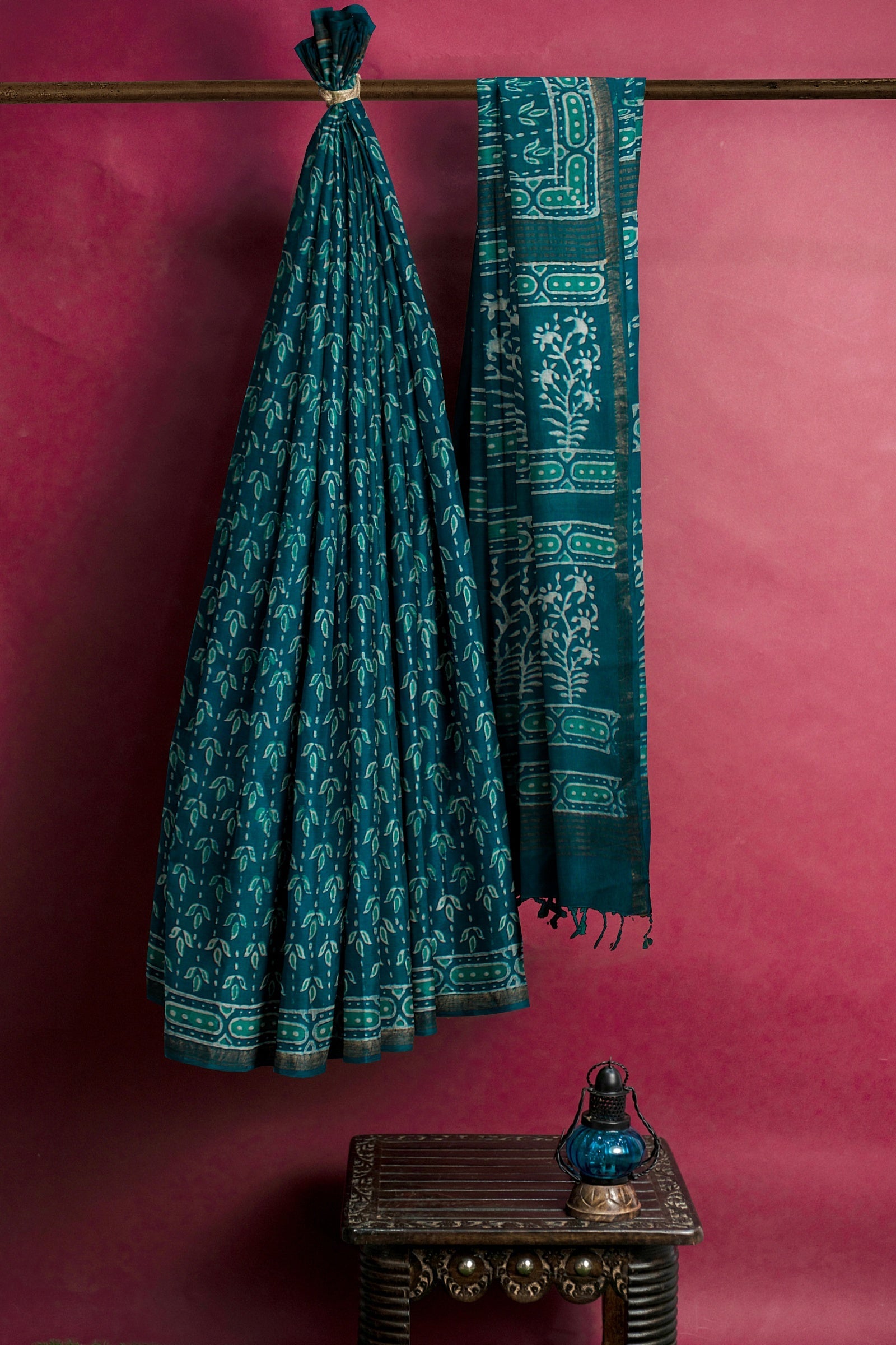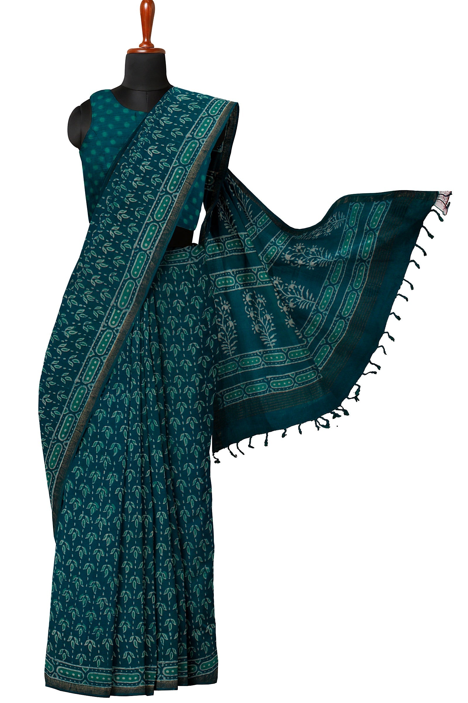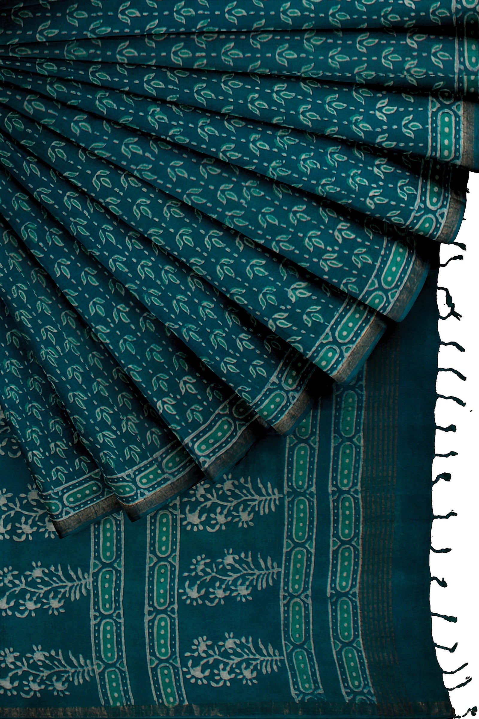 Green, Blue and White Dabu Printed Saree with Golden Zari Border