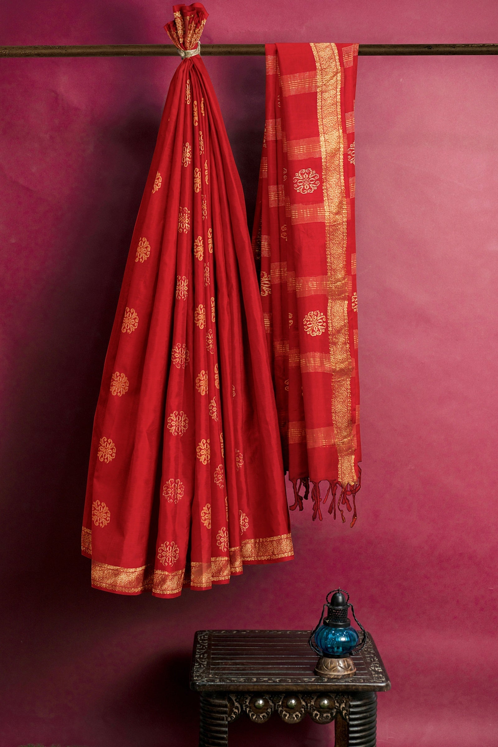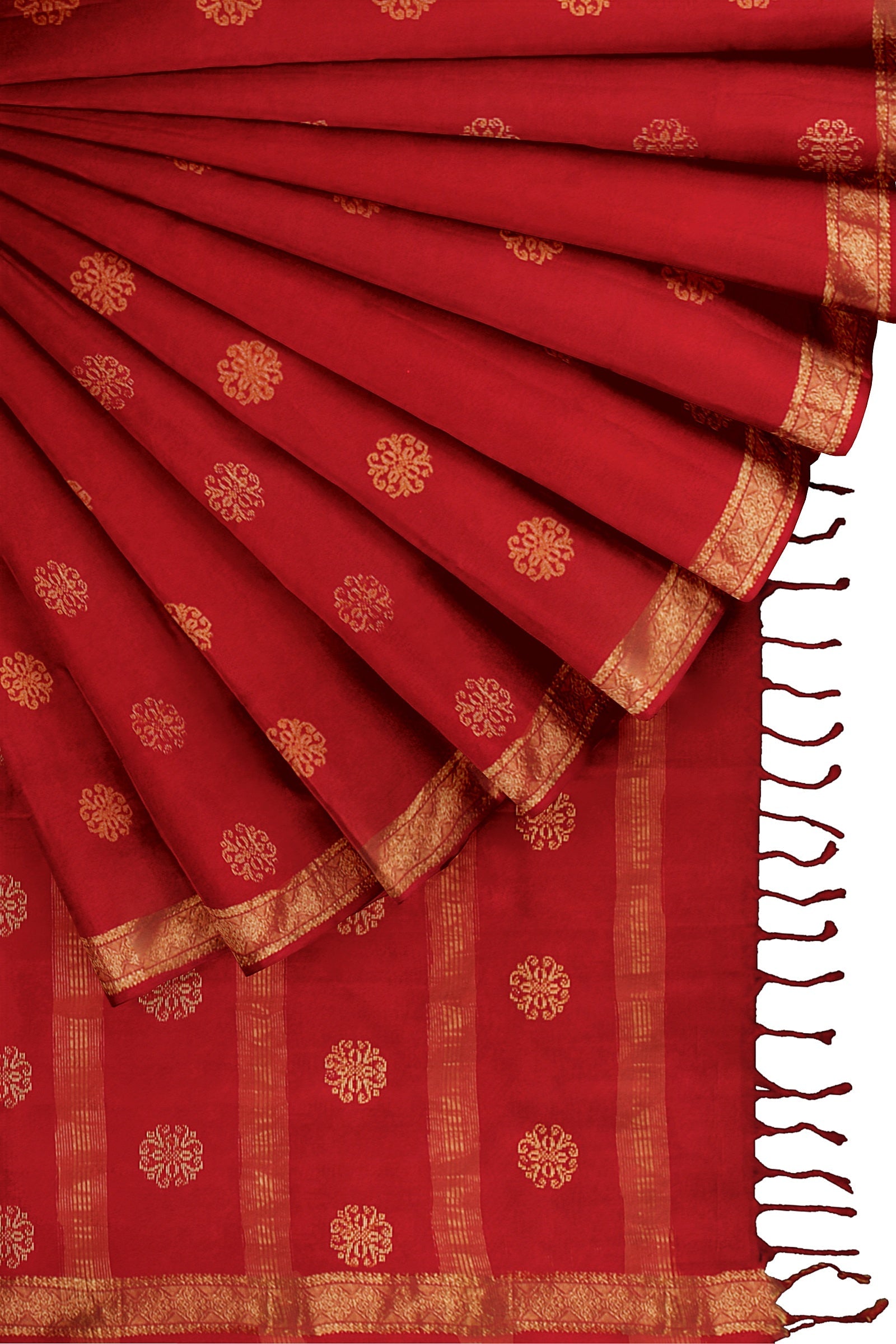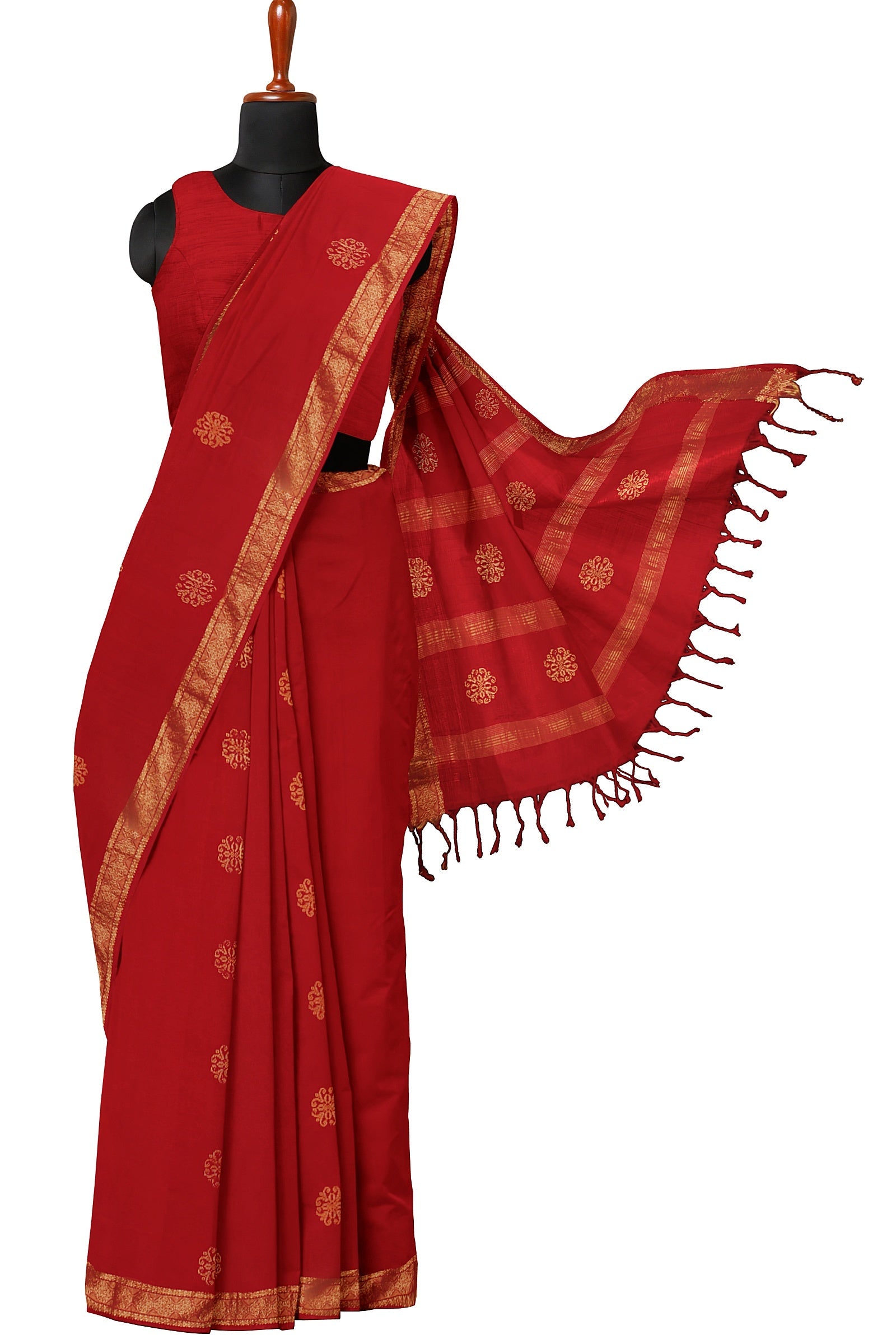 Red Mercerised Dobby Saree with Golden Zari Border and Butis