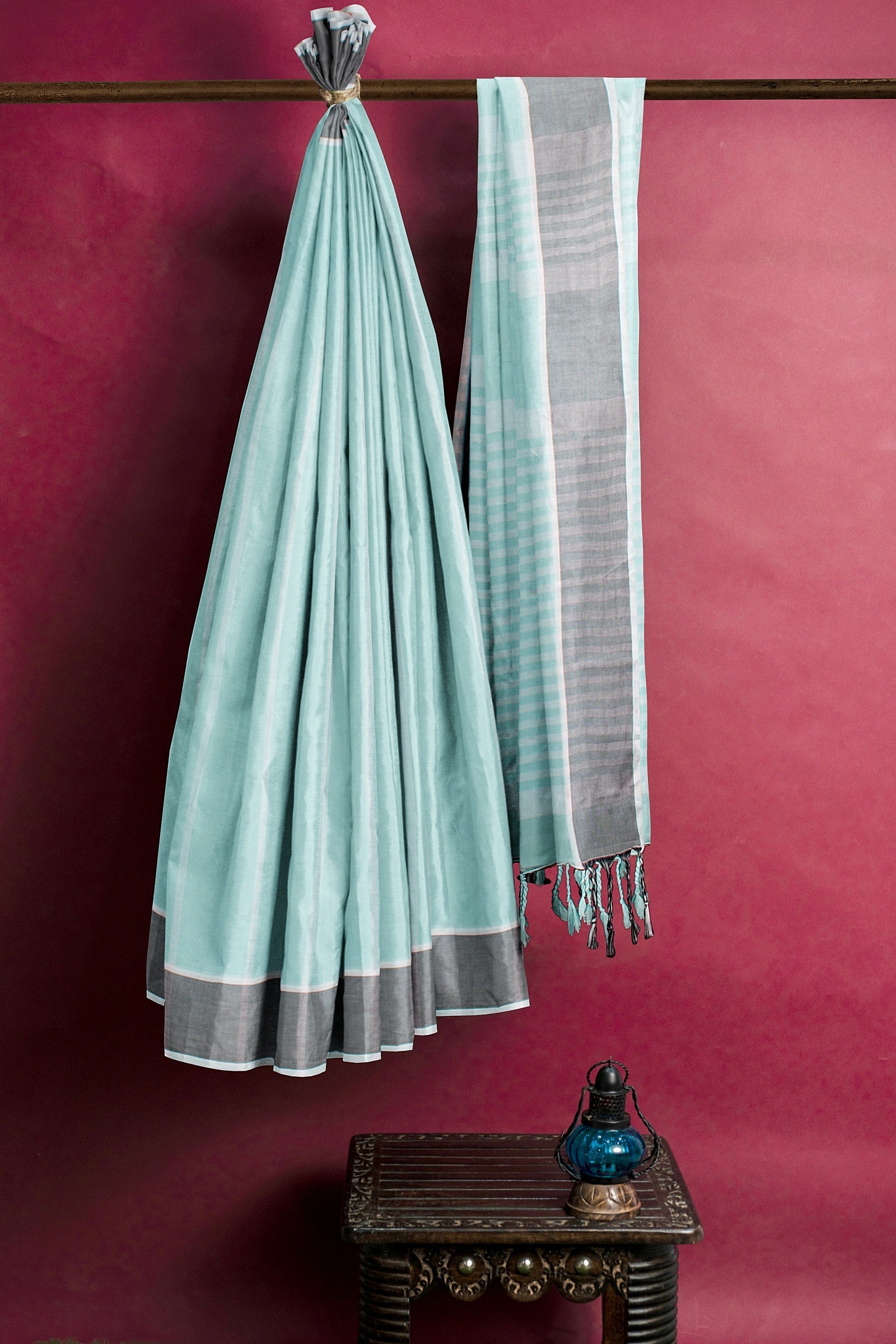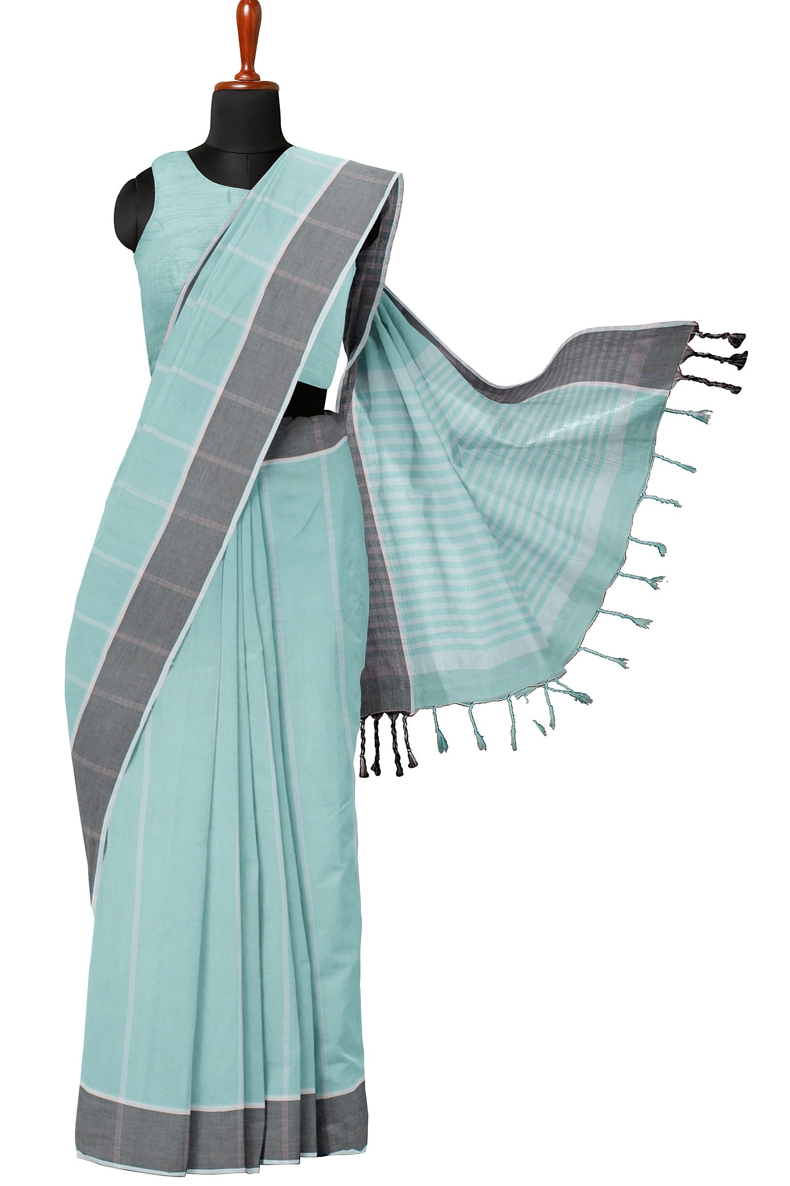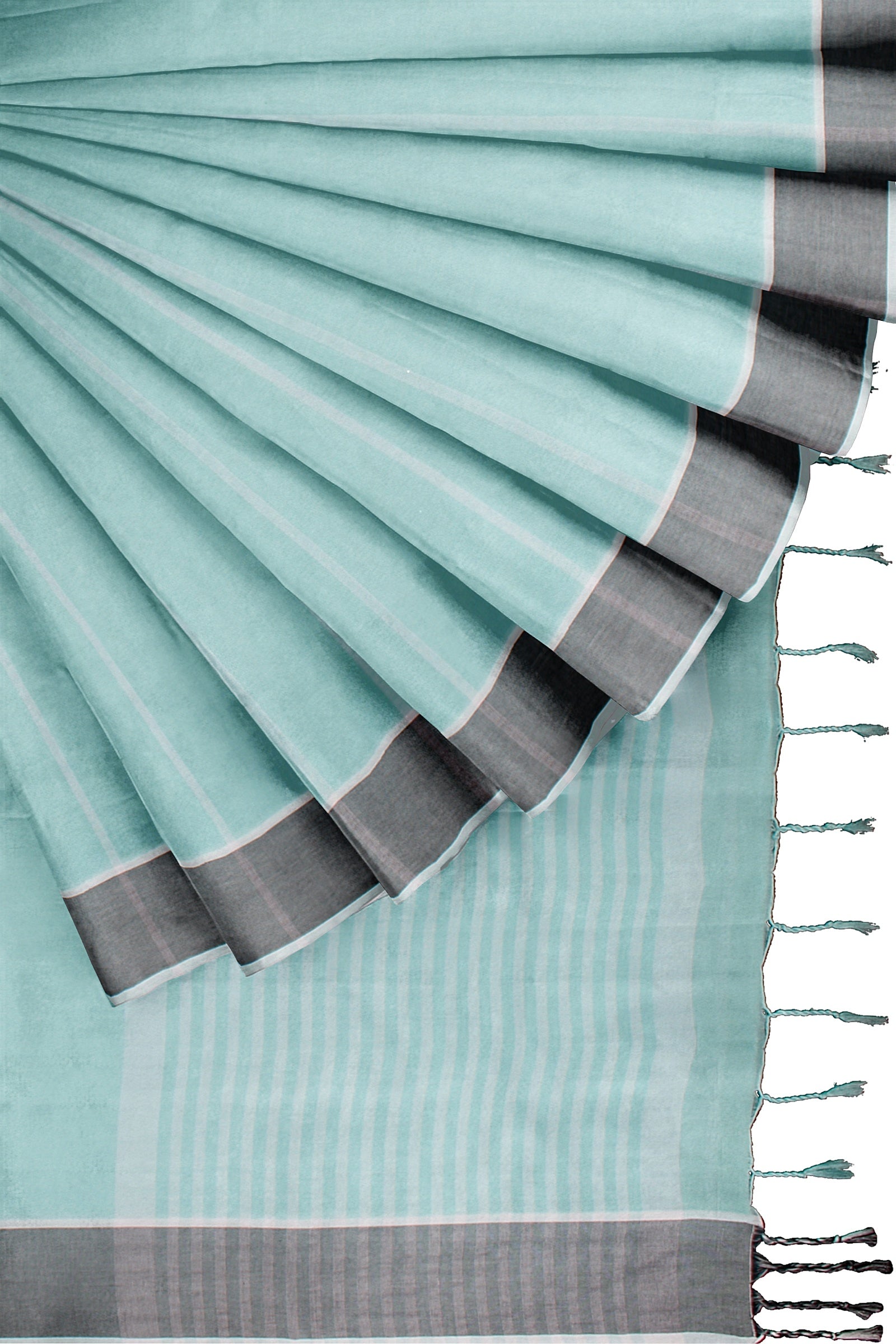 Cyan Saree with White Stripes and Grey and White Border
