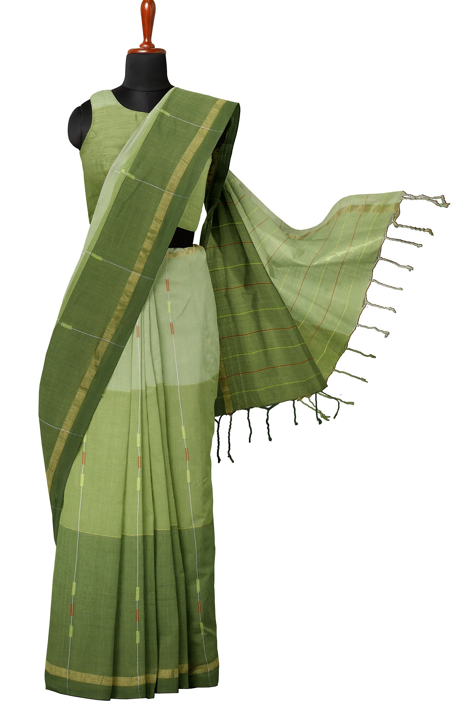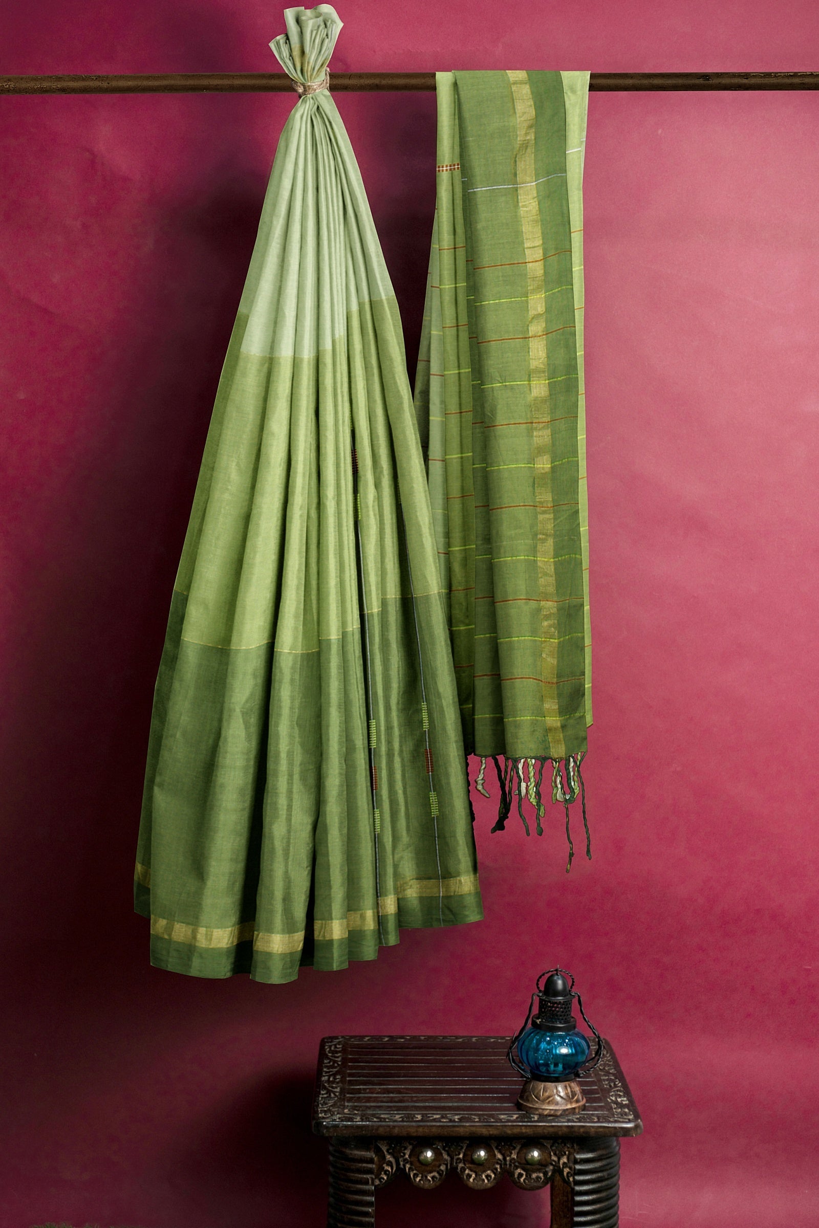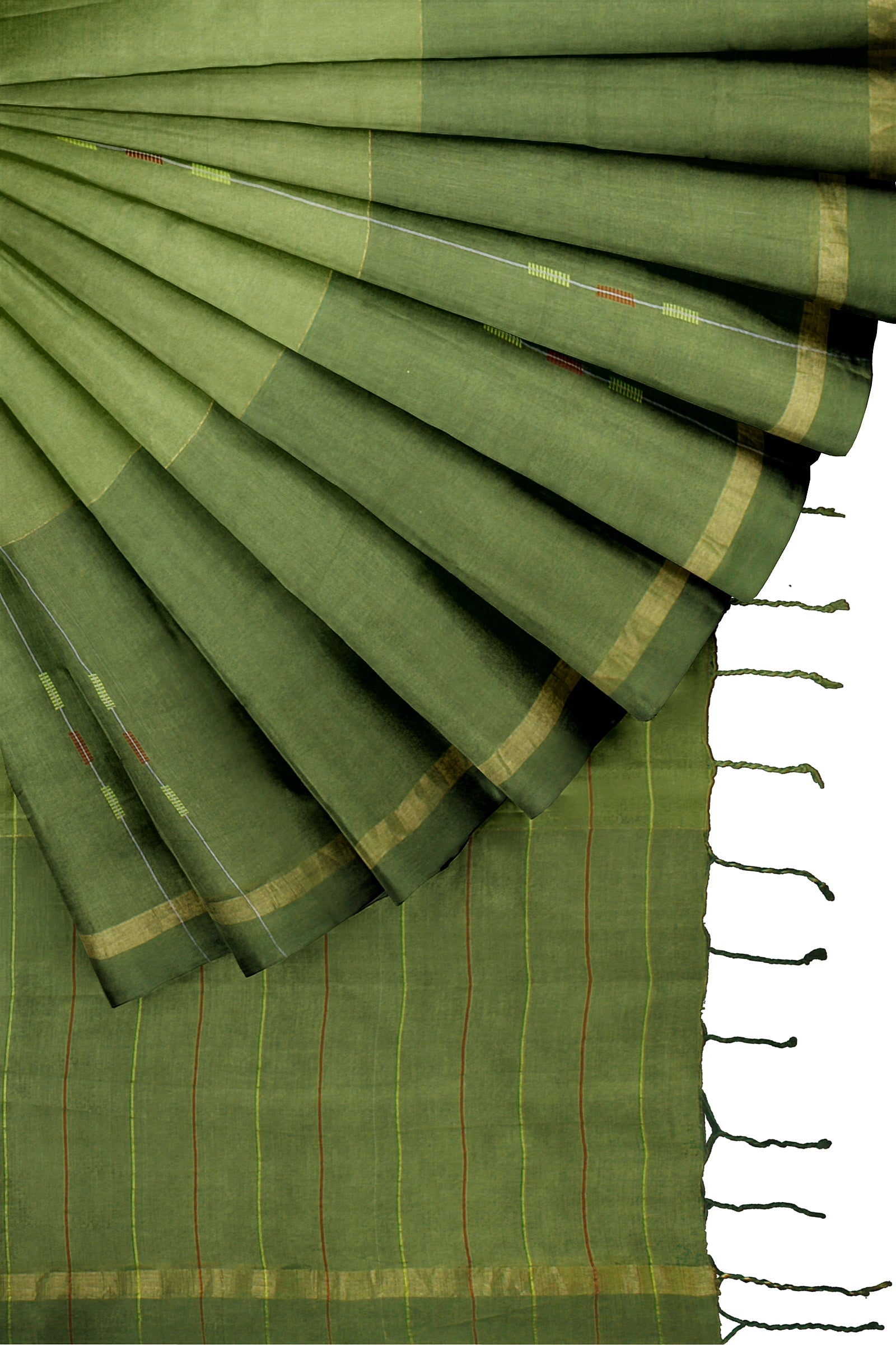 Pistachio, Bud and Fern Green Striped Saree with Golden Zari Border and Red, Yellow and White Lined Butis