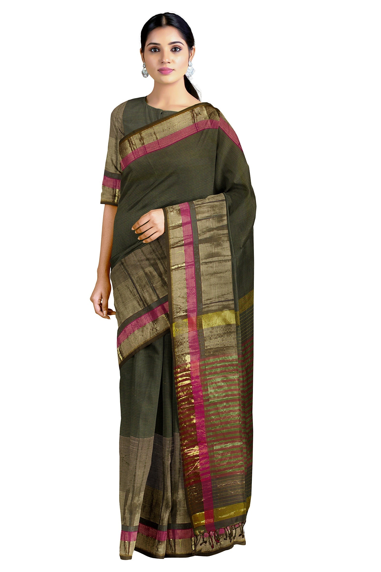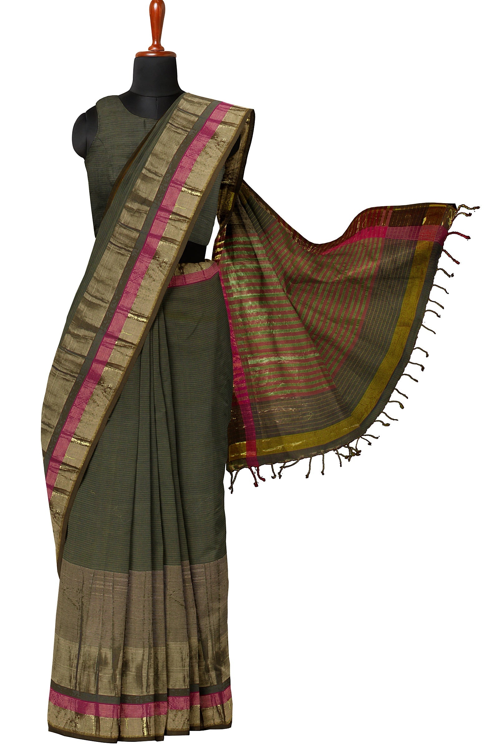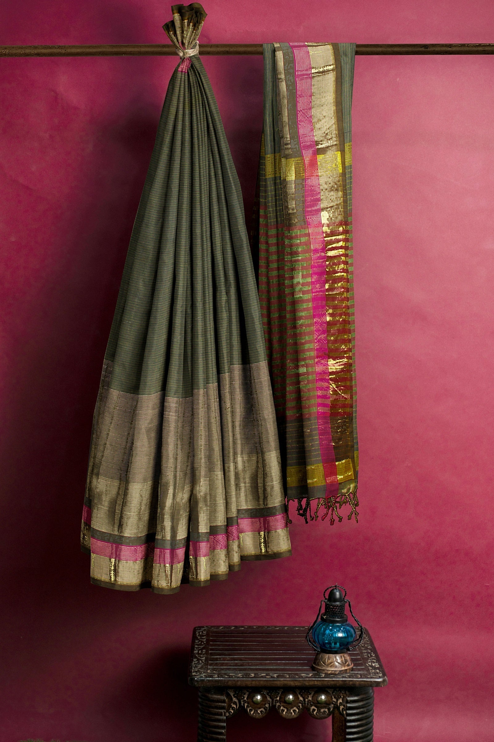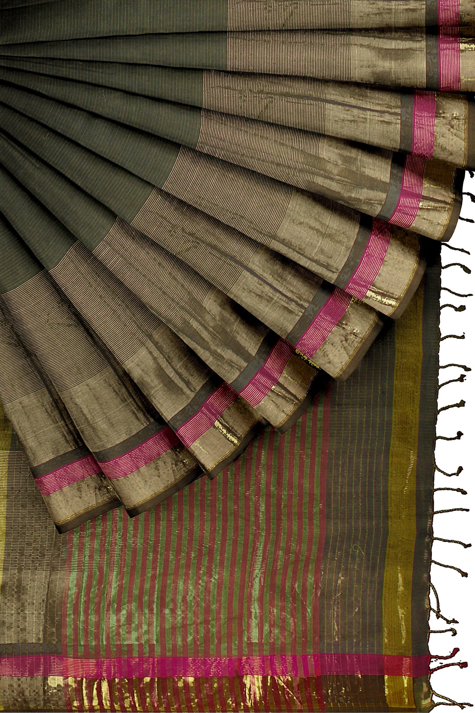 Grey and Yellow Lining Saree with Magenta and Golden Zari Border