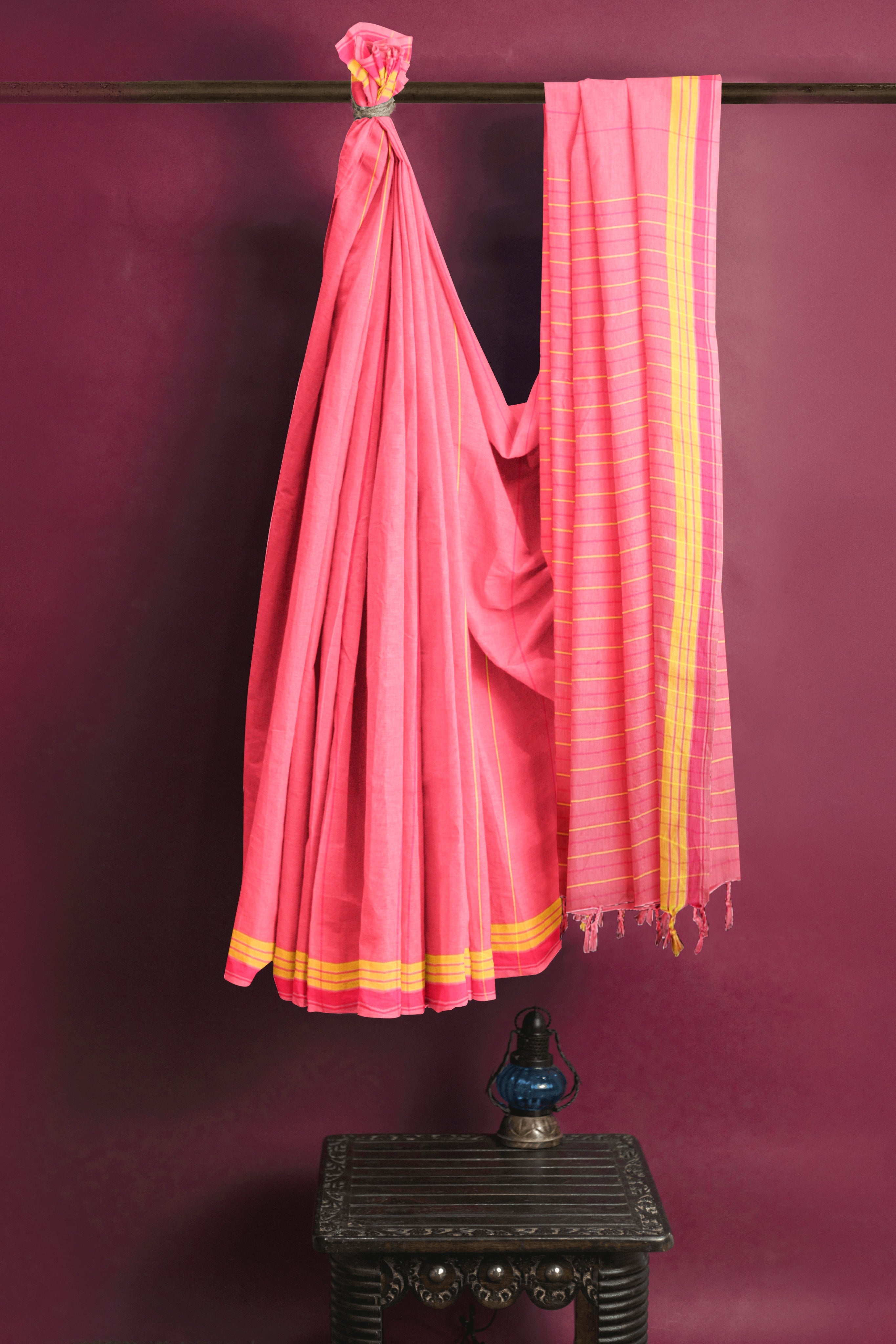 Pink Saree with Red, Yellow Striped and Magenta, Yellow Border