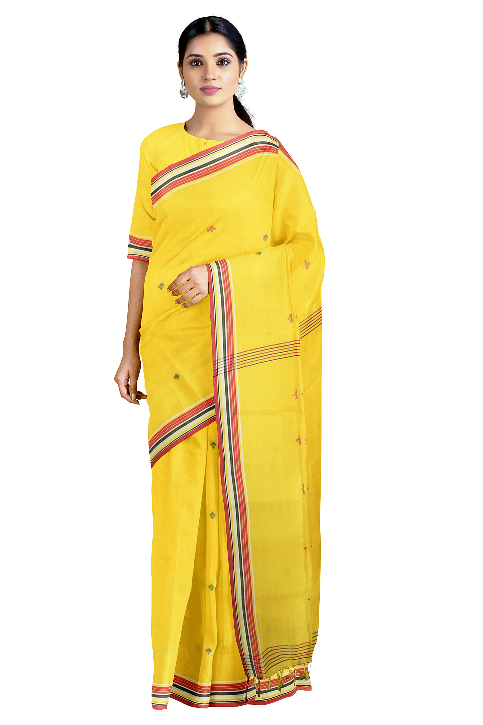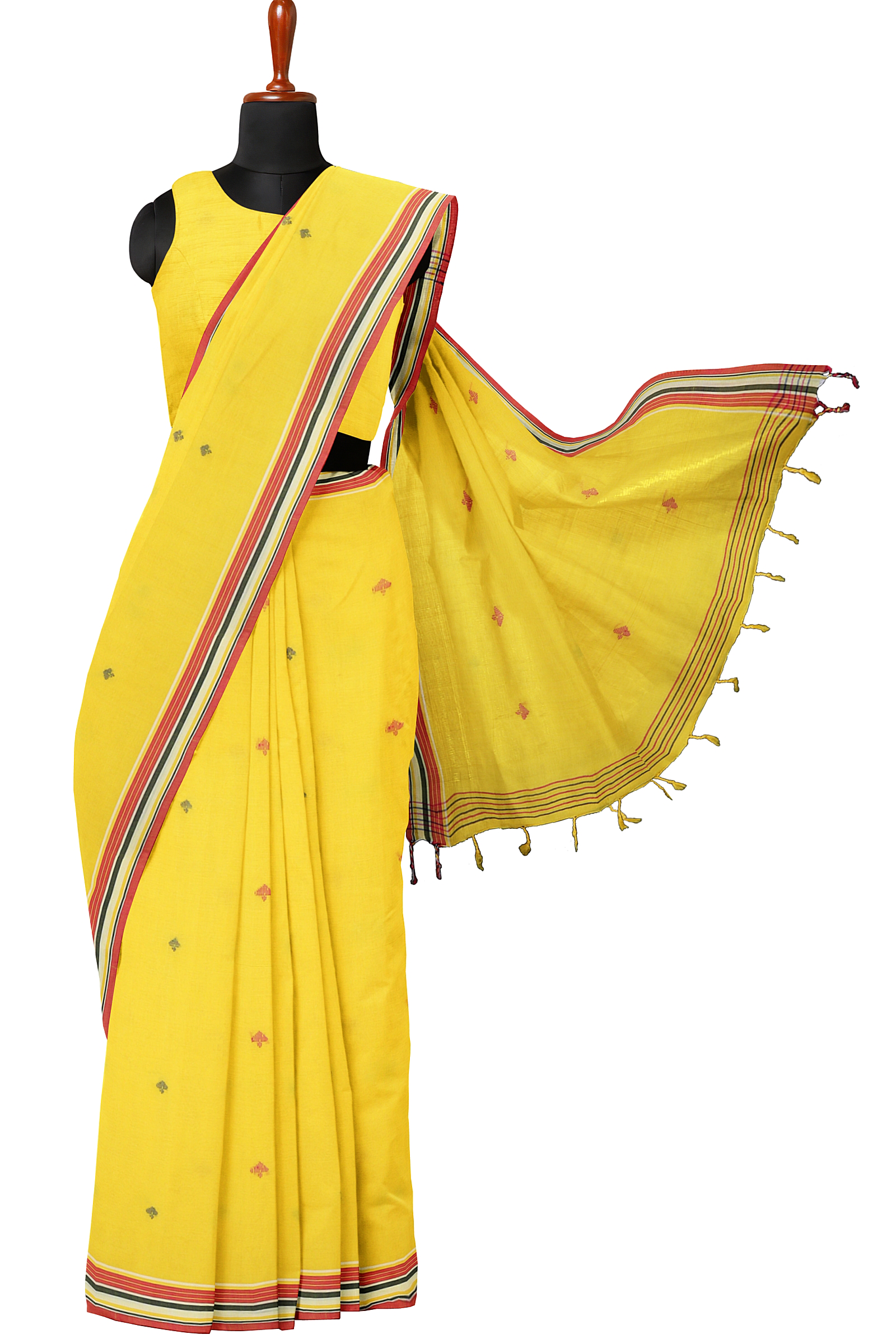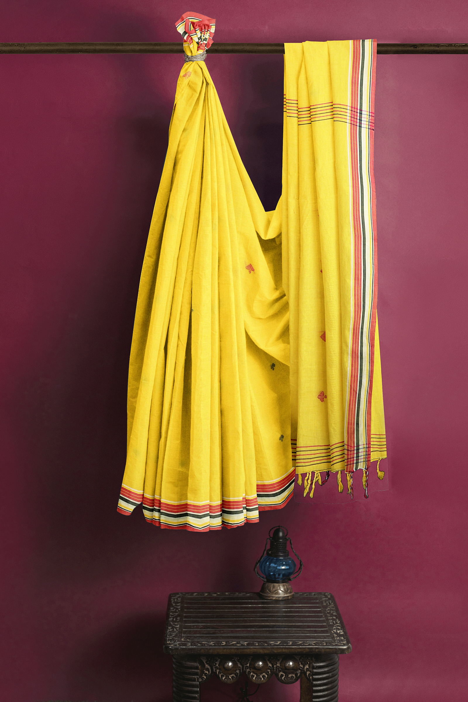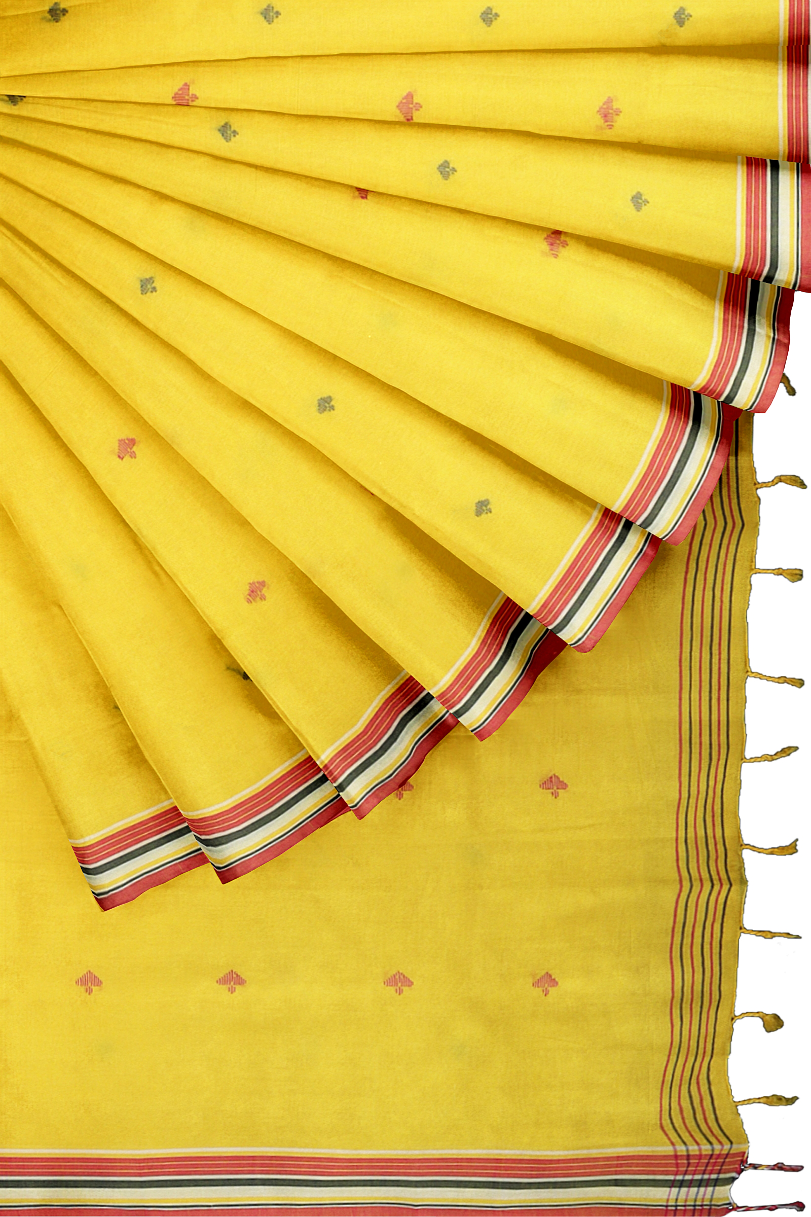 Lemon Yellow Saree with Butis and Red, Black and White Border