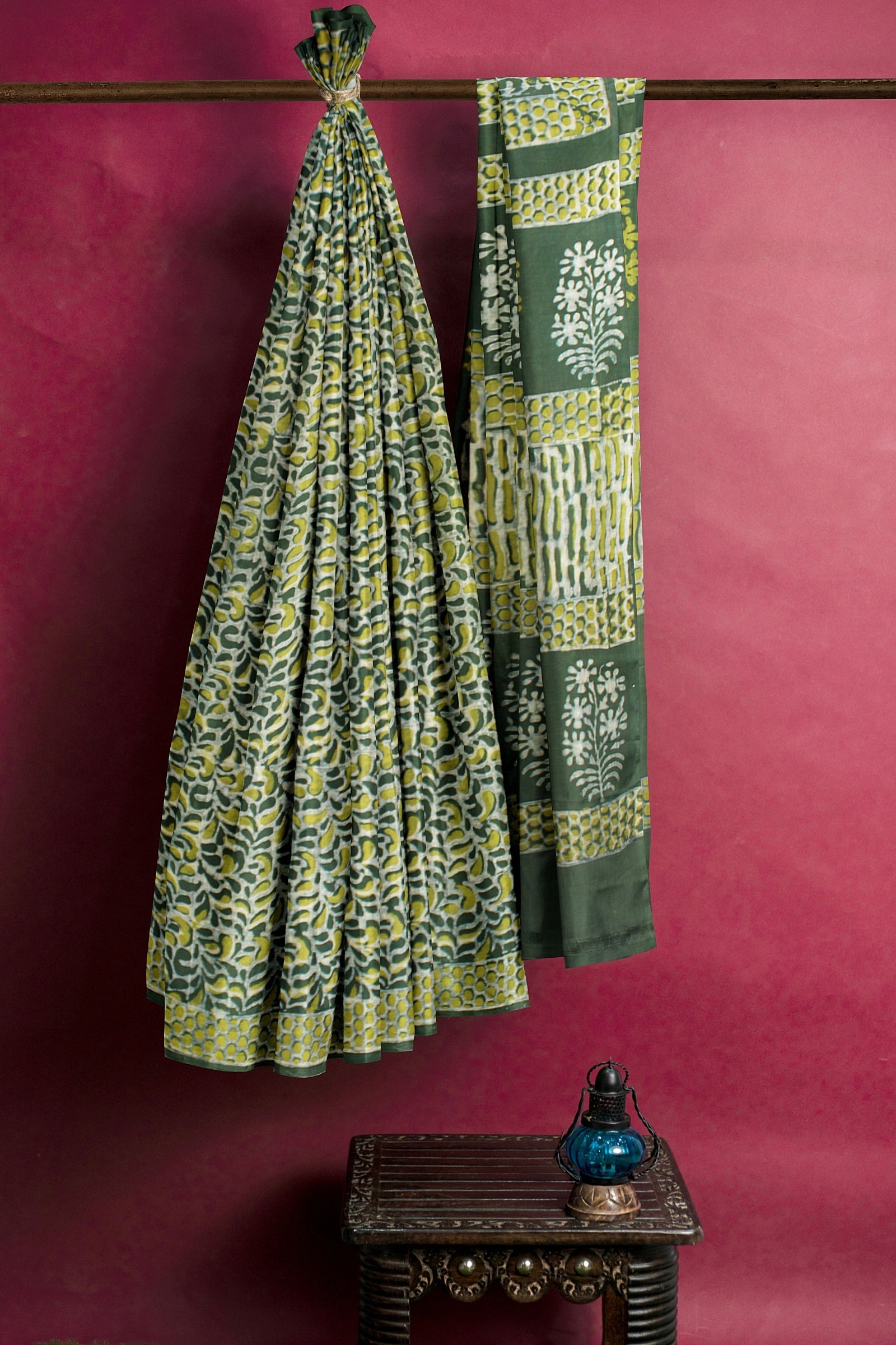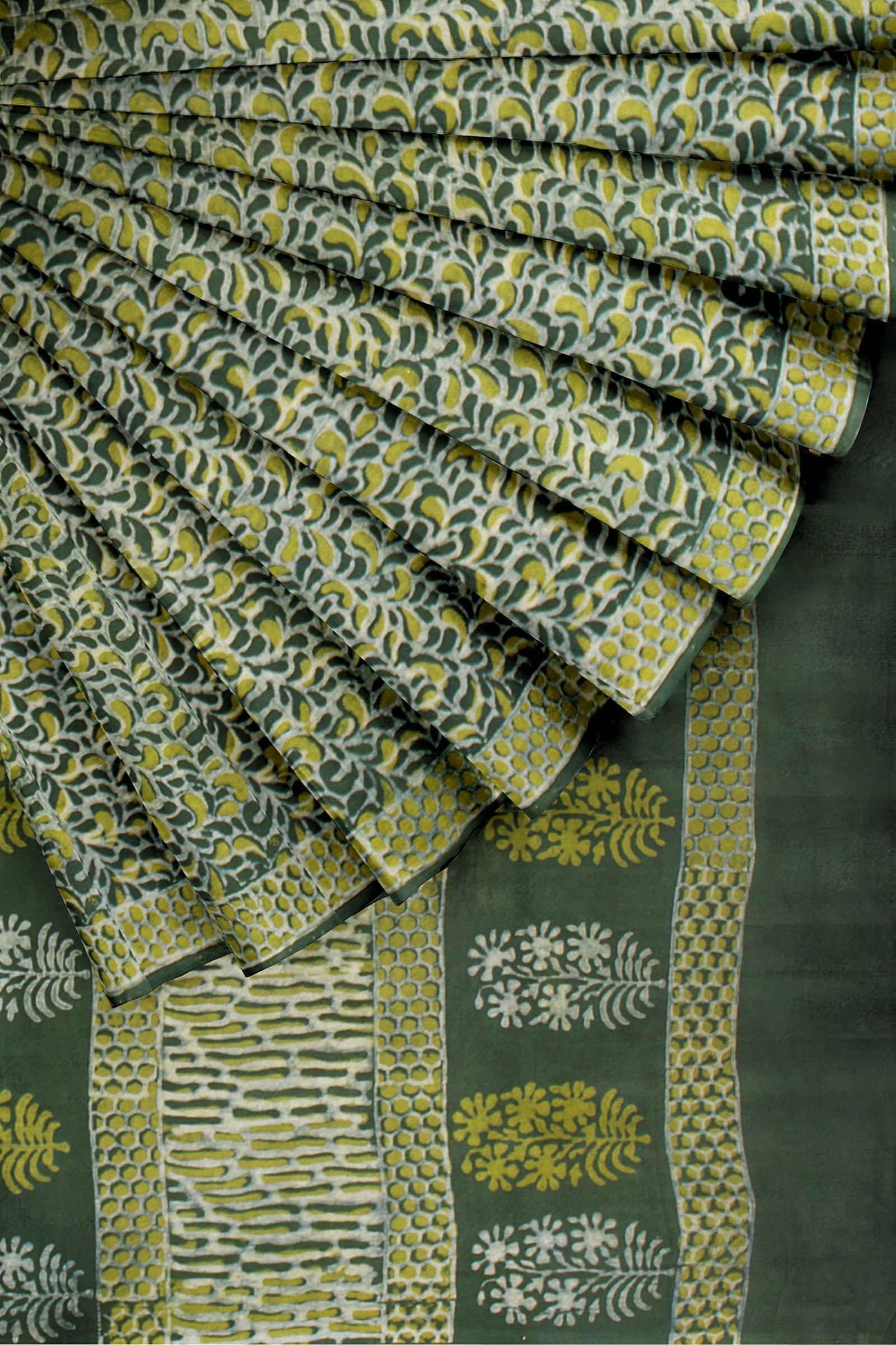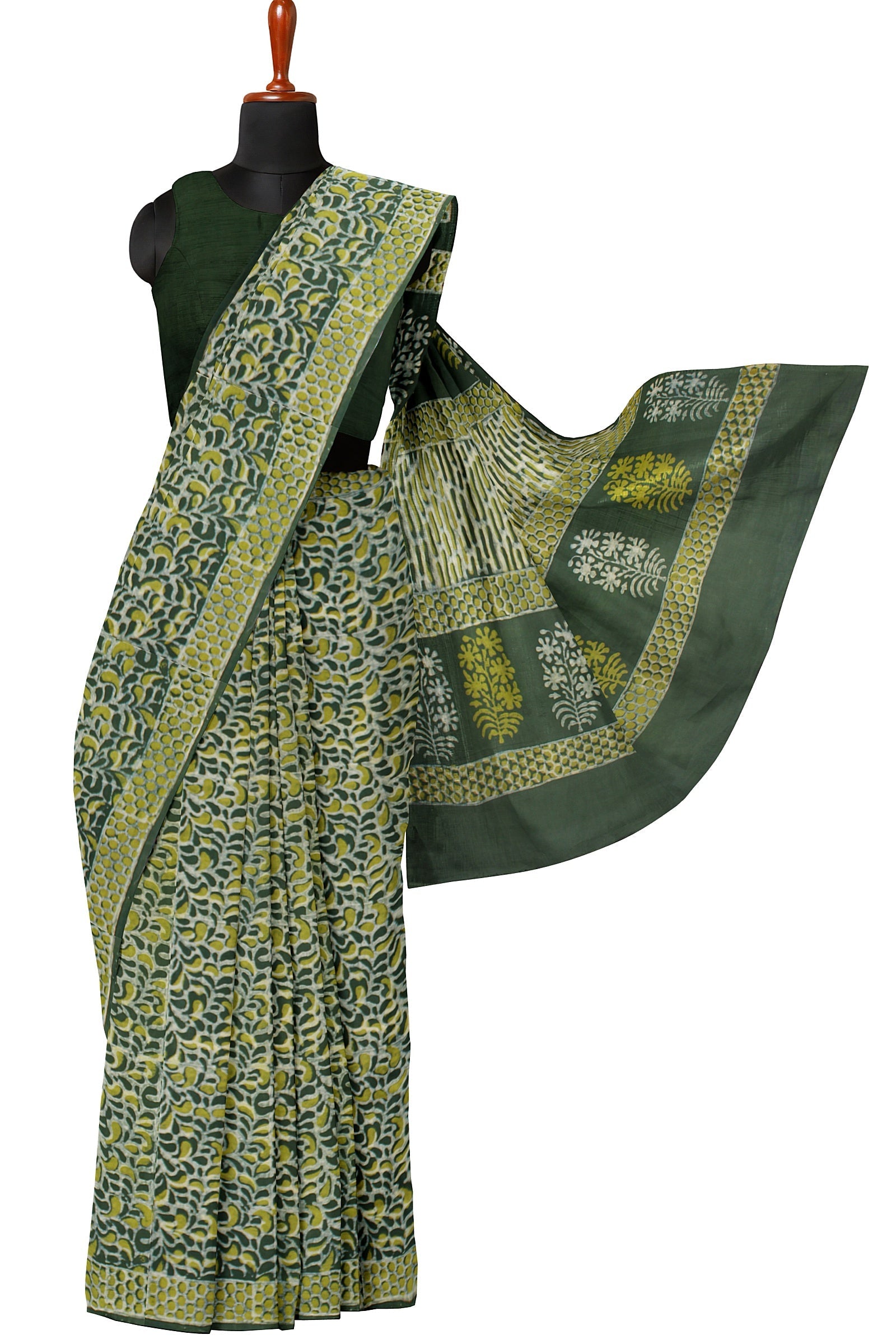 Green and White Dabu Printed Saree