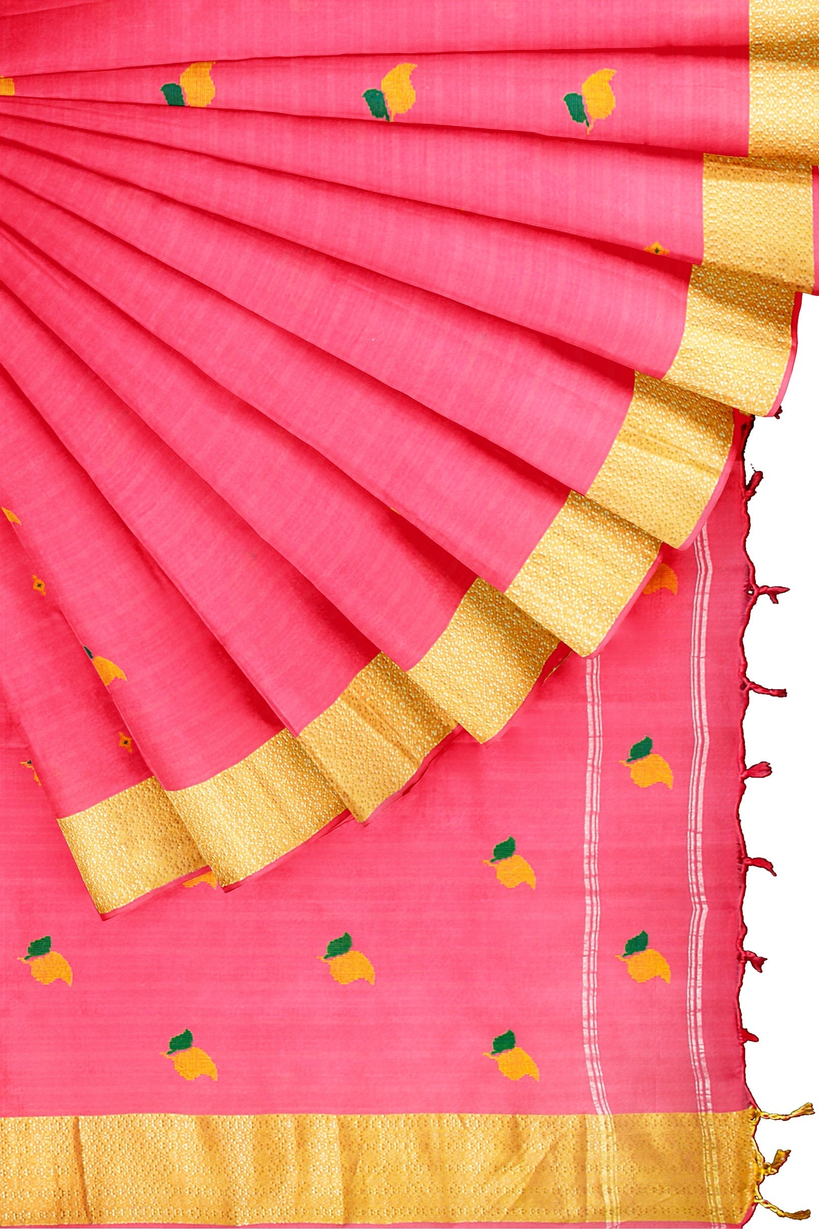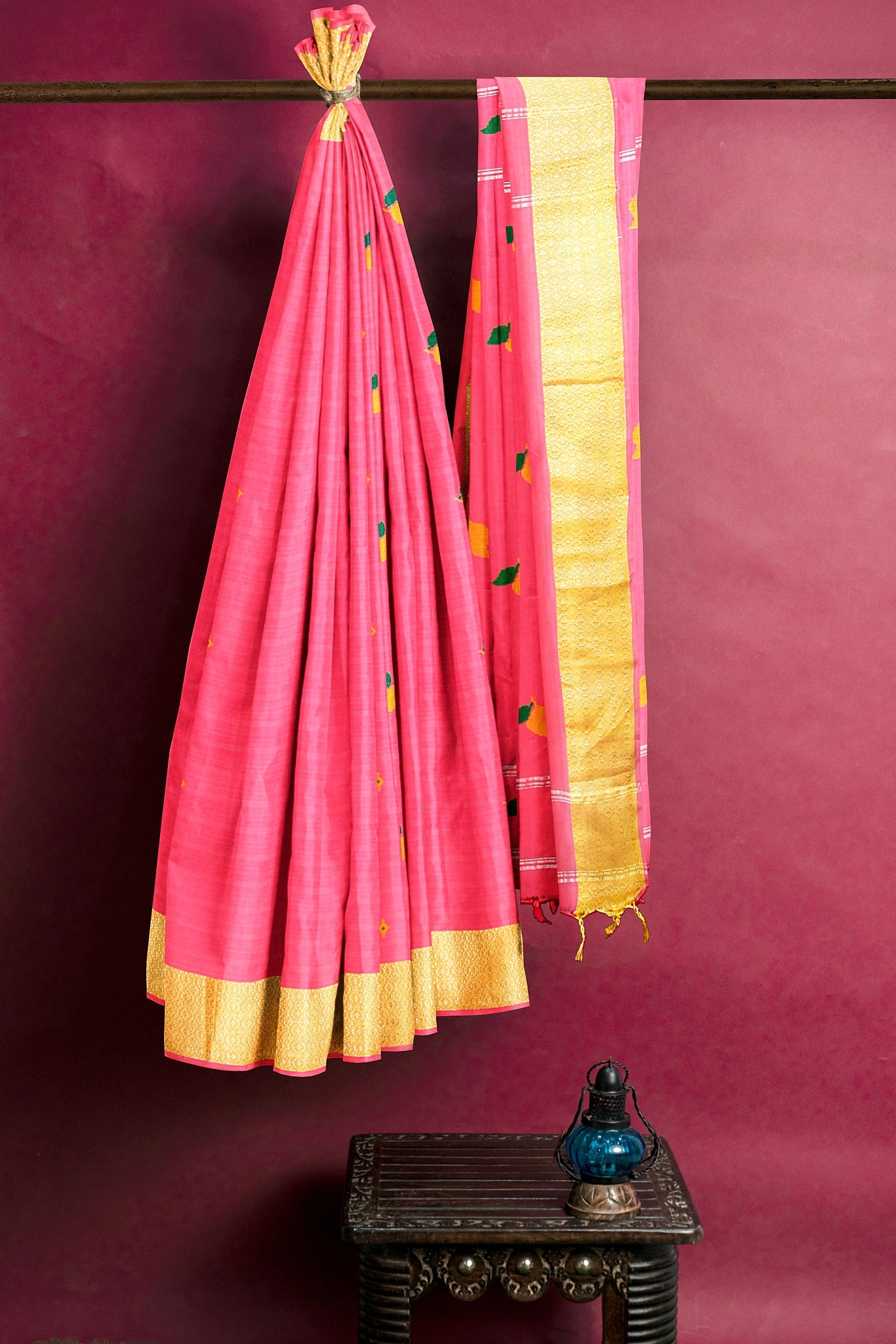 Magenta Dobby Saree with Silver Zari, Green and Yellow Border and Butis