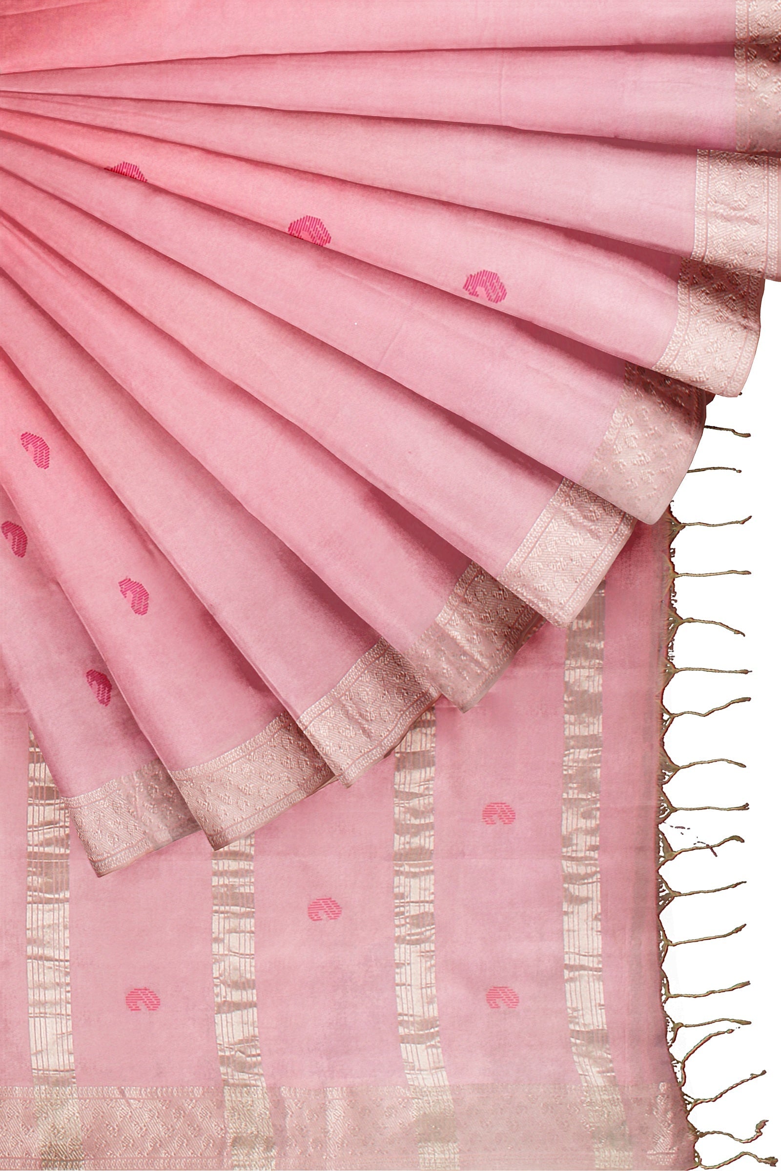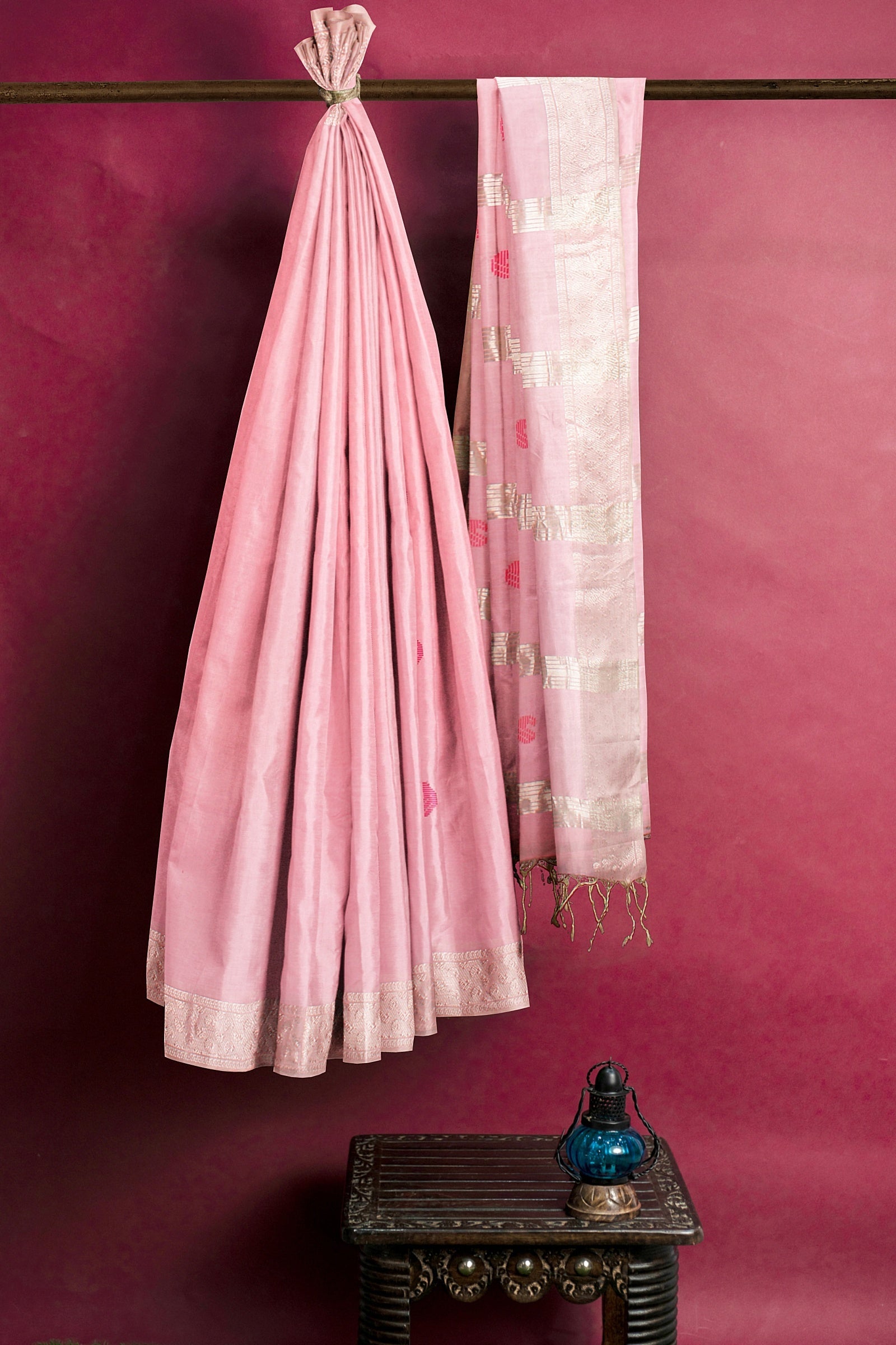 Pink Dobby Saree with Silver Zari Border and Magenta Butis