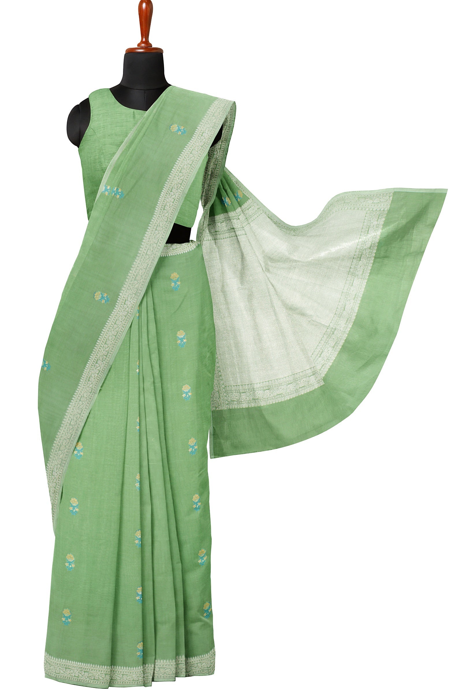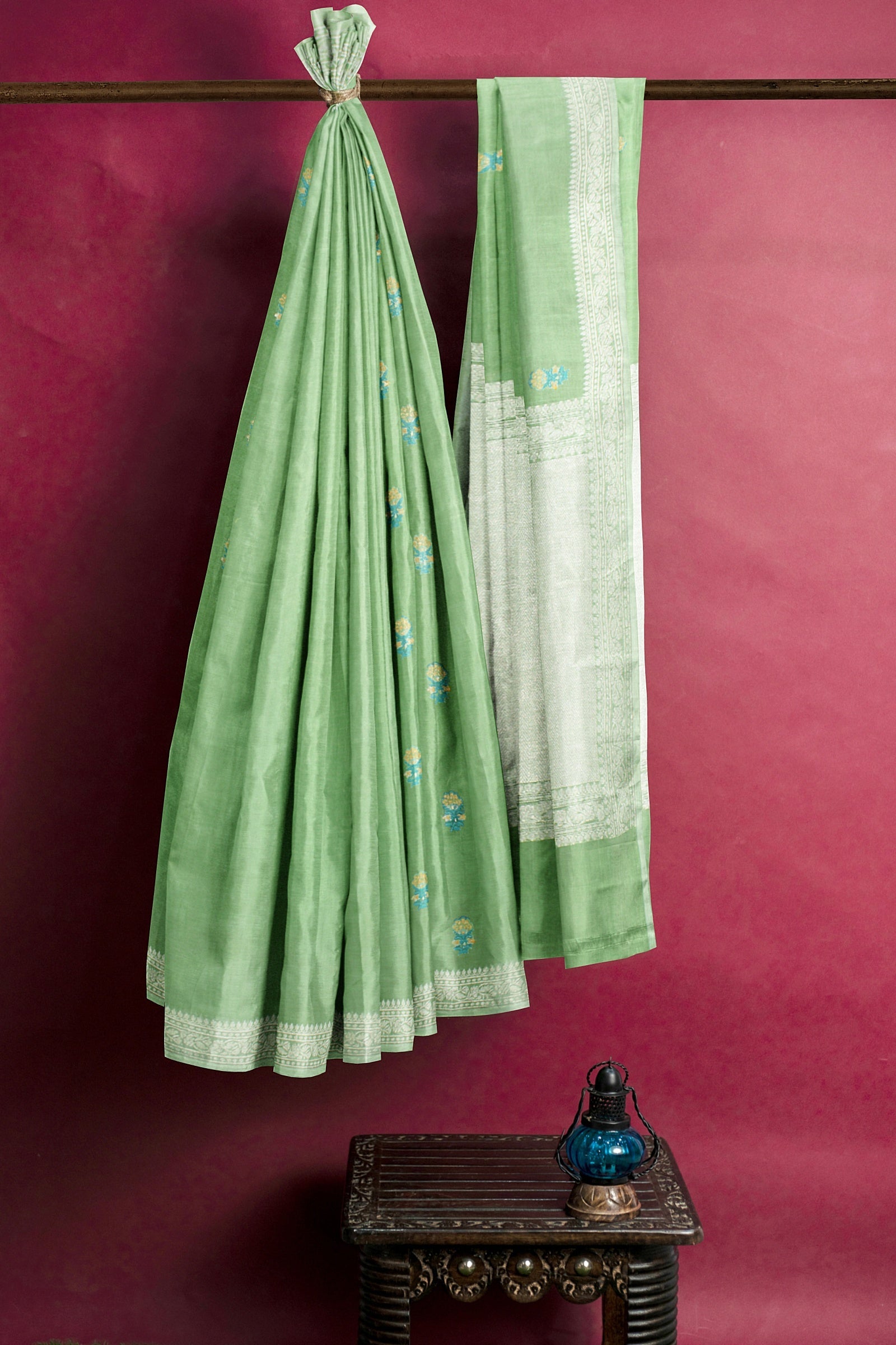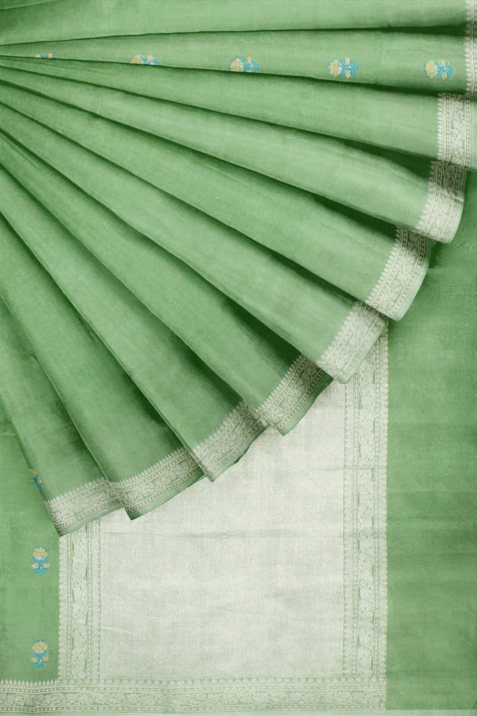 Green Jacquard Saree with Silver Zari Border and Blue and Golden Zari Butis