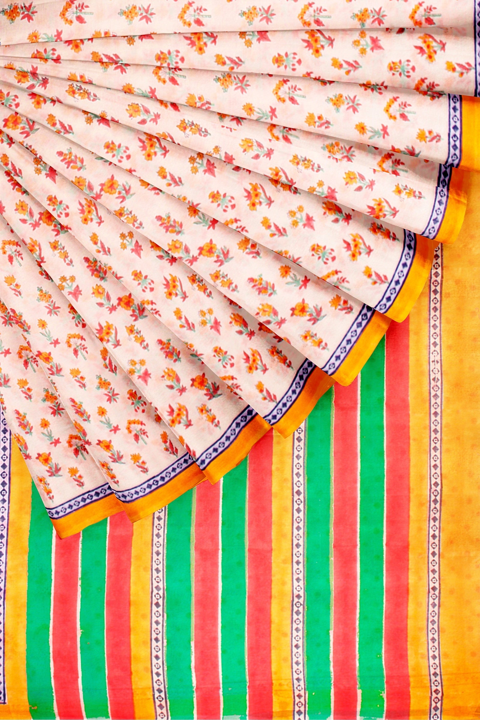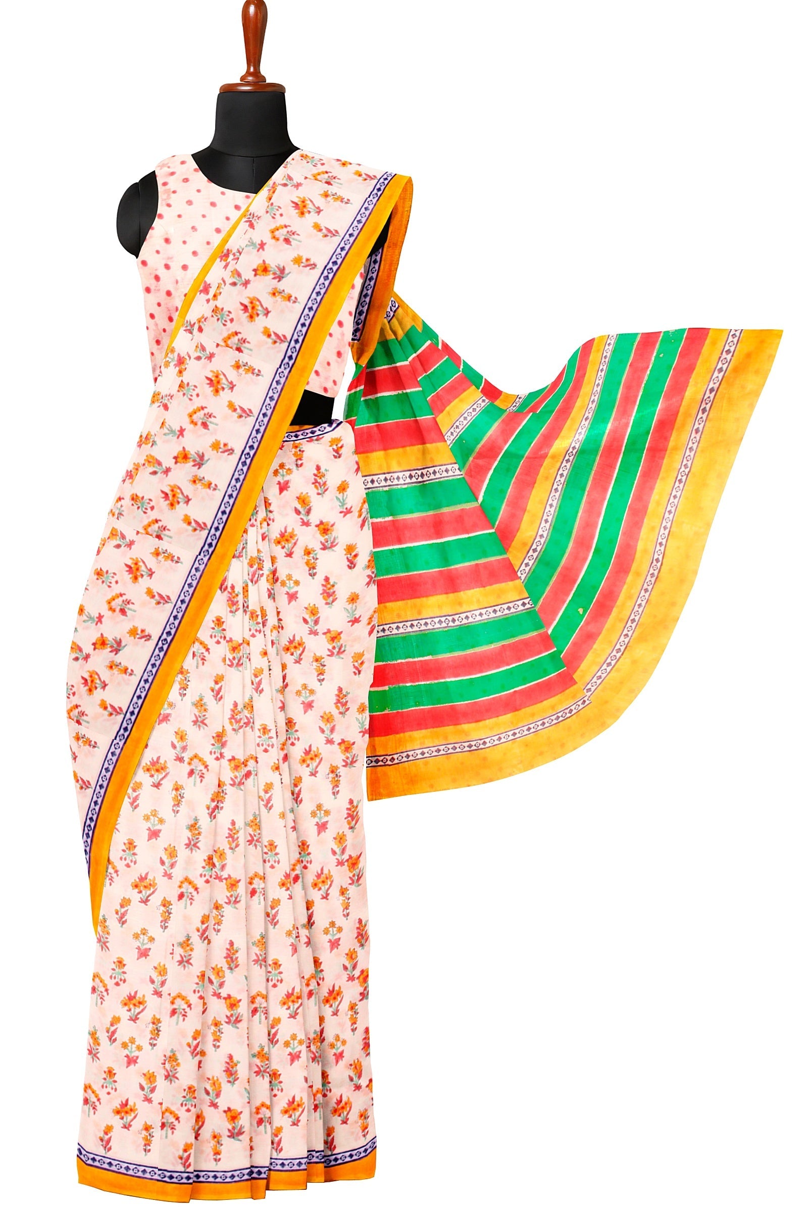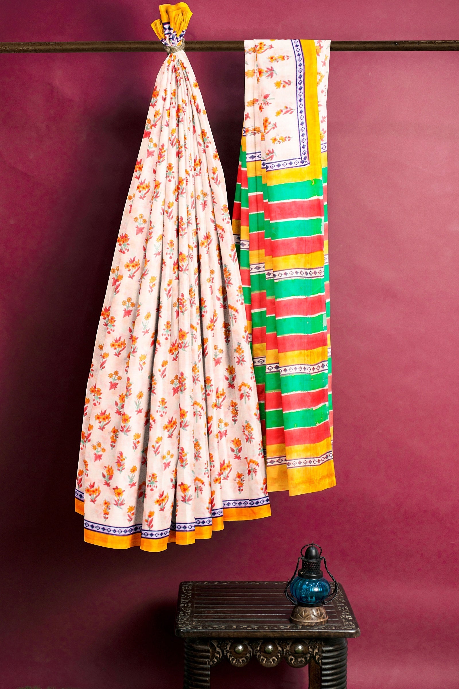 Seashell White, Yellow, Red and Green Sanganeri Hand Block Printed Saree