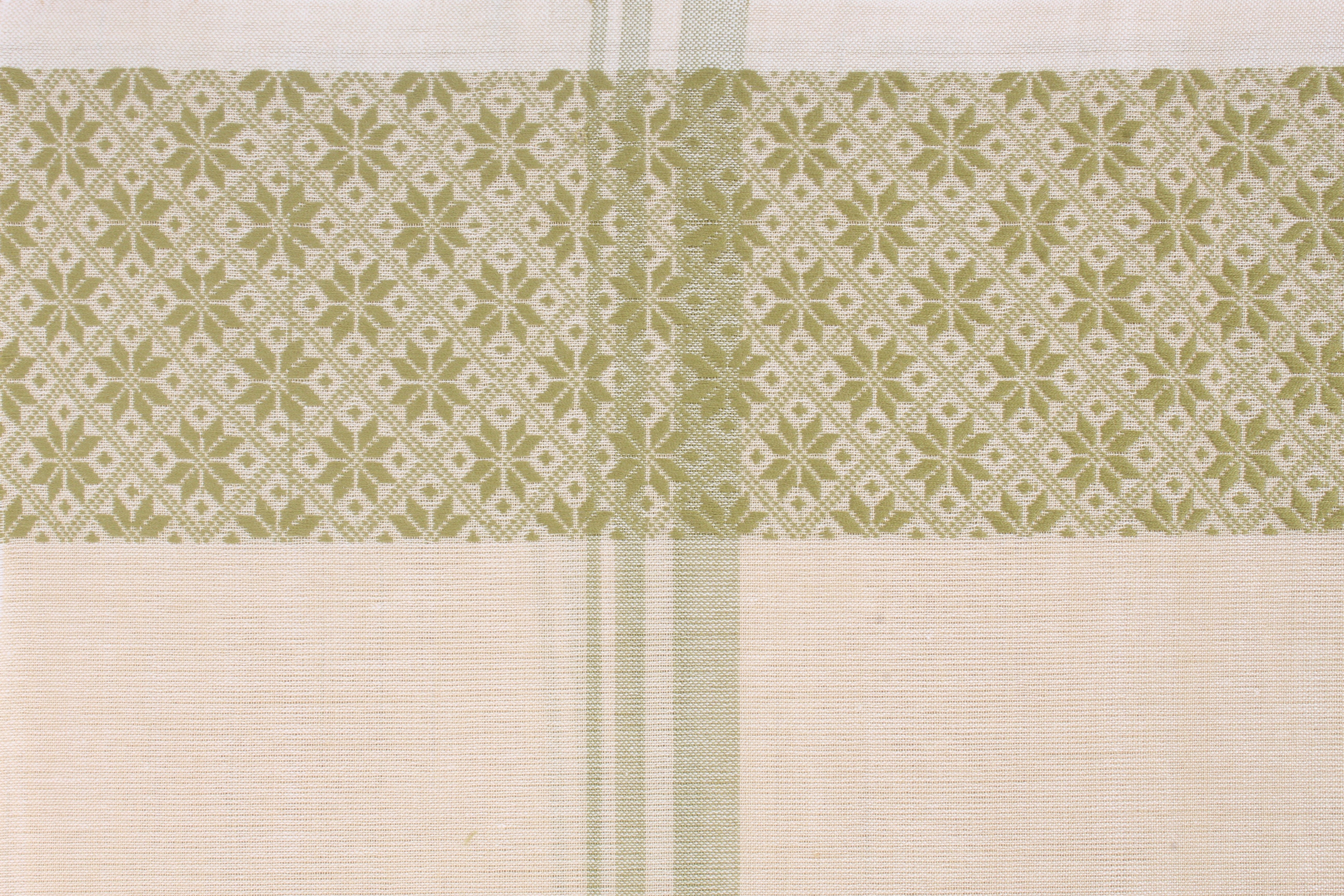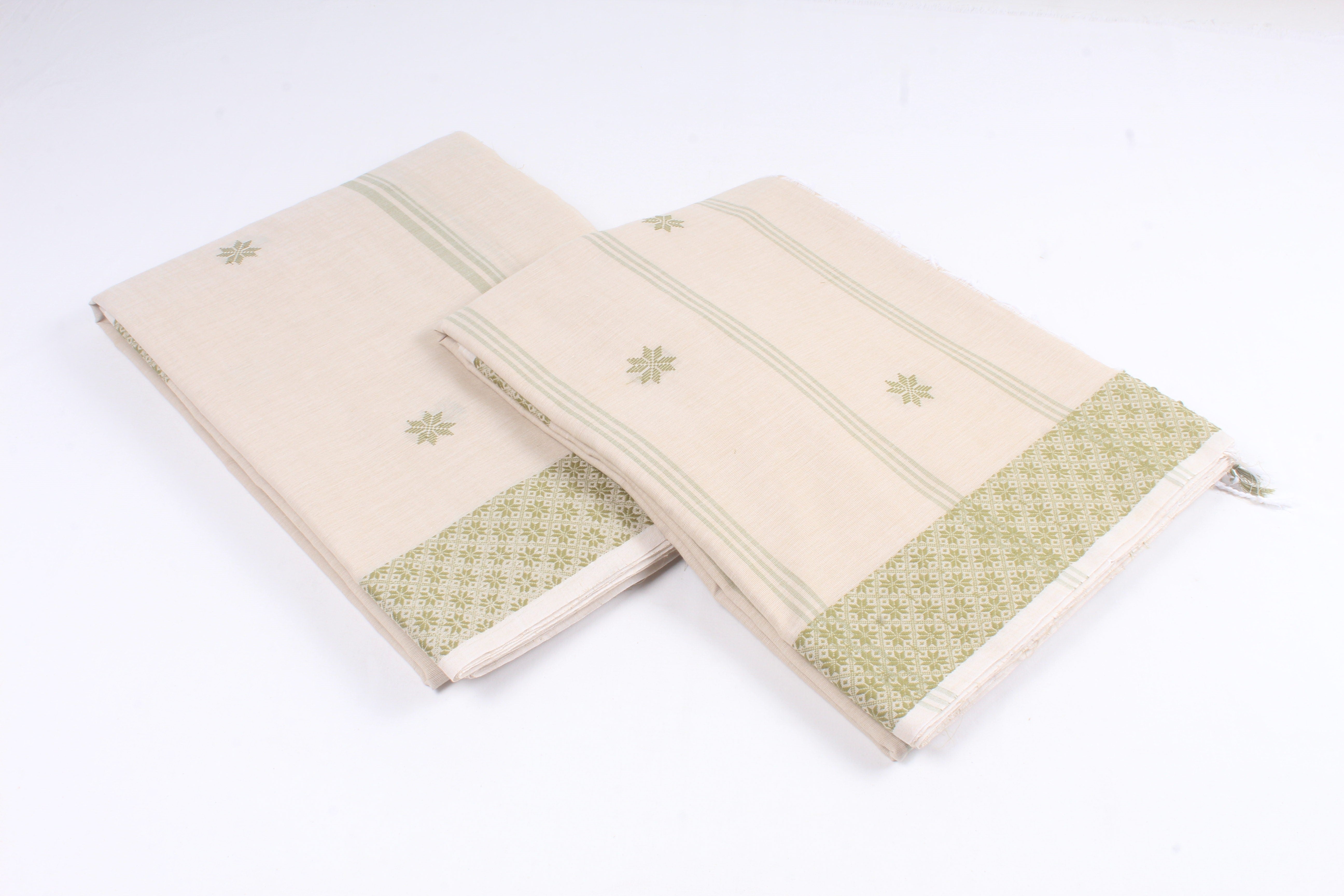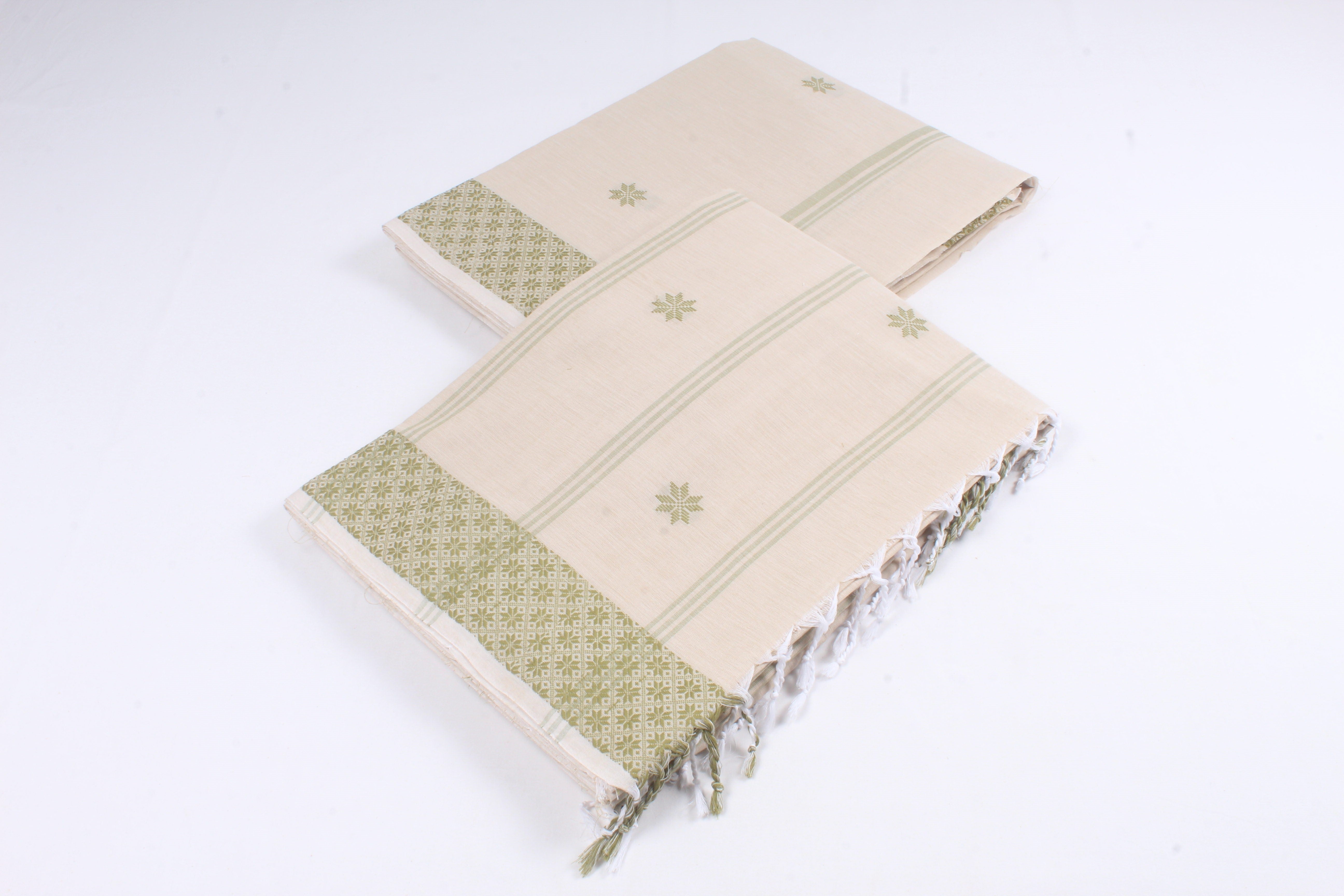 Traditional Handloom Joda Set in Cream with Butis and Green Dobby Border