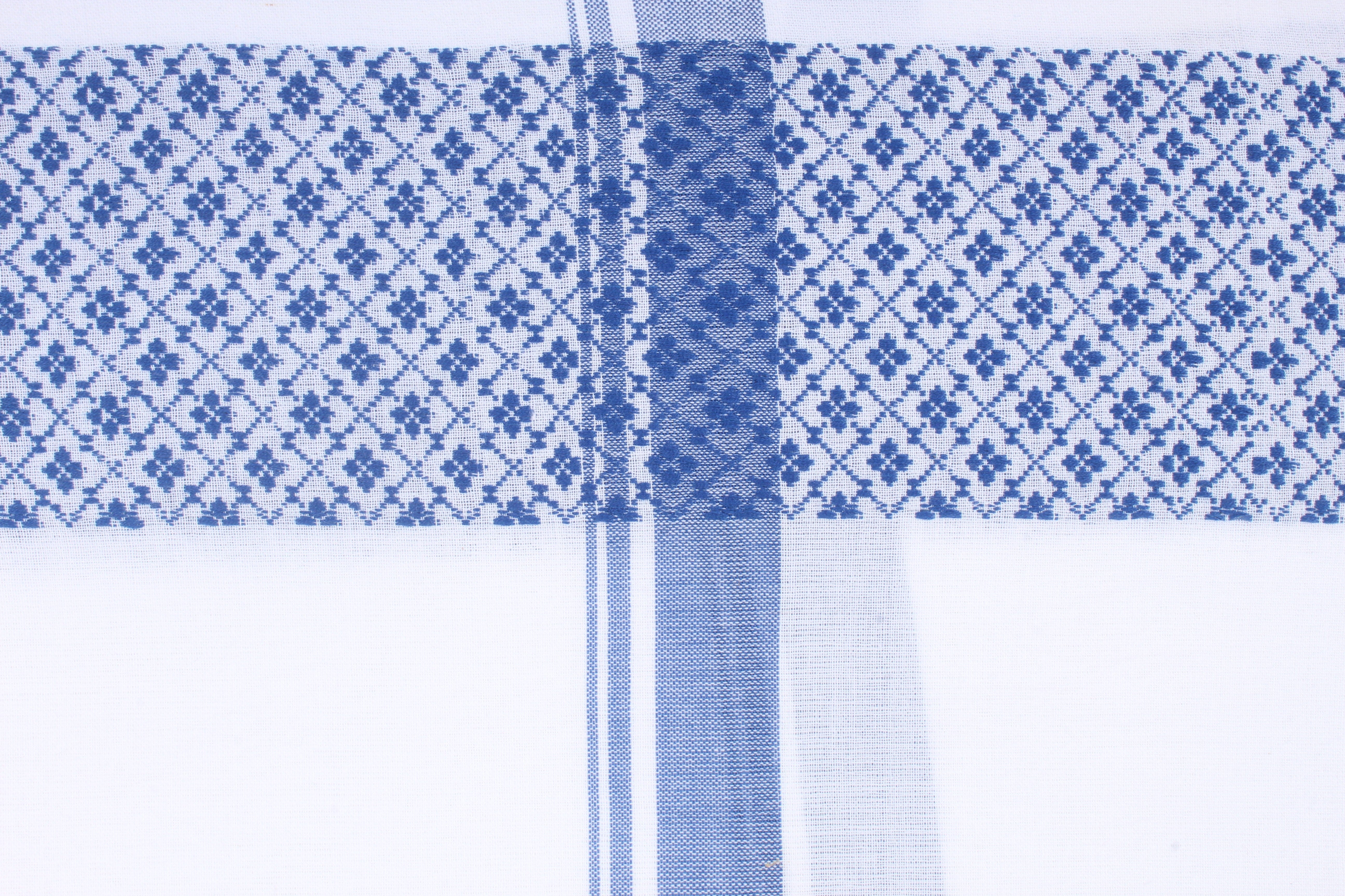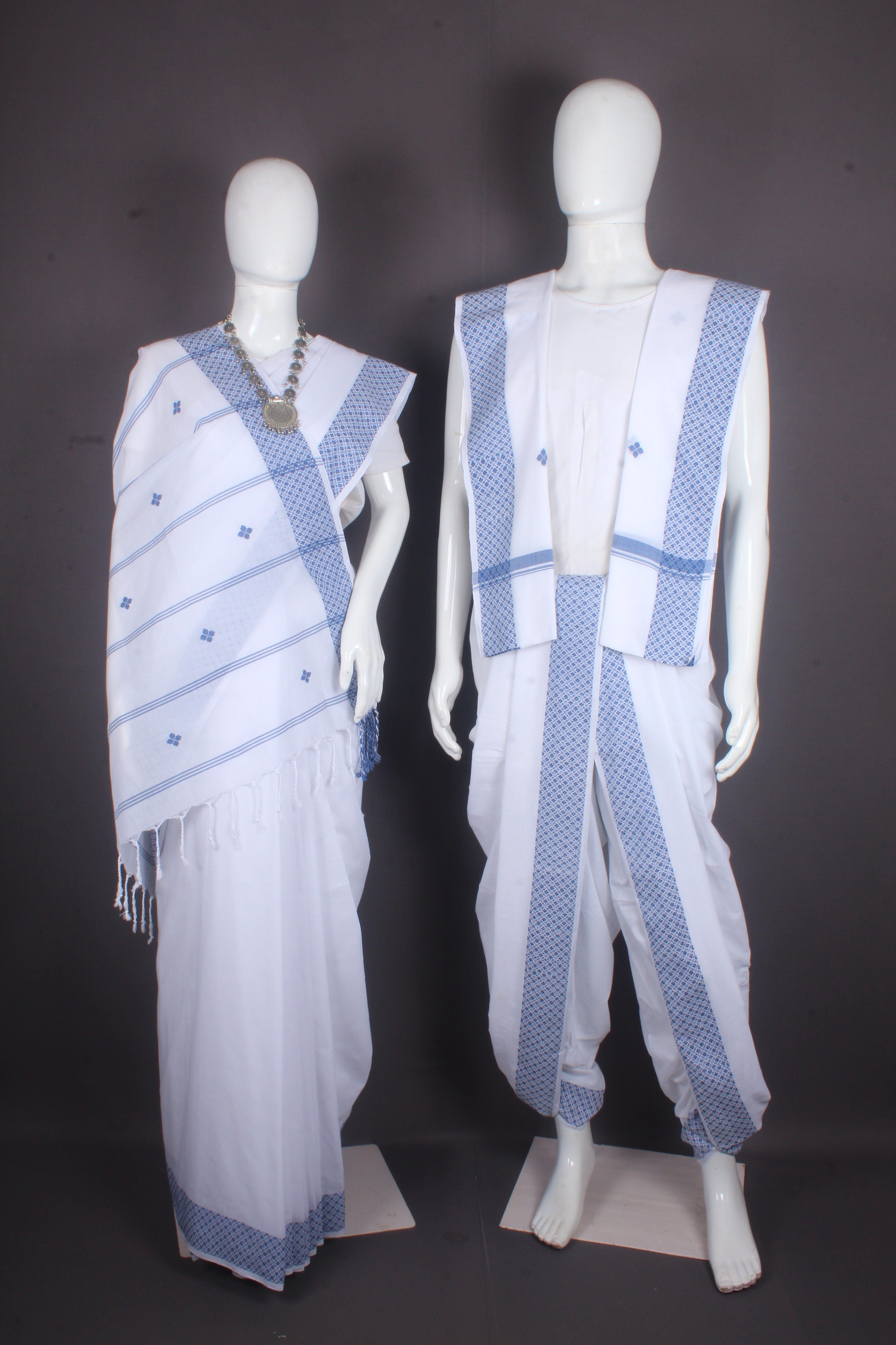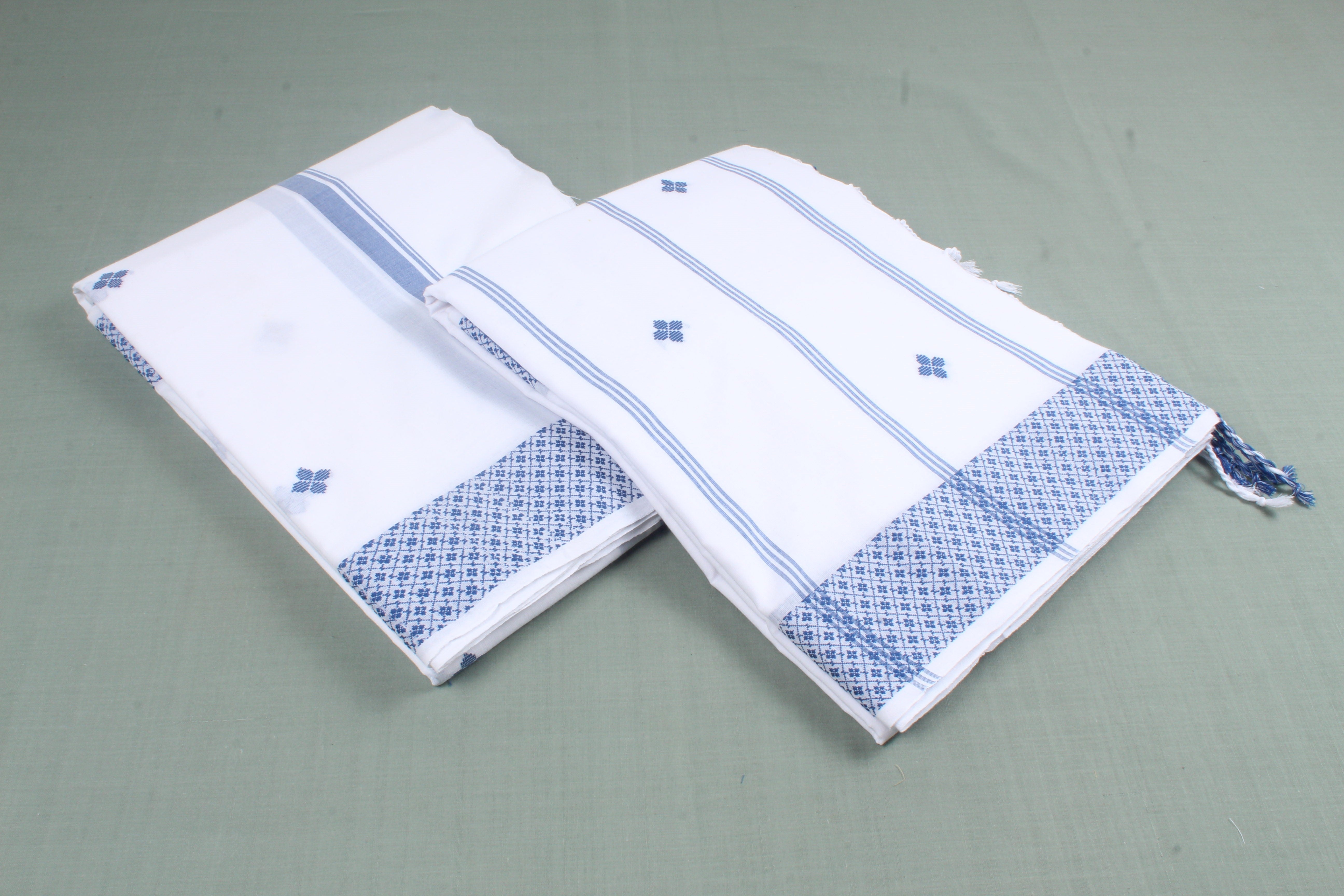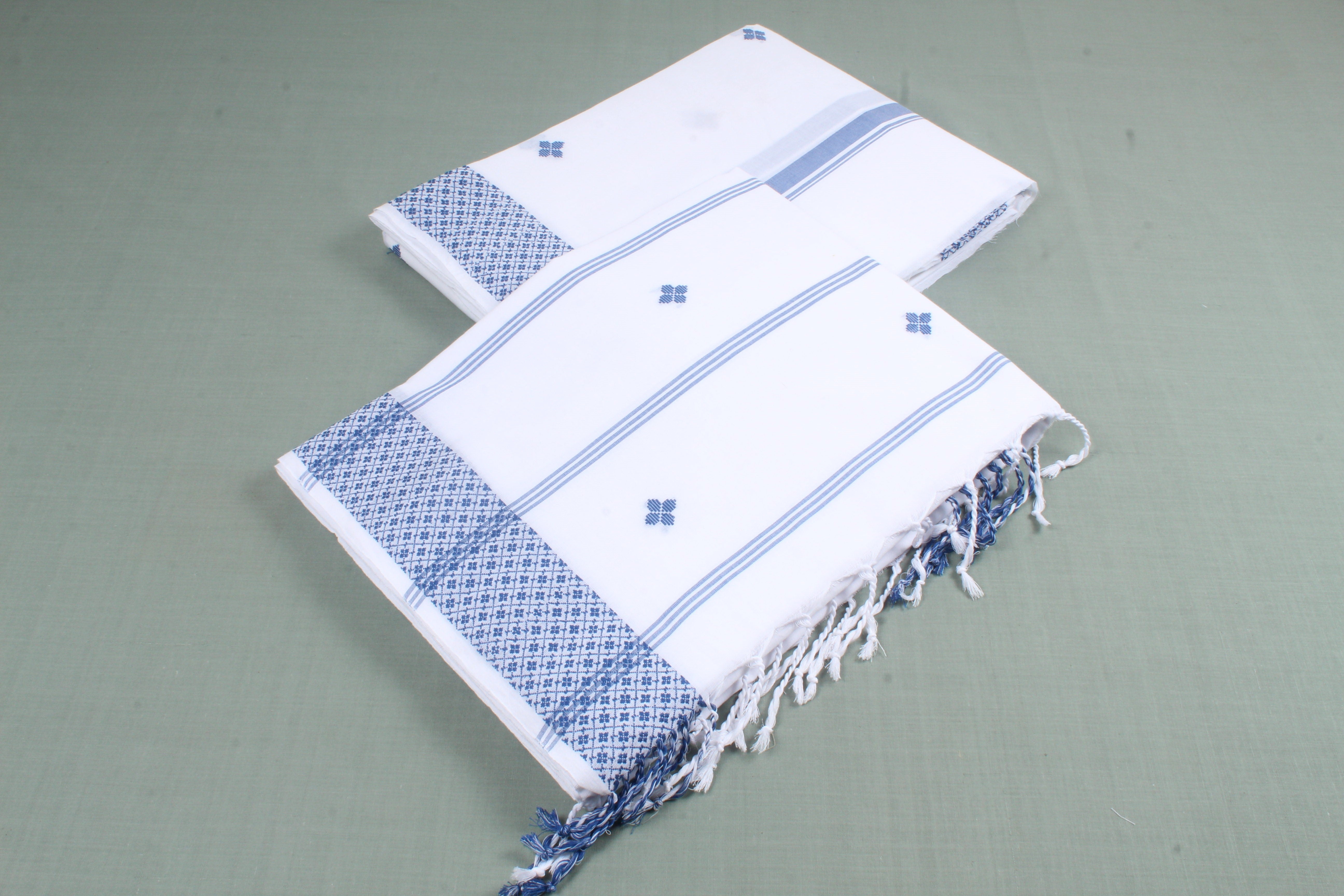 Traditional Handloom Joda Set in White with Butis and Blue Dobby Border