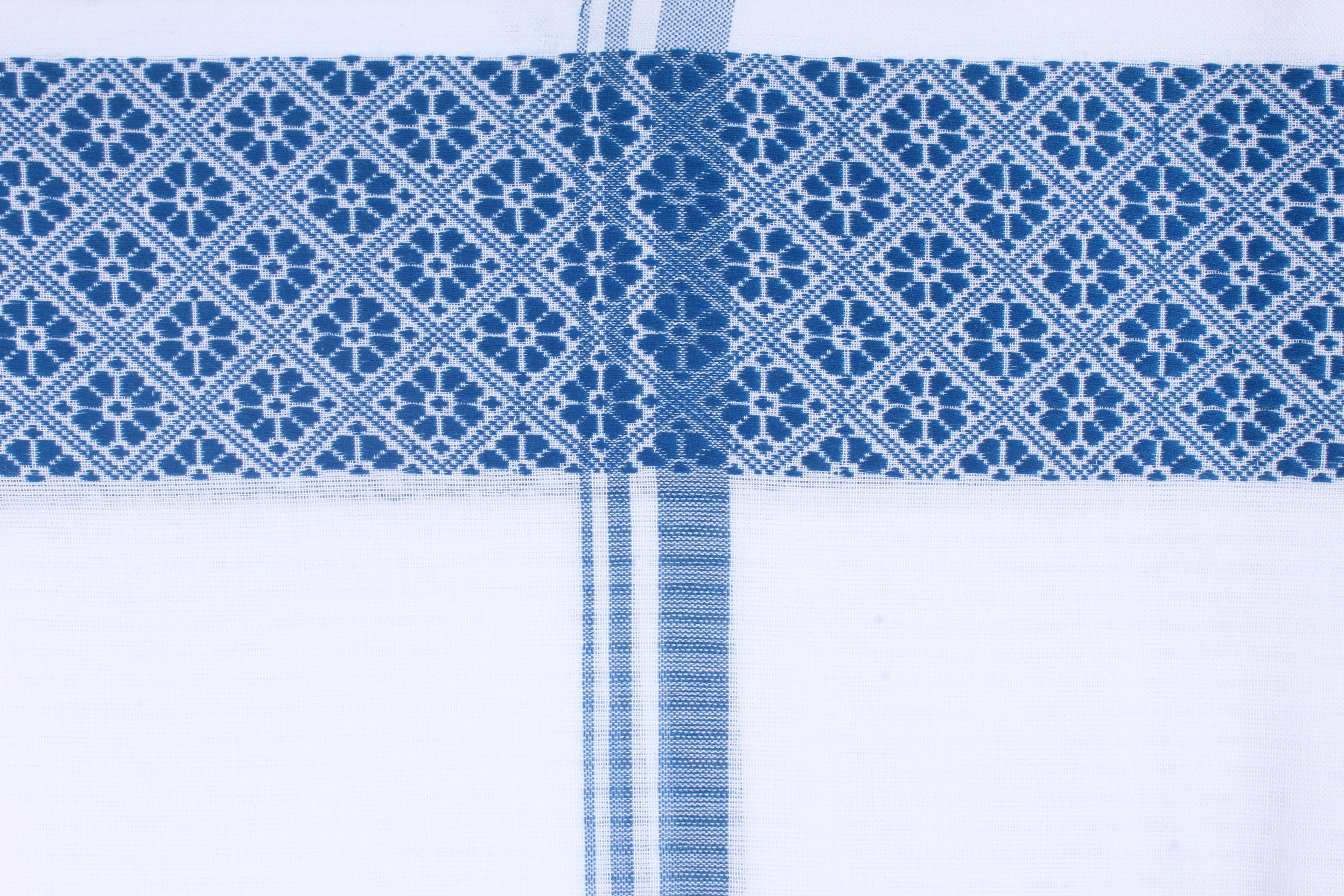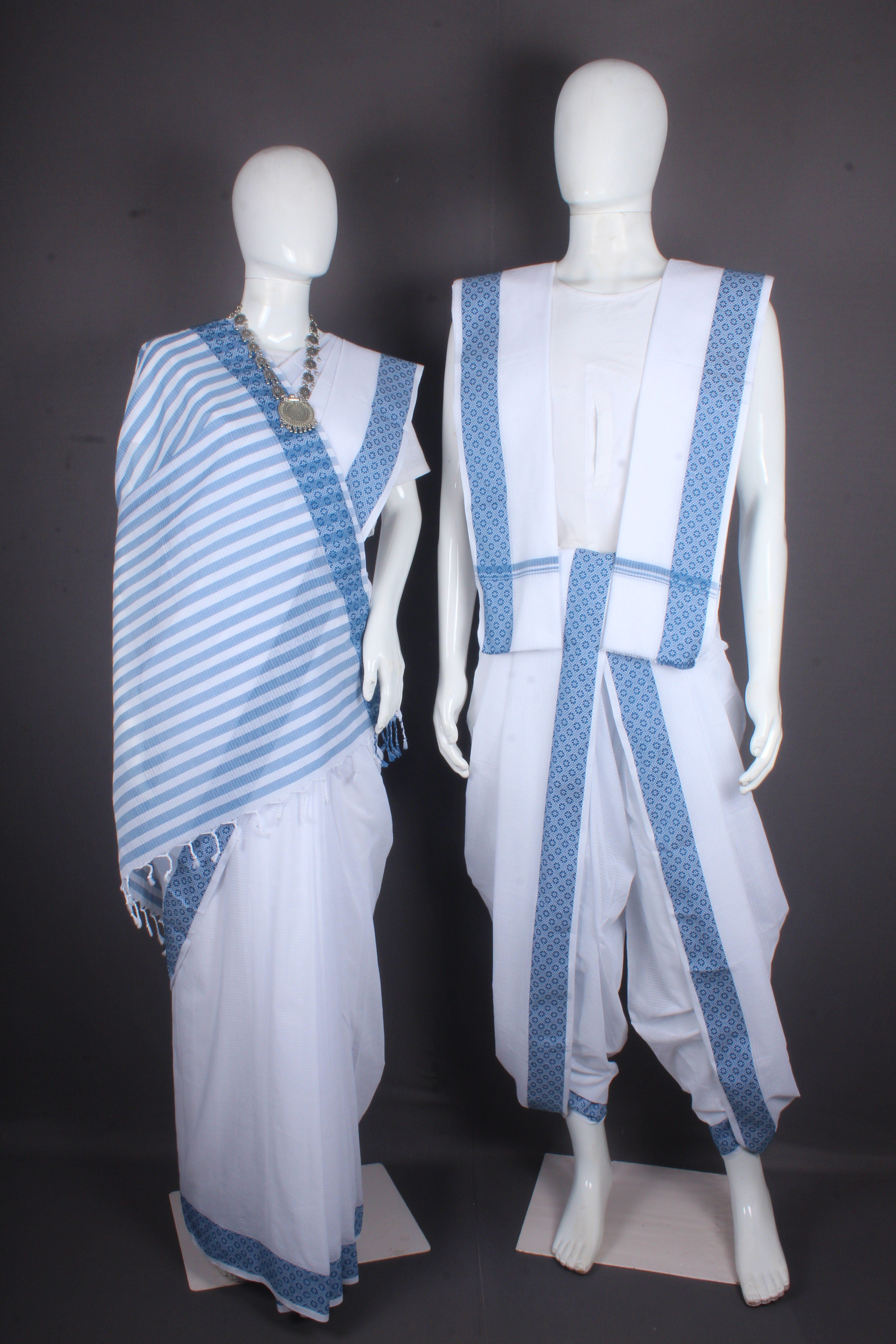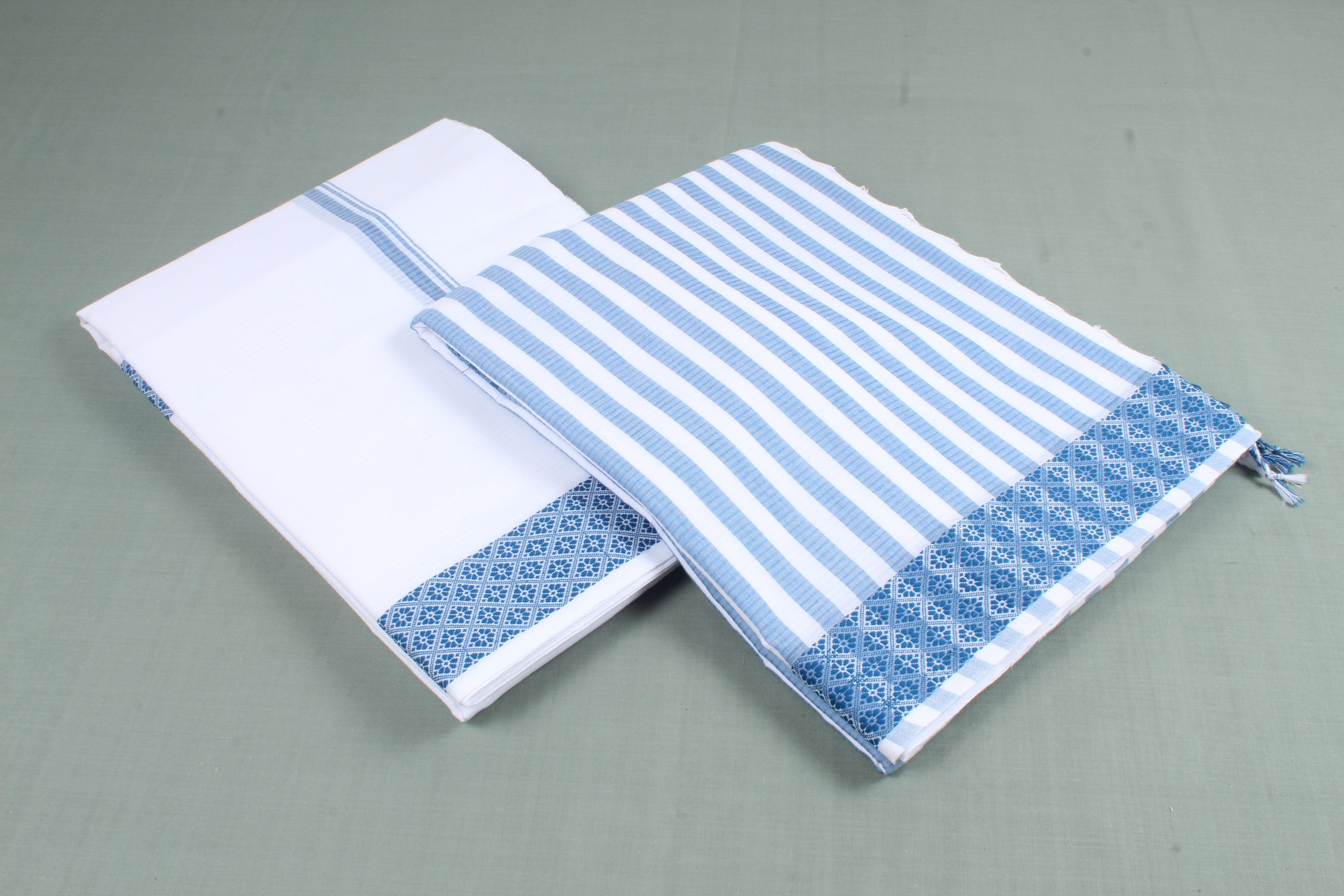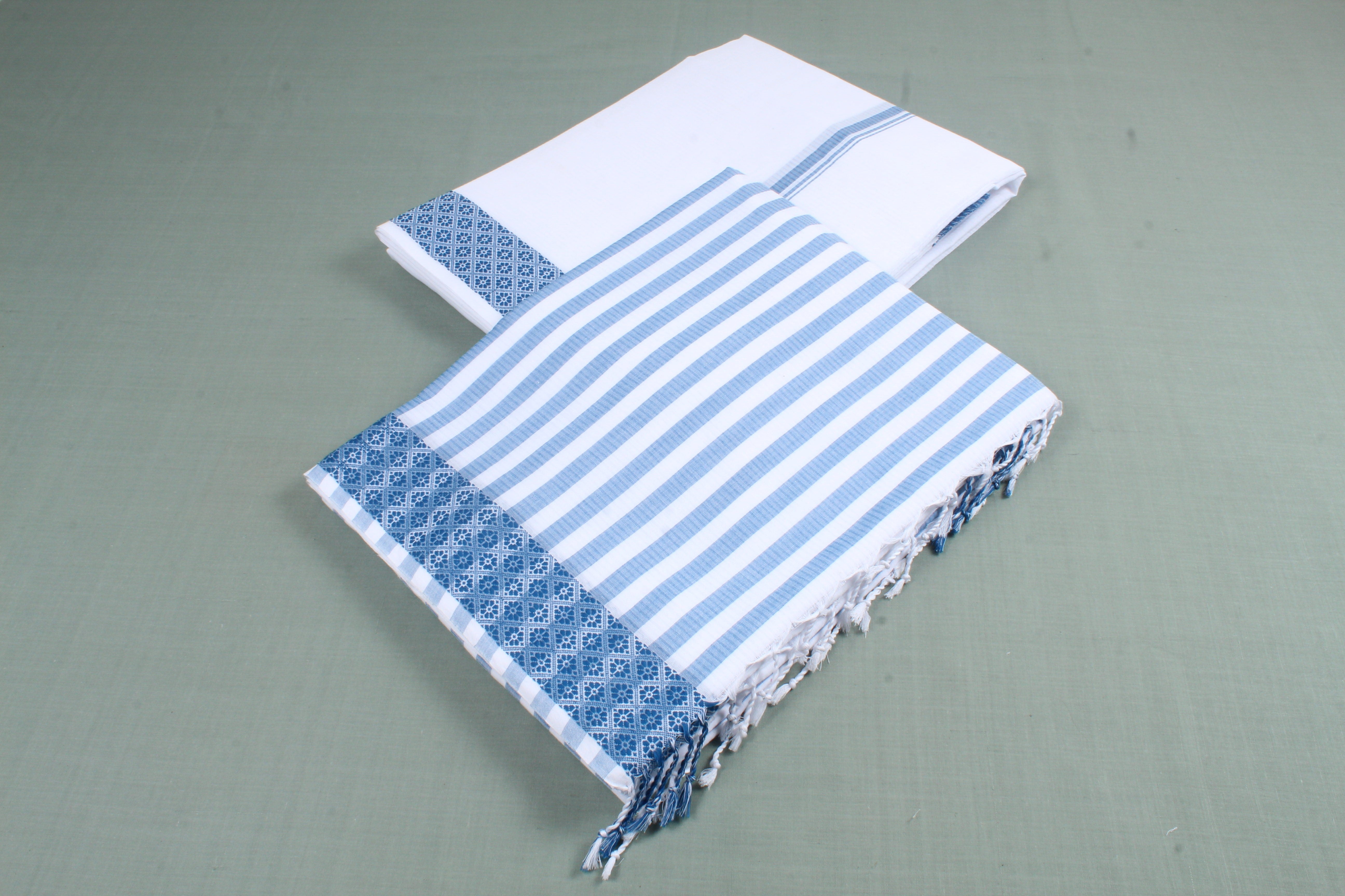 Traditional Handloom Joda Set in White with Self Striped and Sky Blue Dobby Border