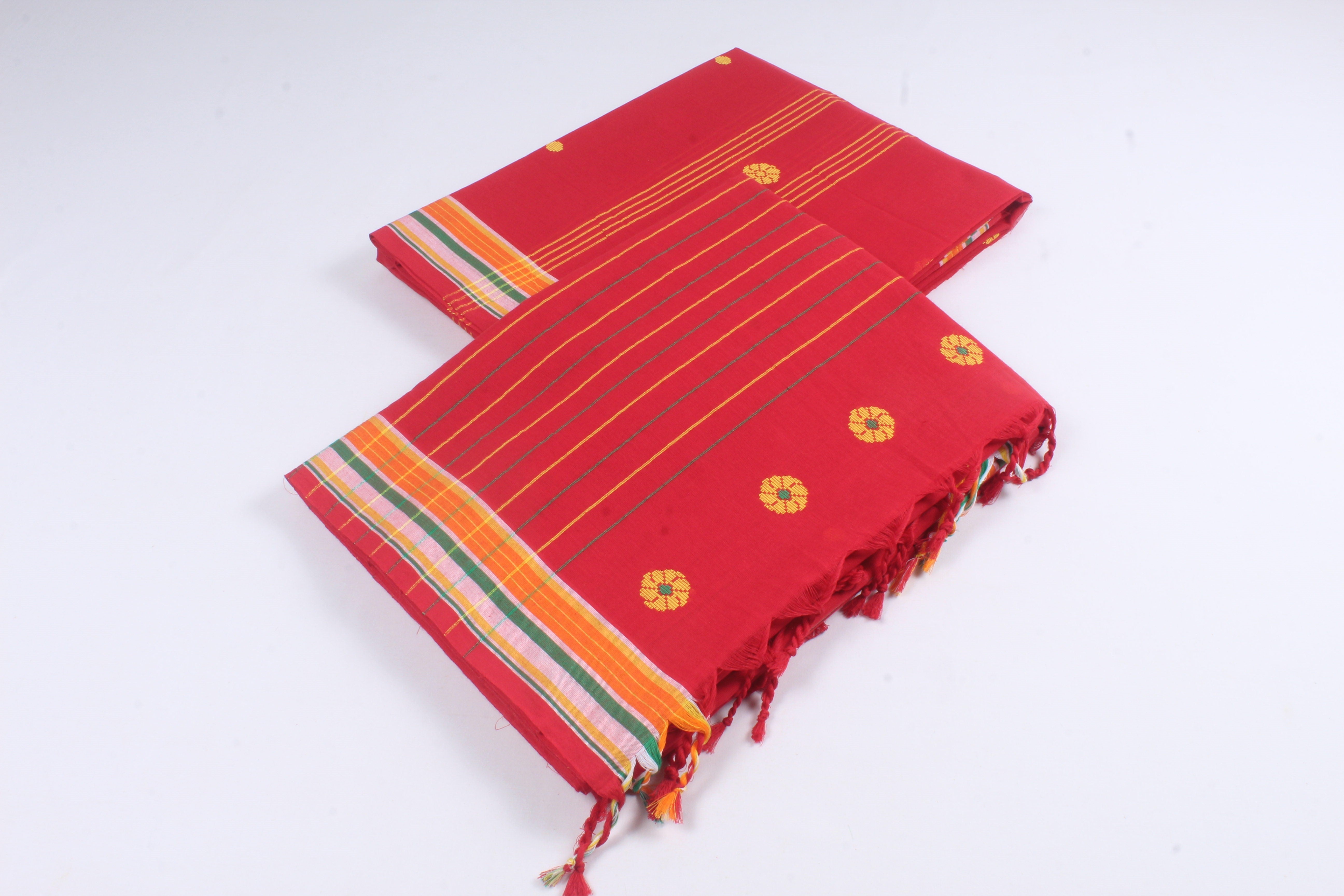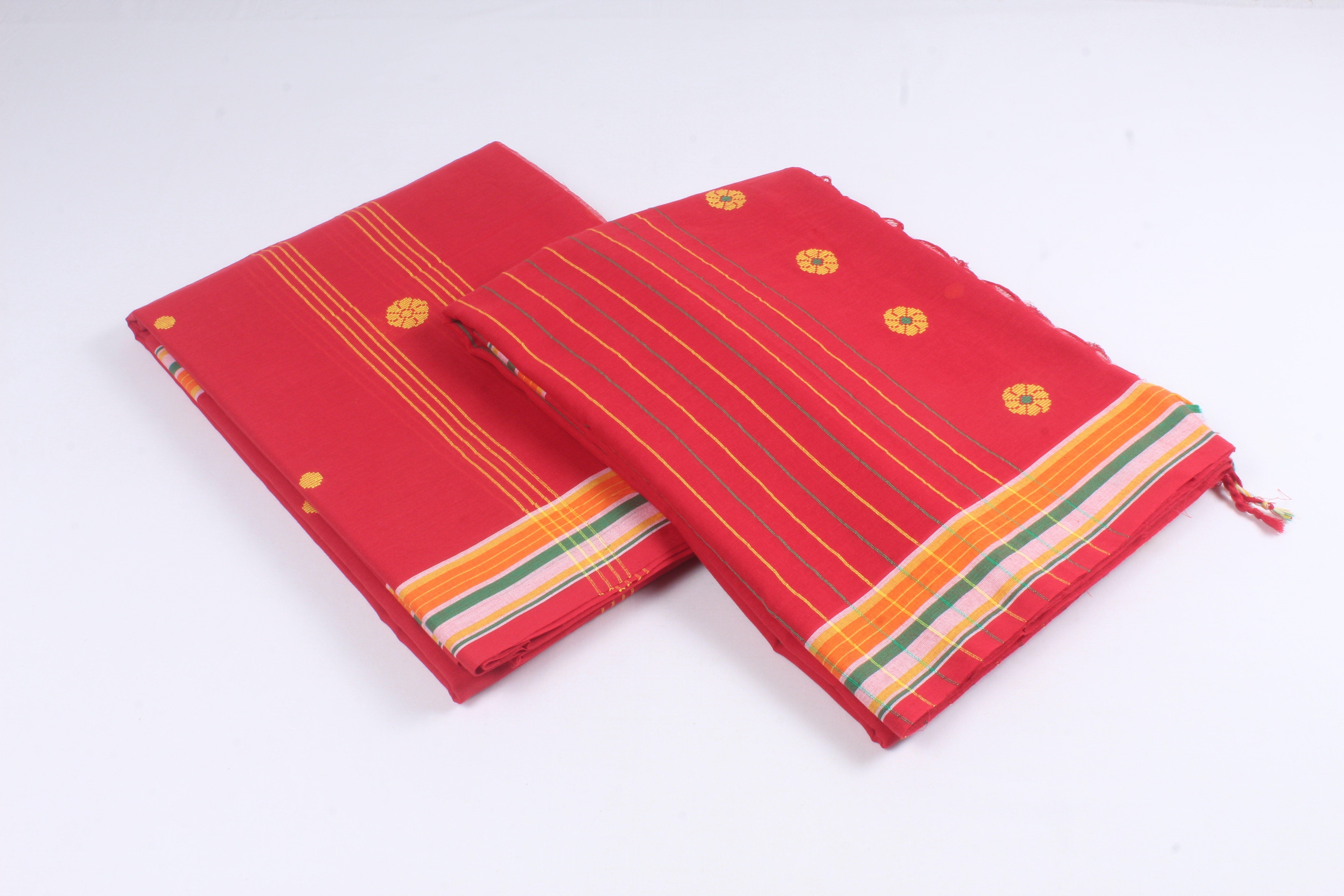 Traditional Handloom Joda Set in Red with Buti and Multi color Border