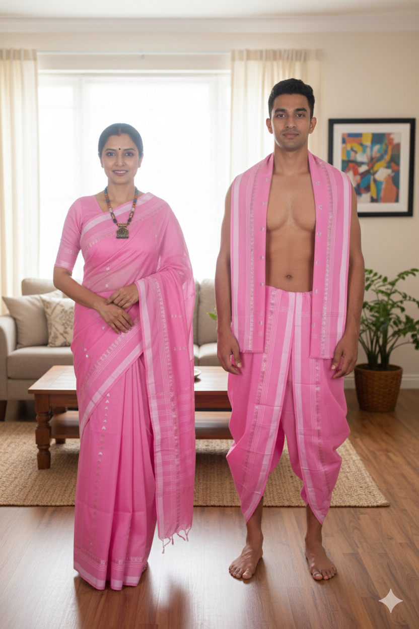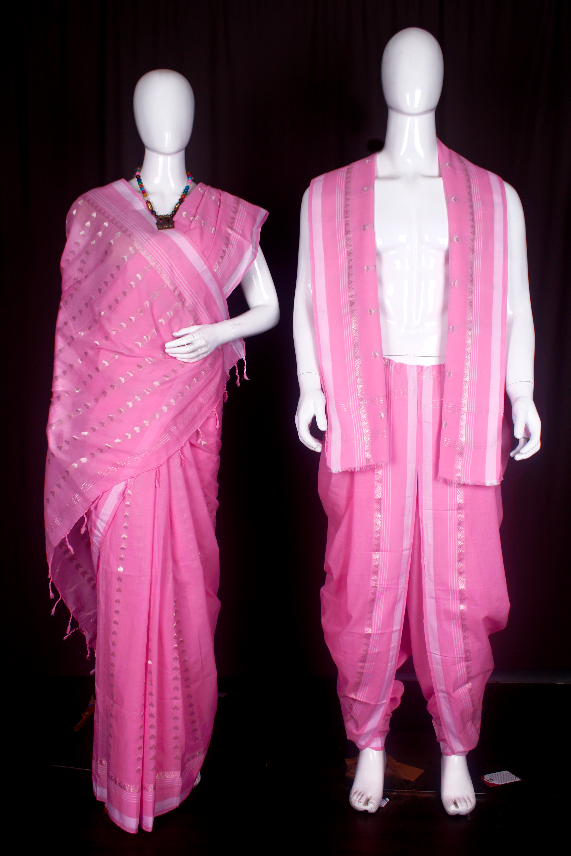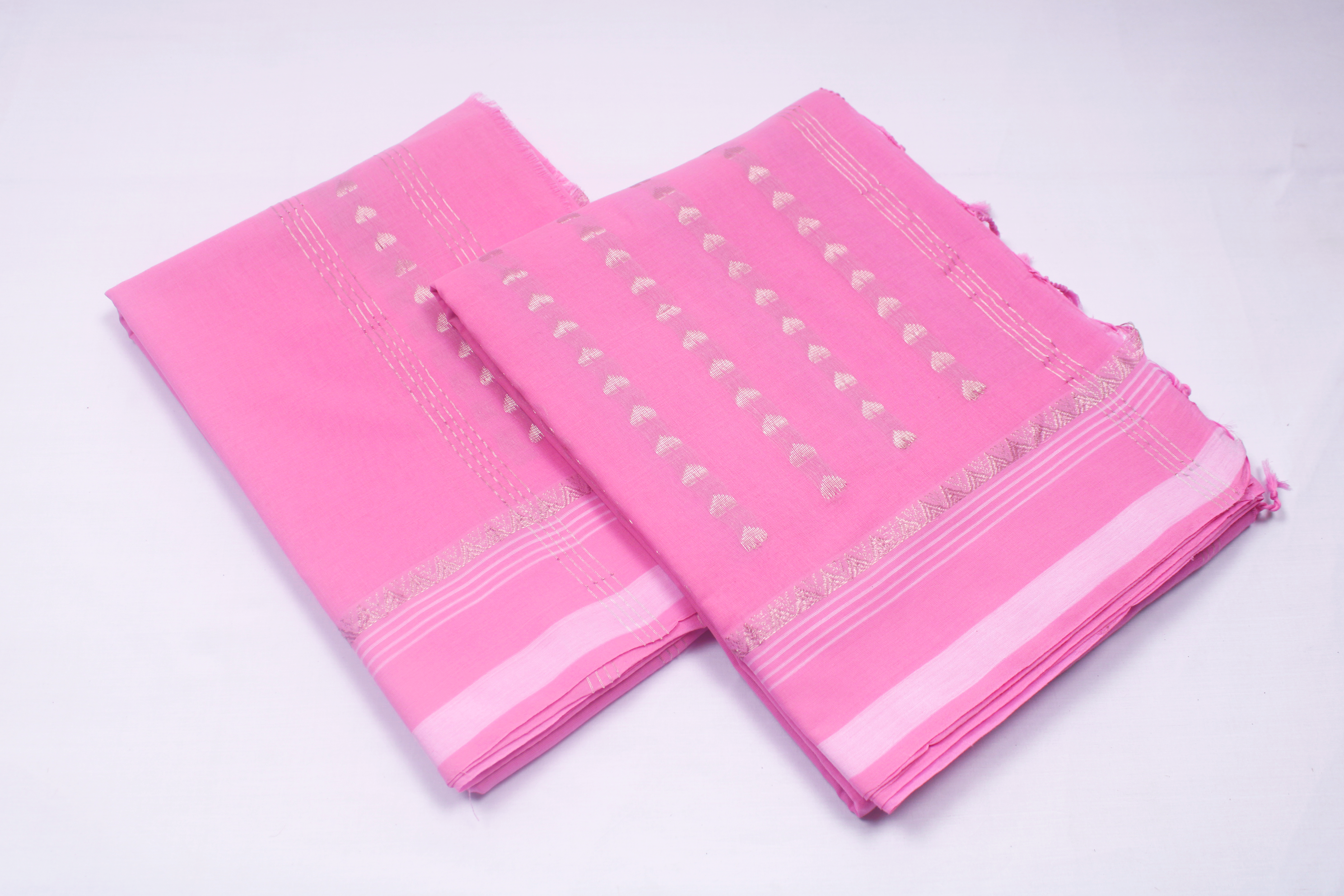 Pink Dobby Couple Set with White and Silver Zari Border and Striped Butis