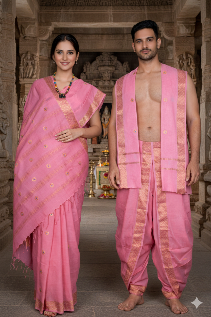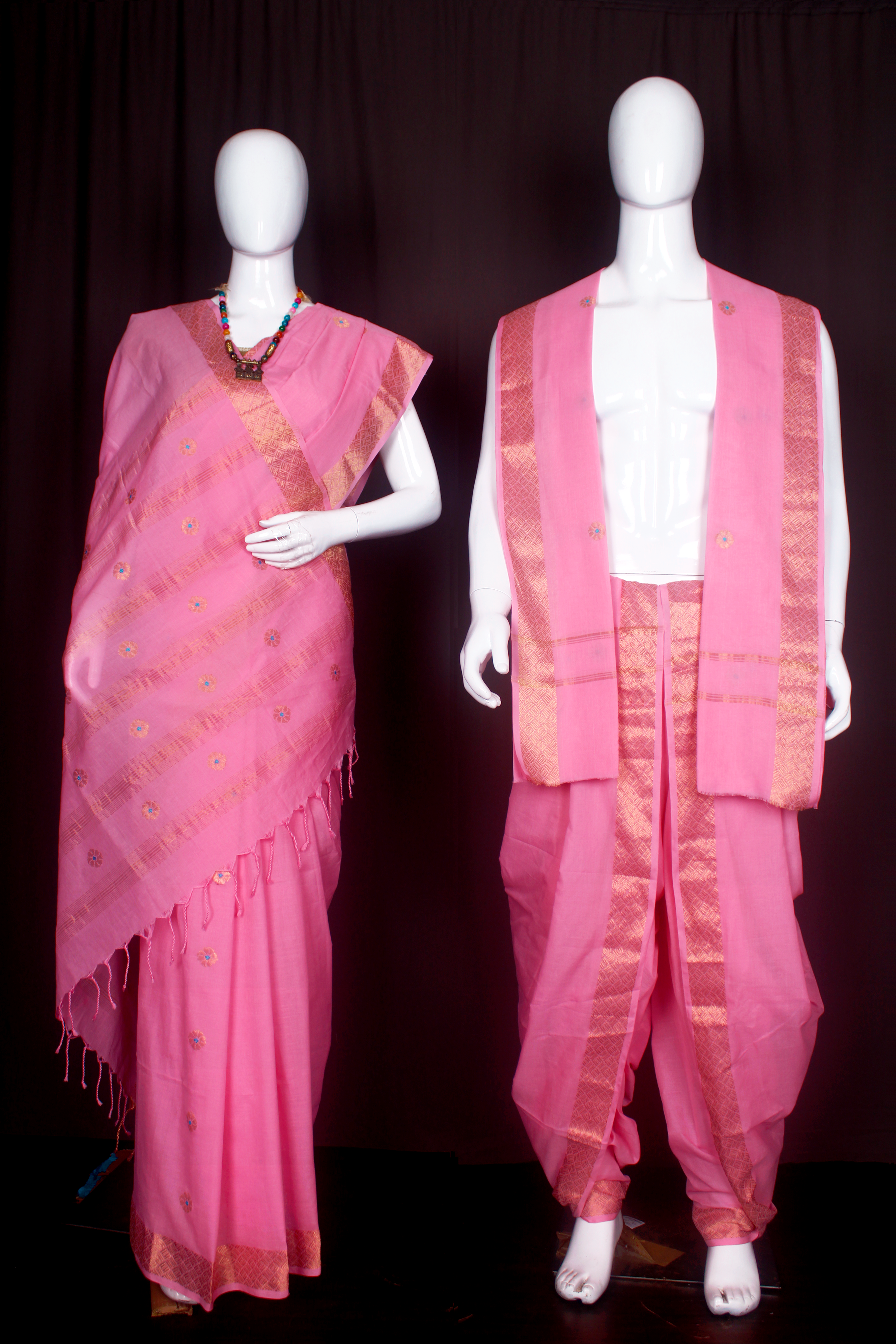 This set includes a dhoti and dupatta for the man and a saree with a blouse piece for the woman, all crafted from the finest quality cotton.