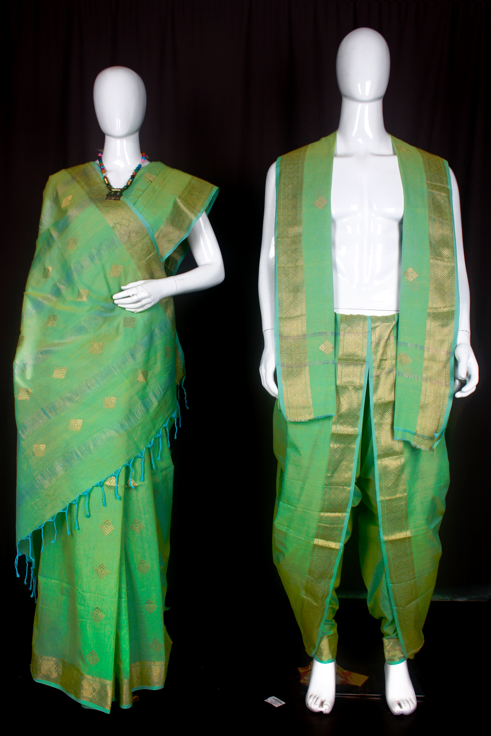 This set includes a dhoti and dupatta for the man and a saree with a blouse piece for the woman, all crafted from the finest quality cotton.