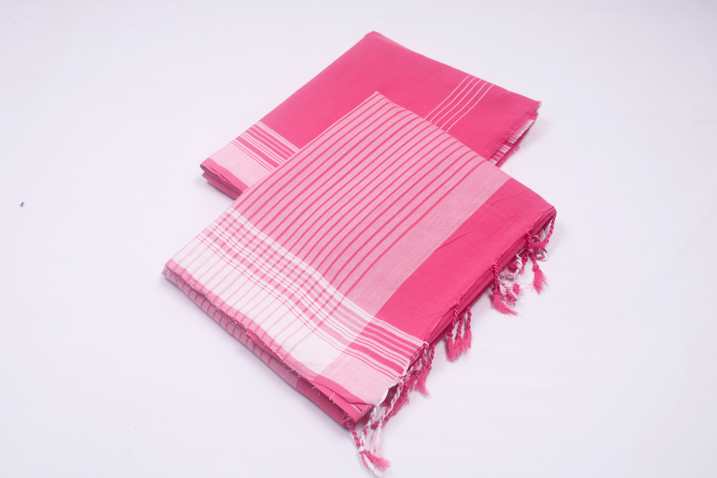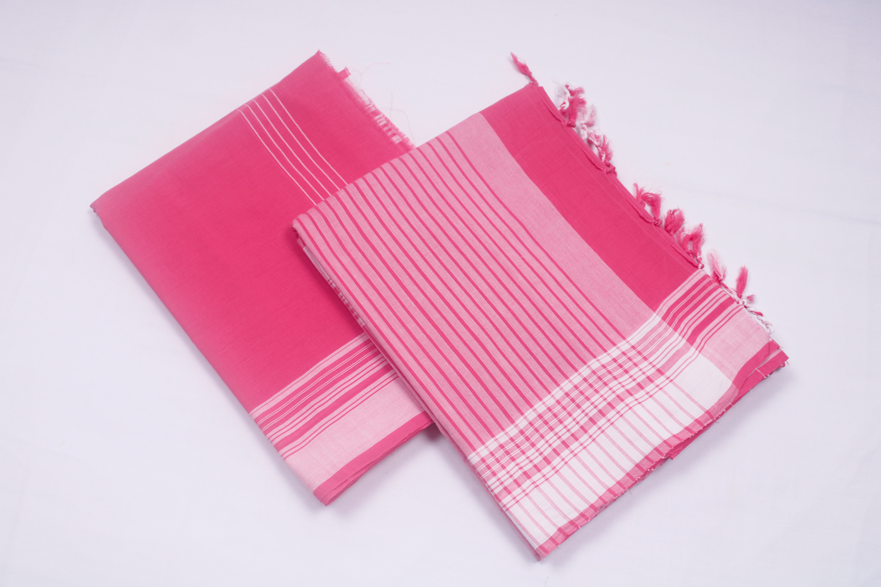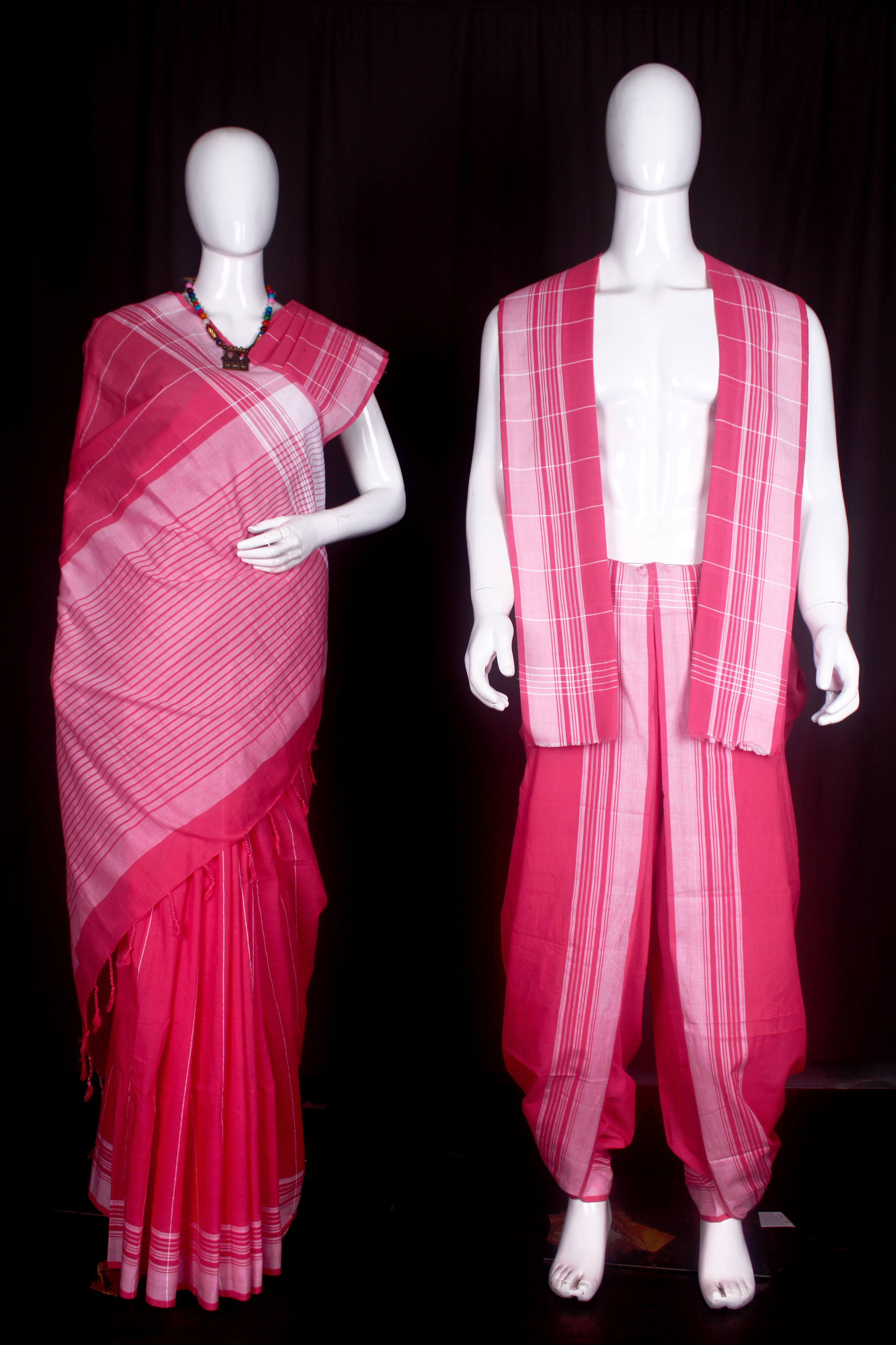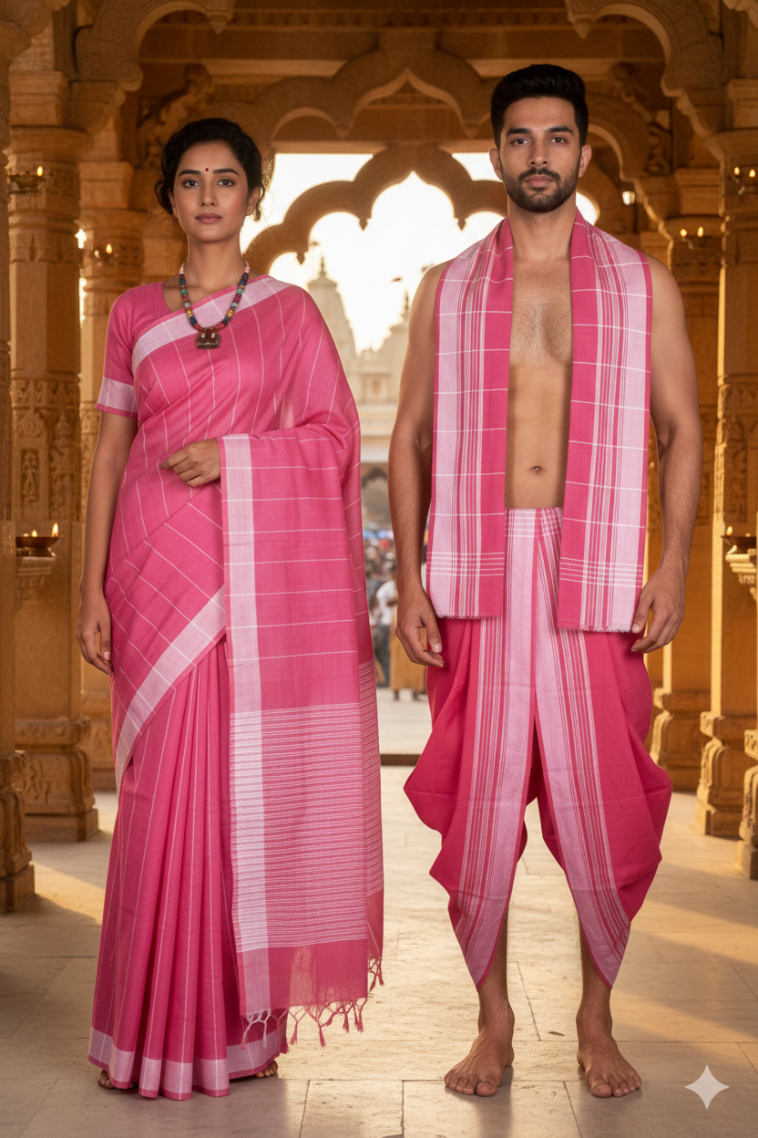 This set includes a dhoti and dupatta for the man and a saree with a blouse piece for the woman, all crafted from the finest quality cotton.
