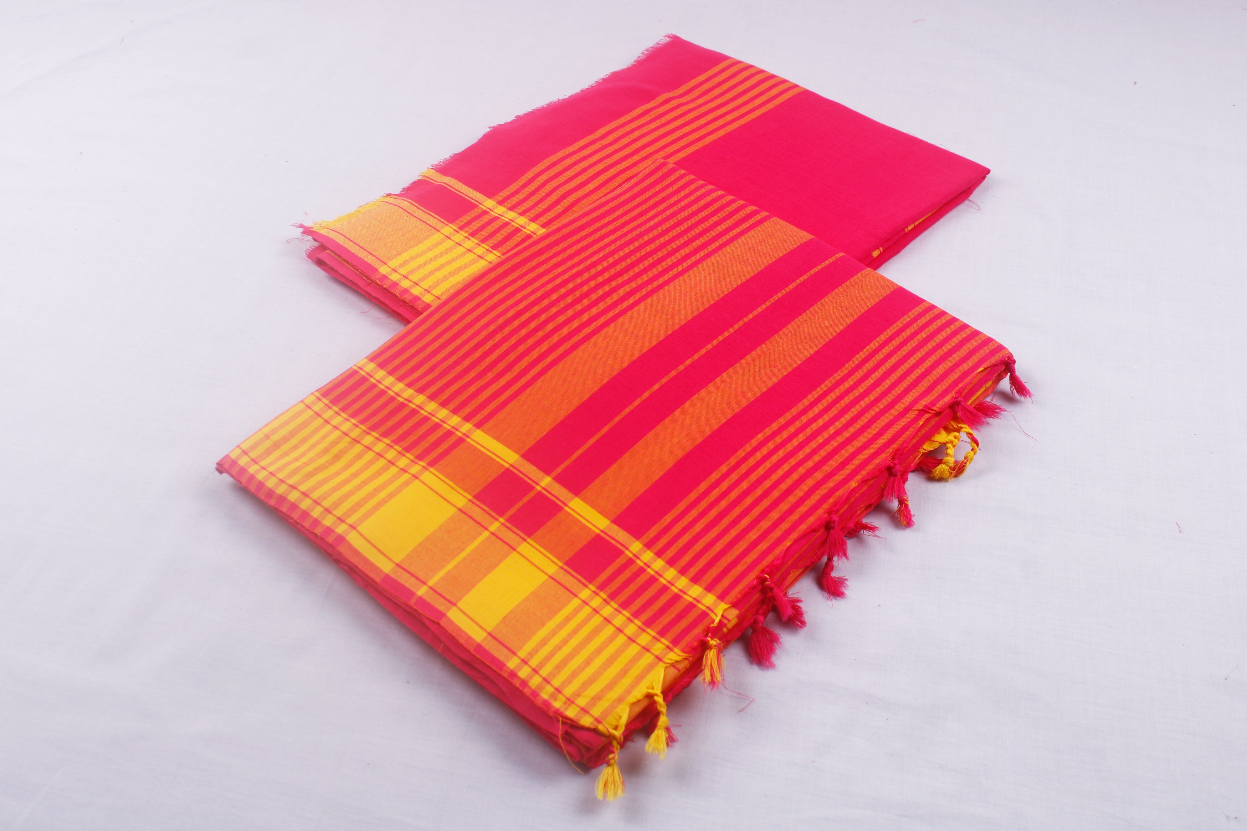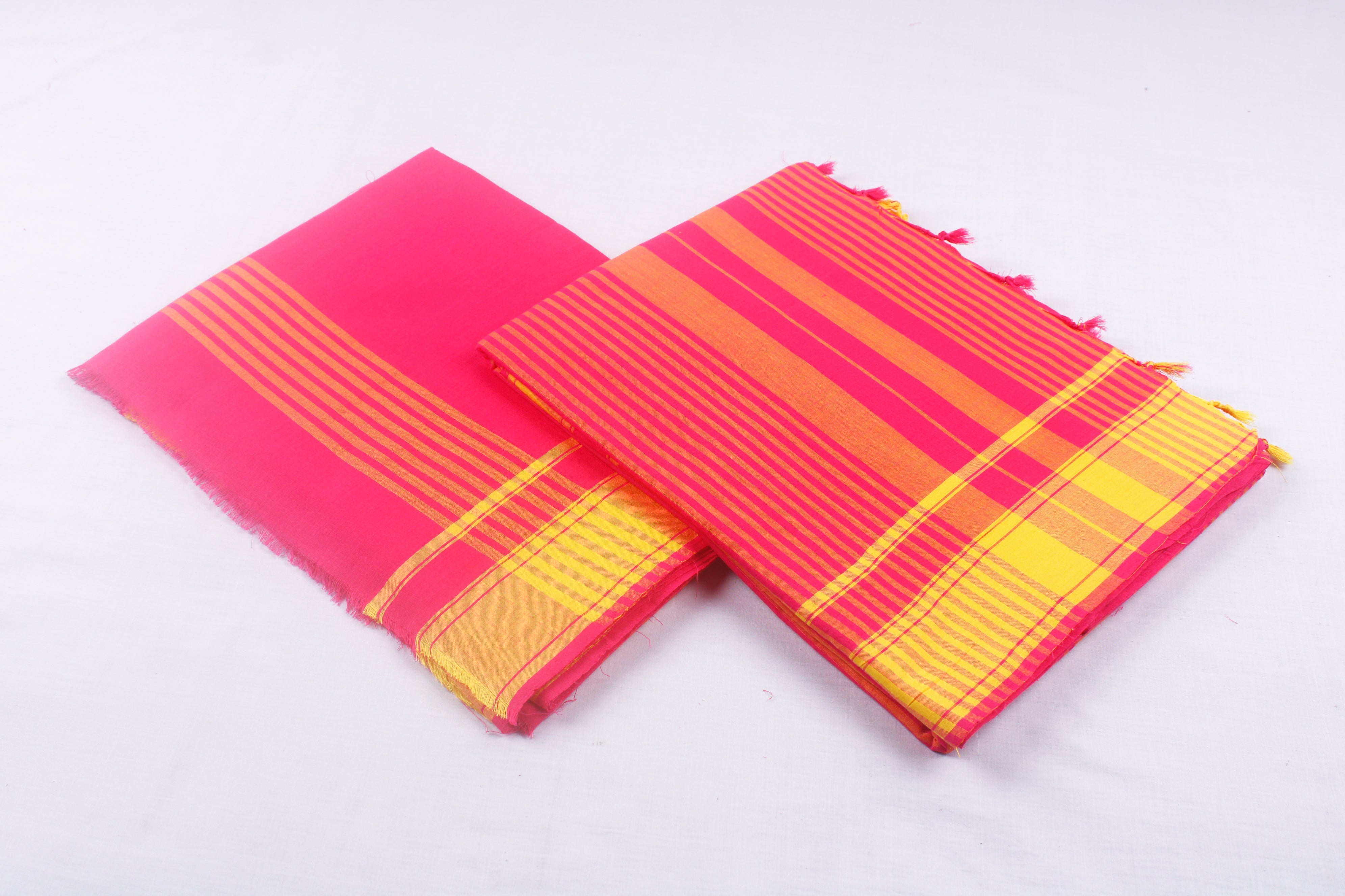 This set includes a dhoti and dupatta for the man and a saree with a blouse piece for the woman, all crafted from the finest quality cotton.