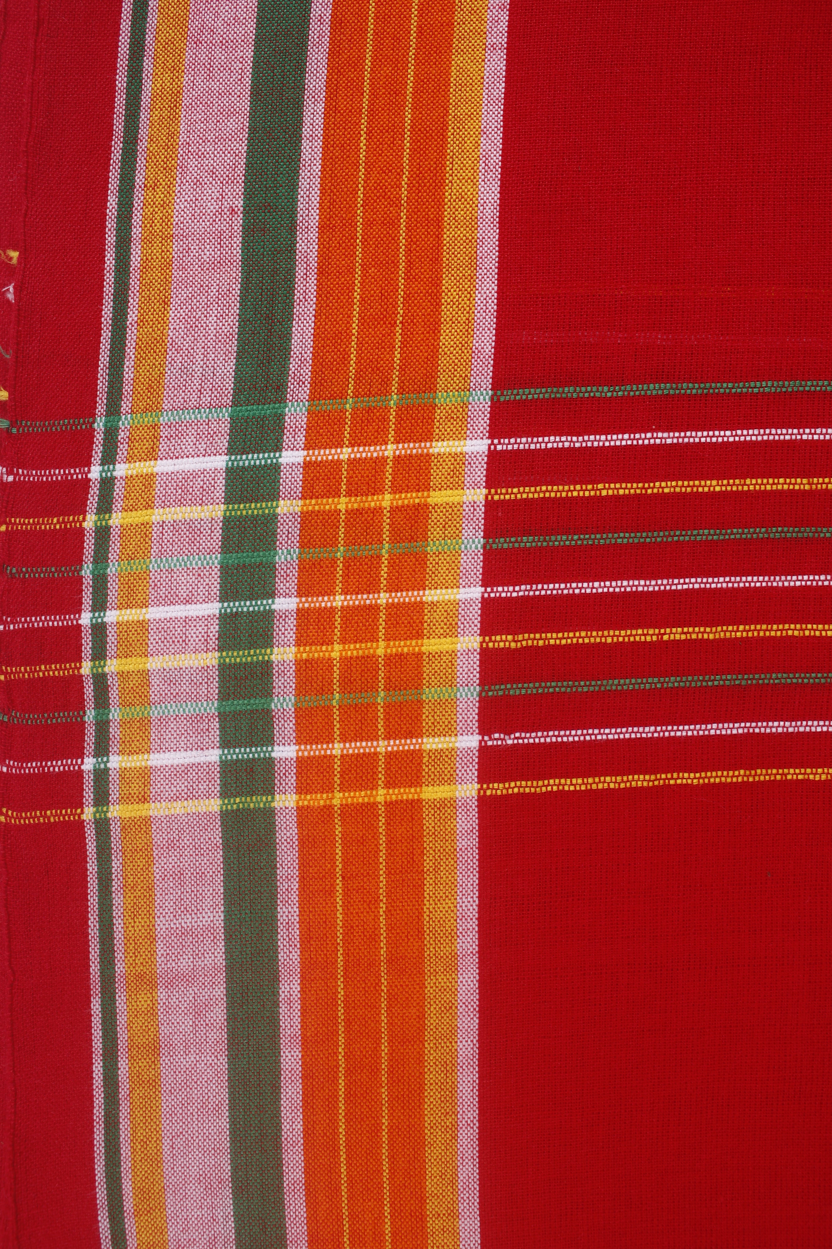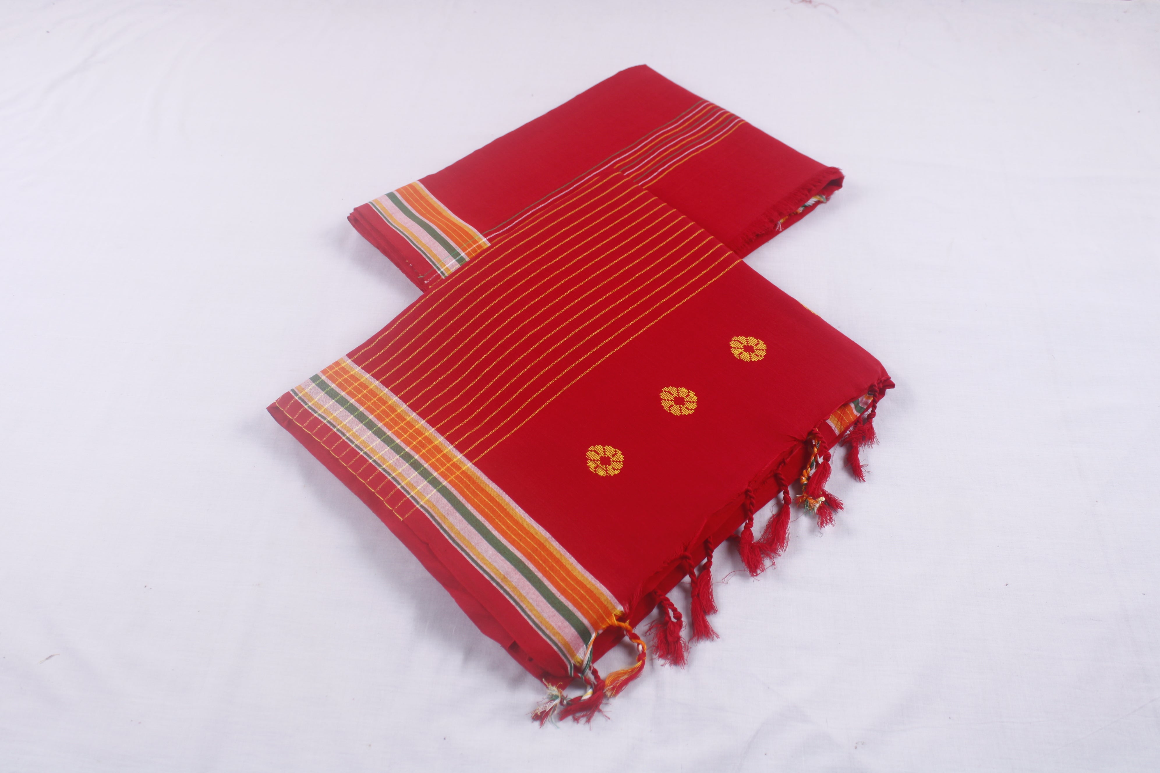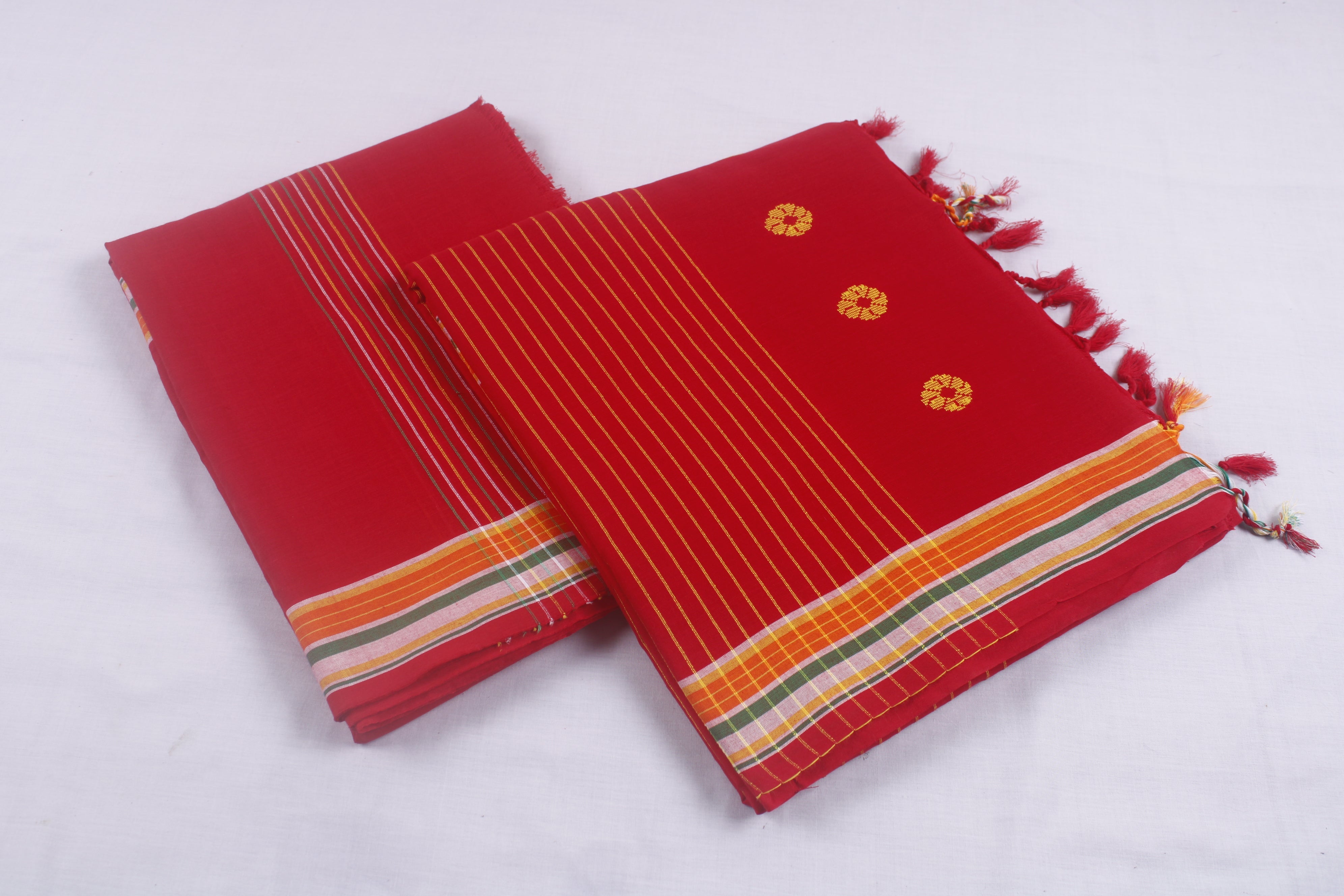 Red Couple Set with White, Green, Orange and Yellow Border and Butis in Saree