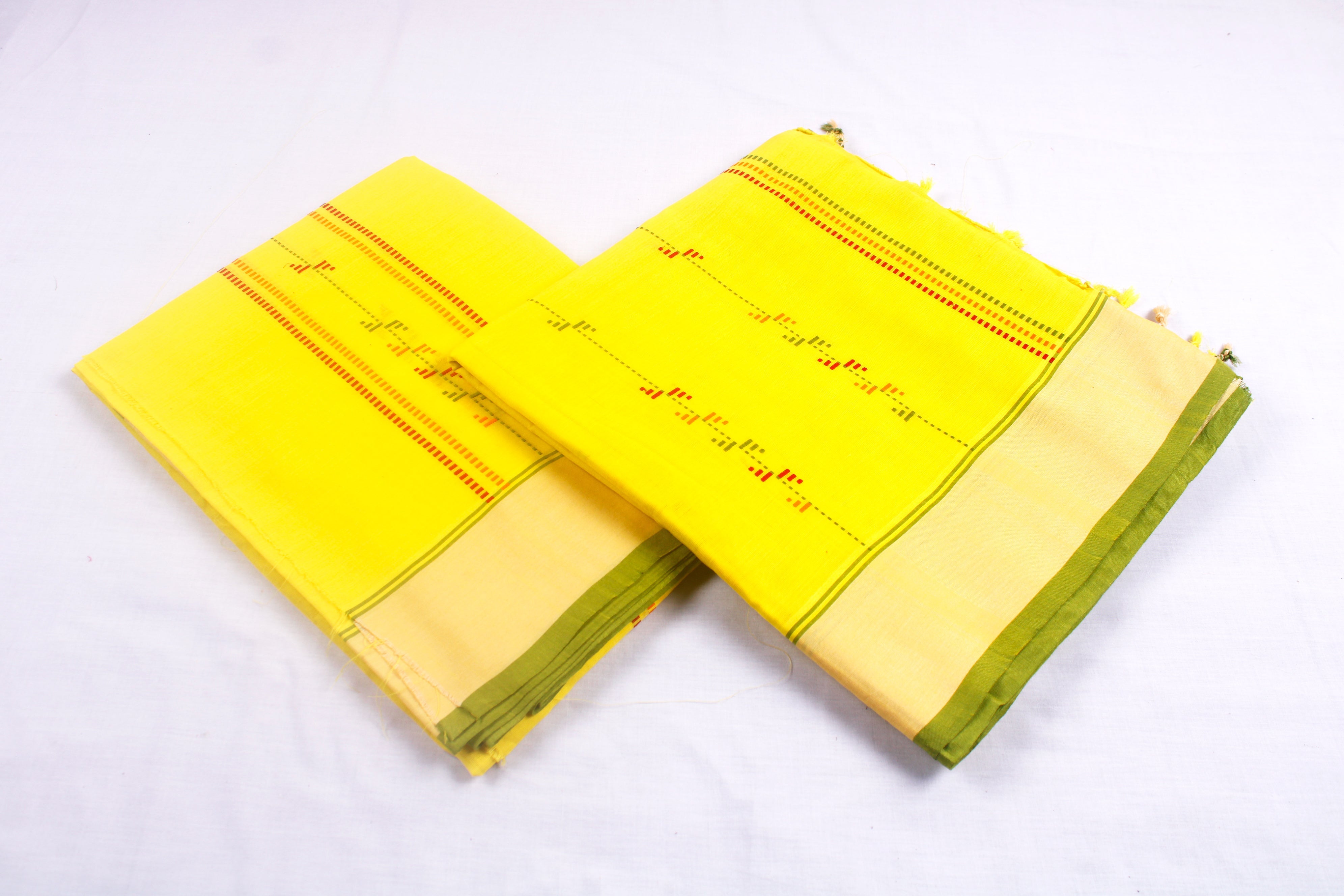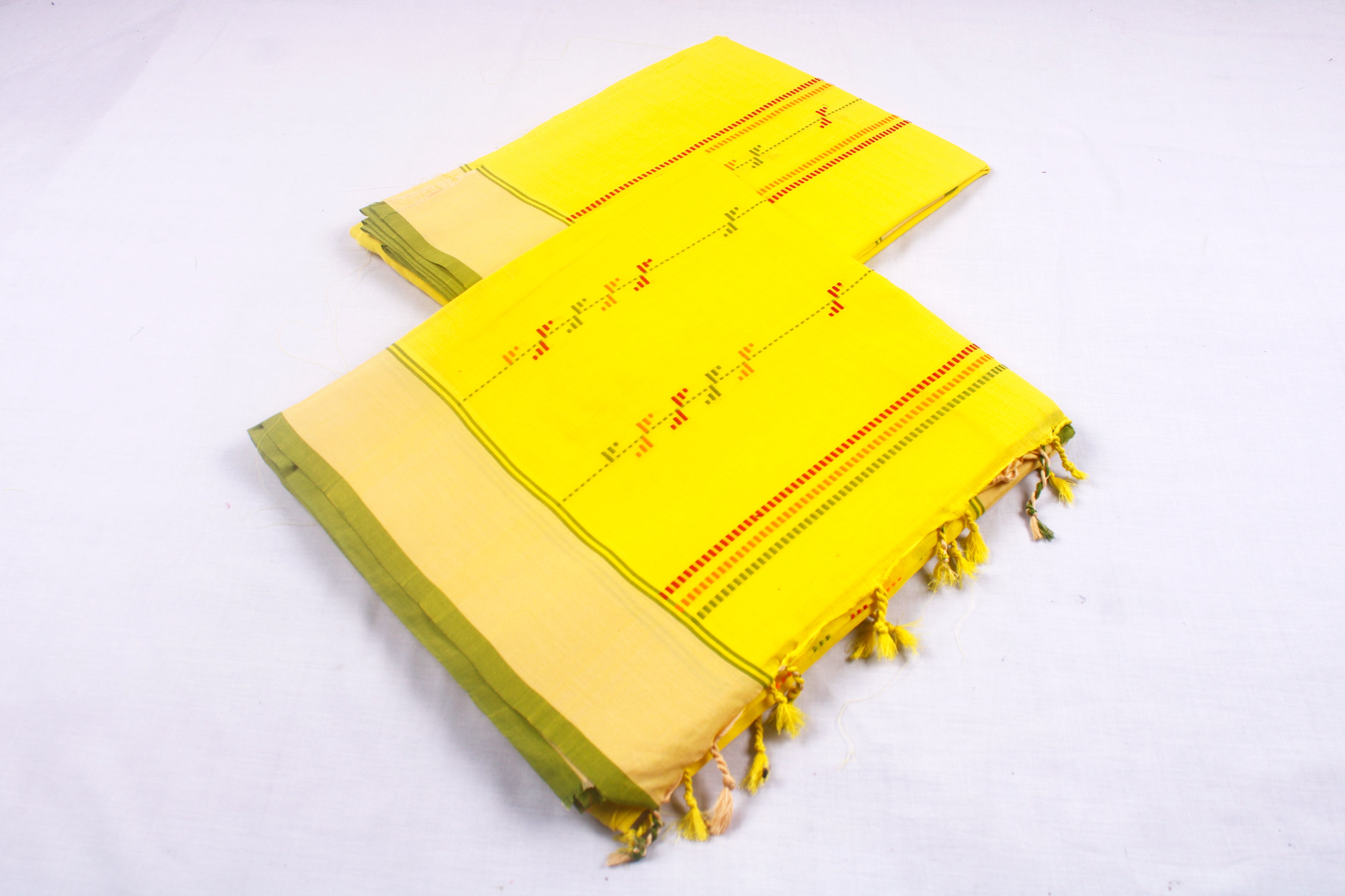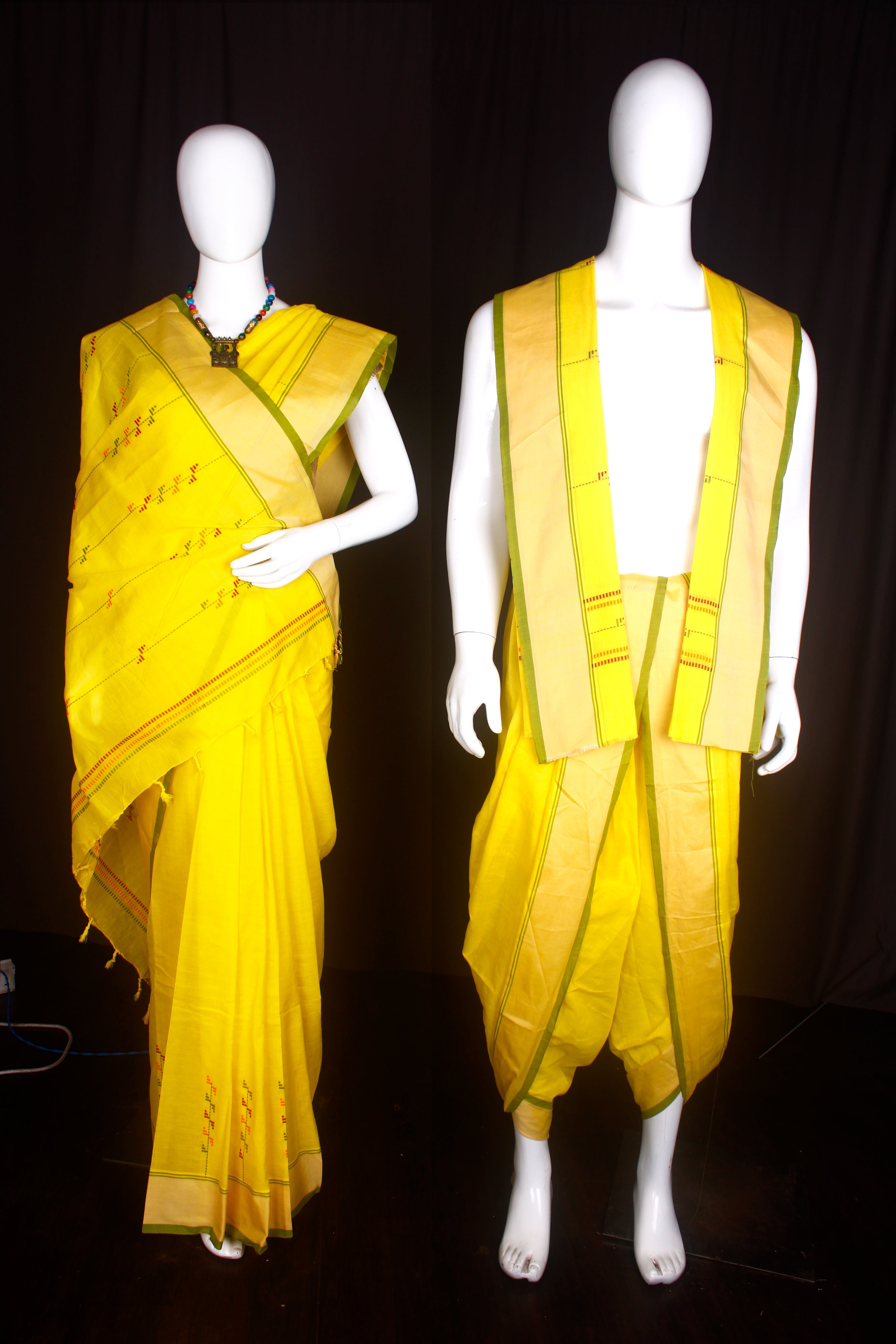 This set includes a dhoti and dupatta for the man and a saree with a blouse piece for the woman, all crafted from the finest quality cotton.