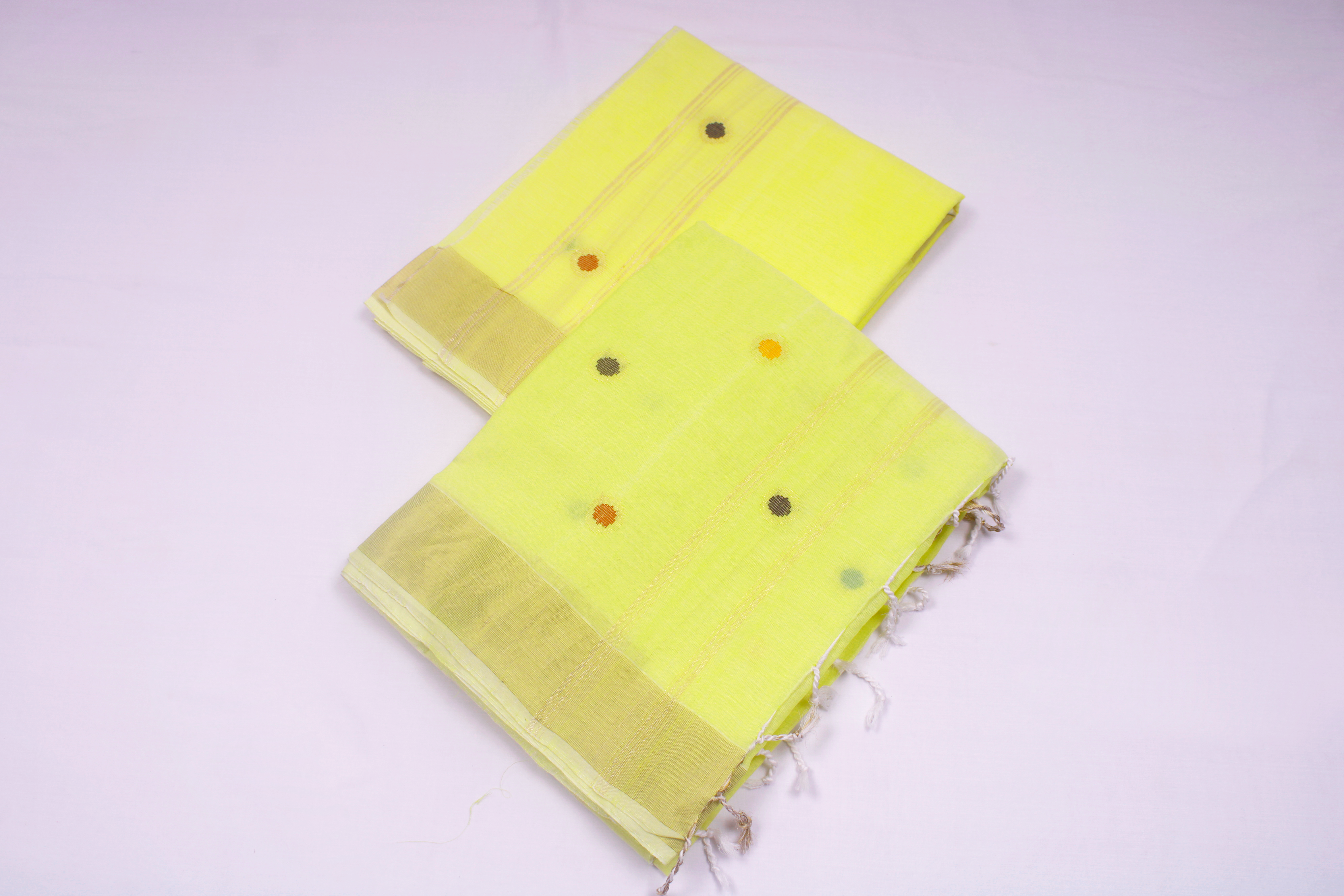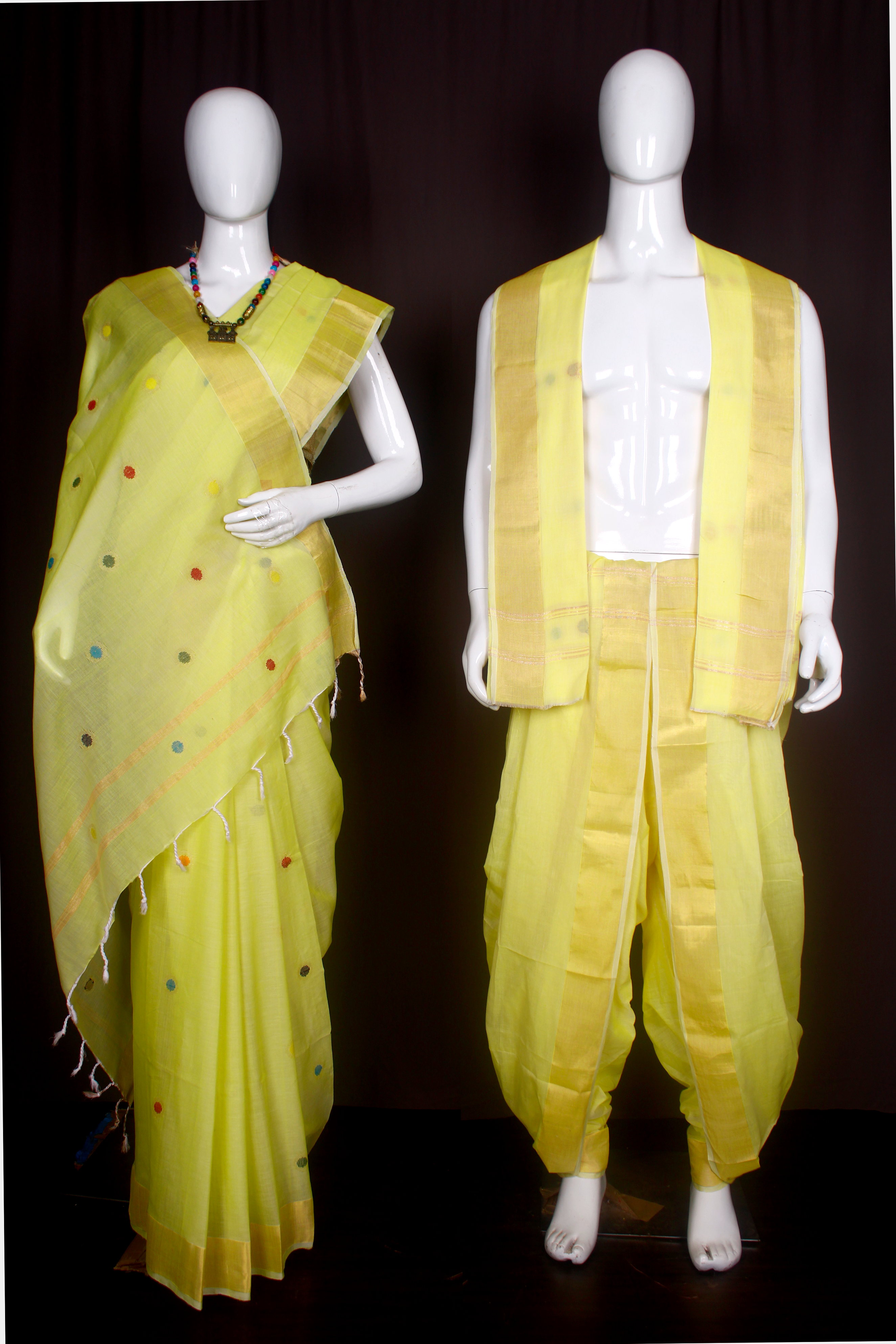 Yellow Couple Set with Golden Zari Border and Multi Colour Butis