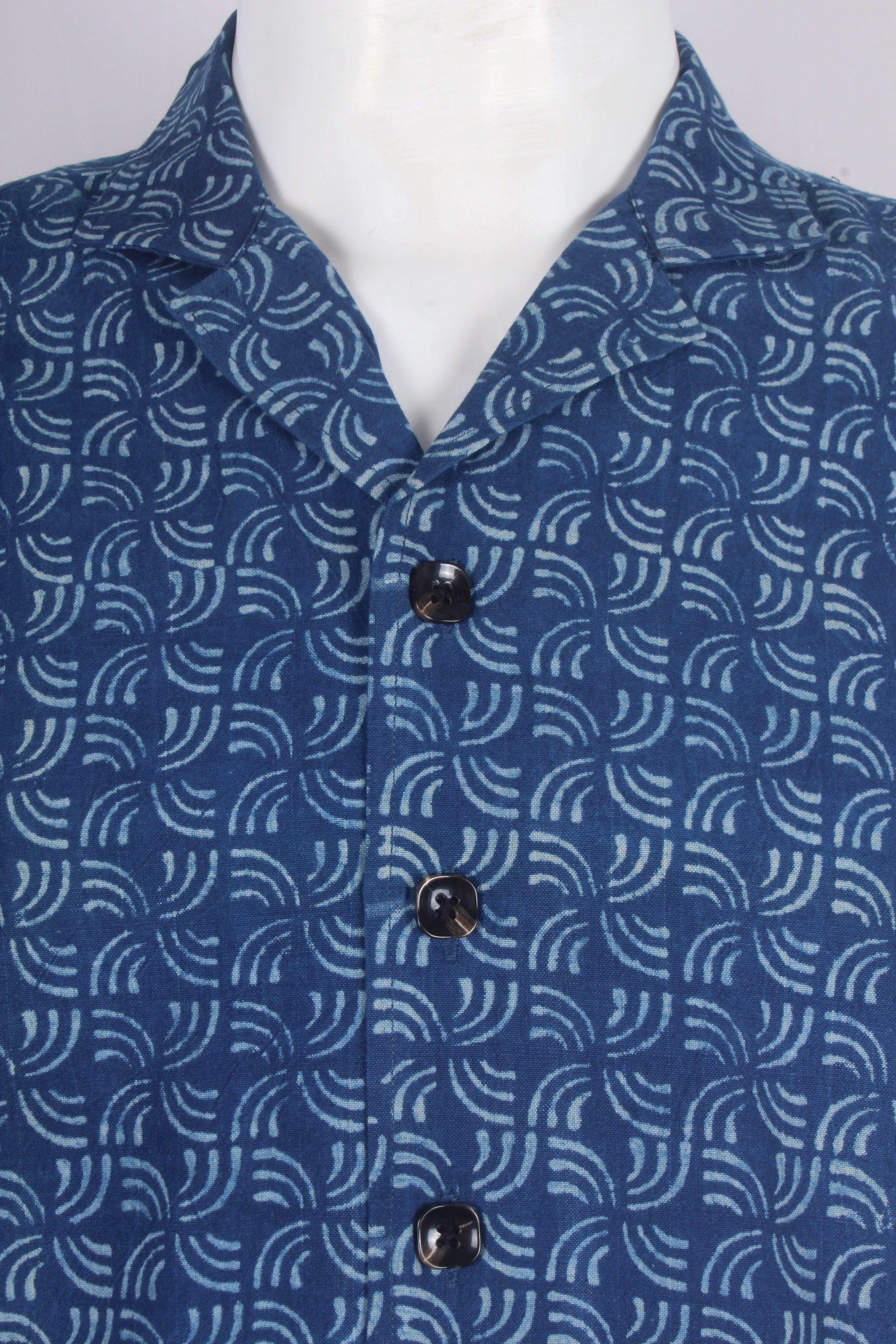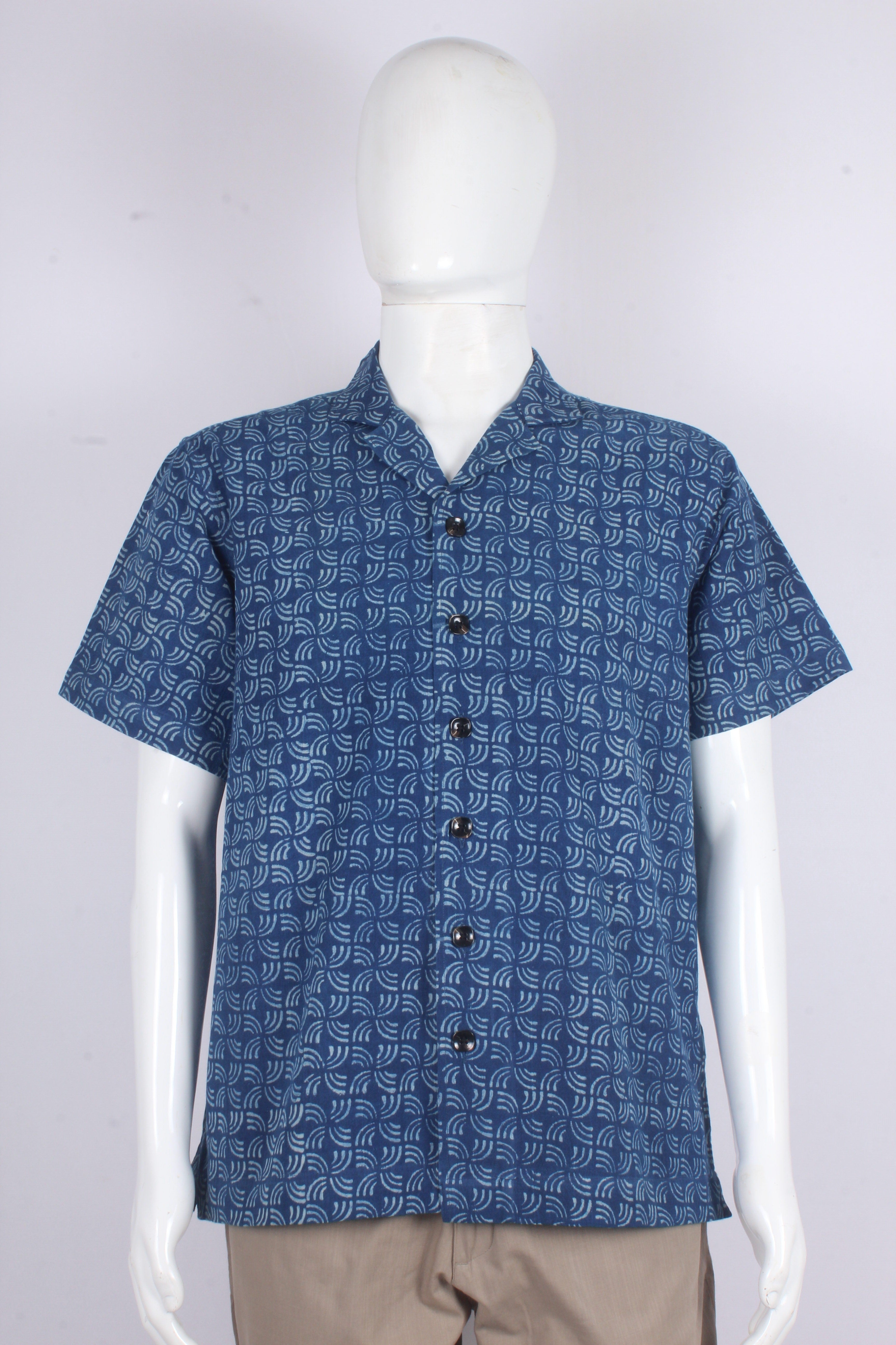 Elevate your casual wardrobe with this stylish Men's Indigo Blue Block Print Half-Sleeve Camp Collar Shirt. Crafted from breathable cotton, this shirt features a striking geometric pattern created using traditional hand block printing techniques in varying shades of indigo blue.