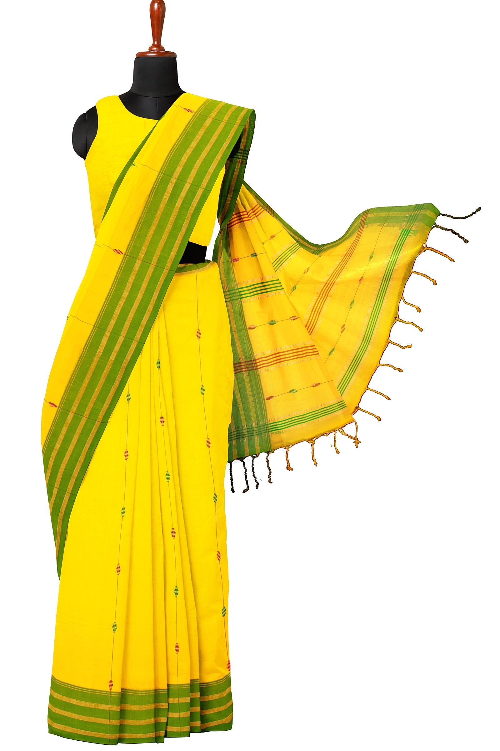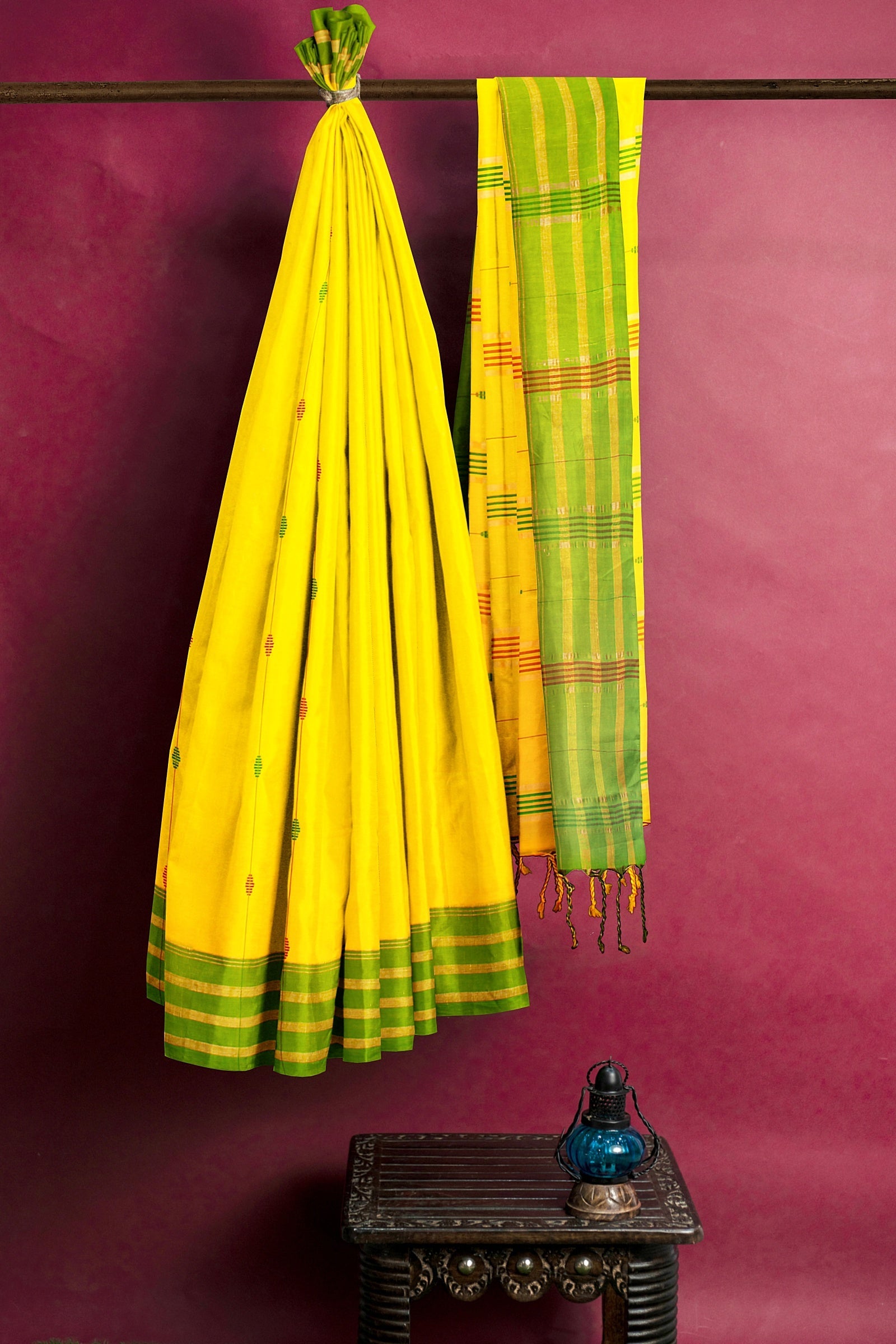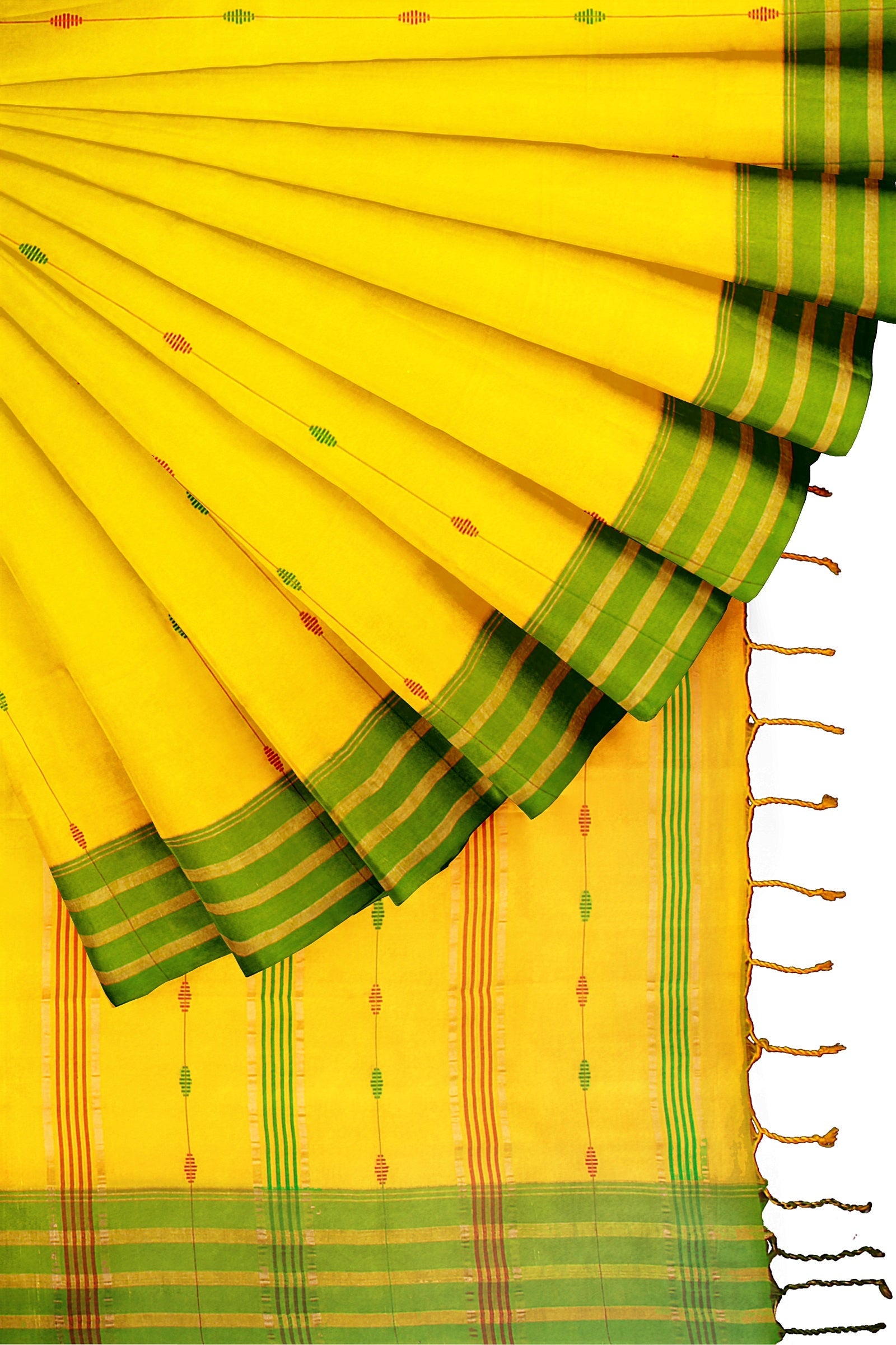 Yellow Saree with Red, Green and Golden Zari Border and Lined Butis