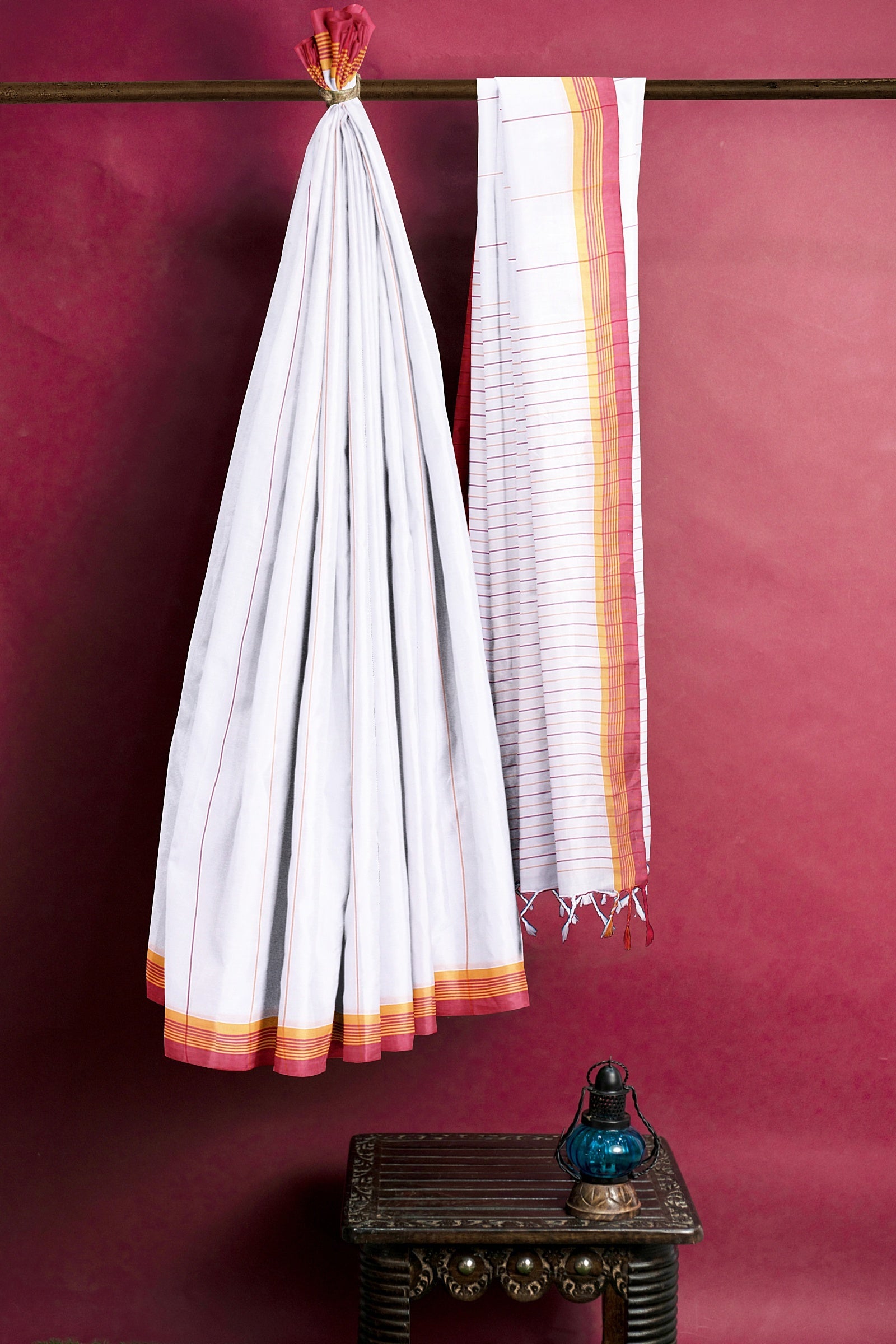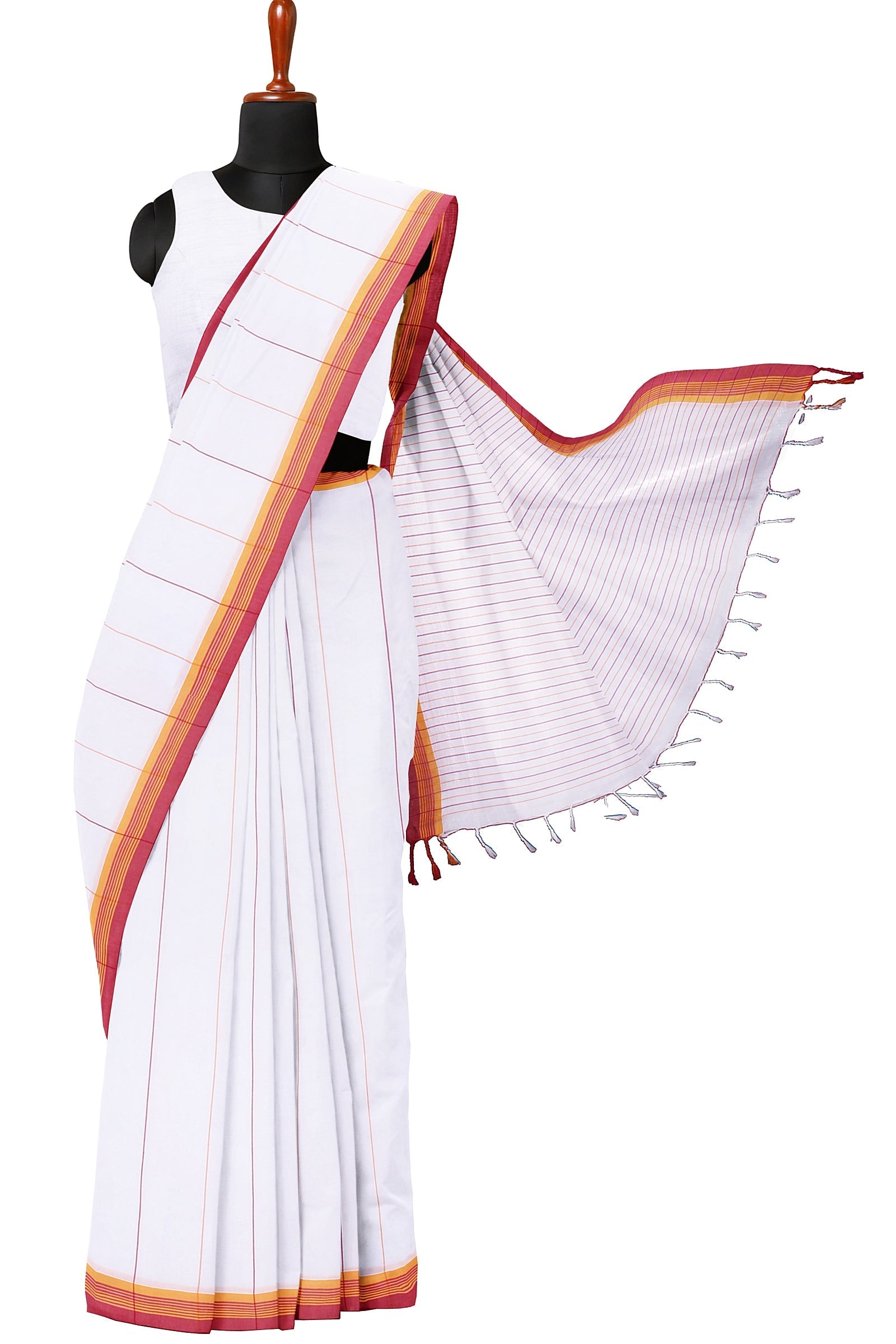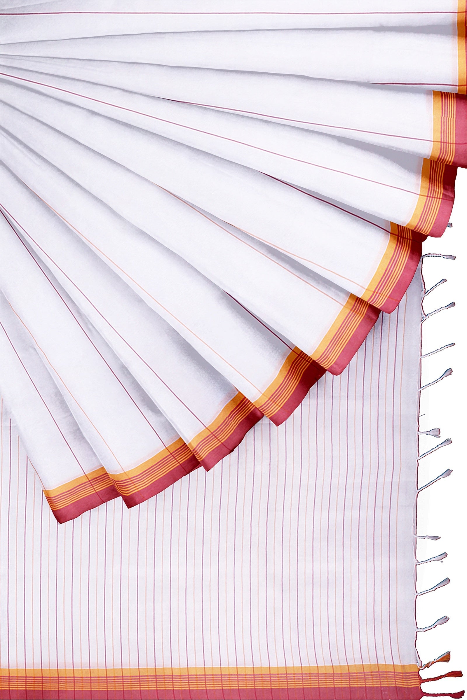 White Saree with Magenta and Yellow Linings and Border
