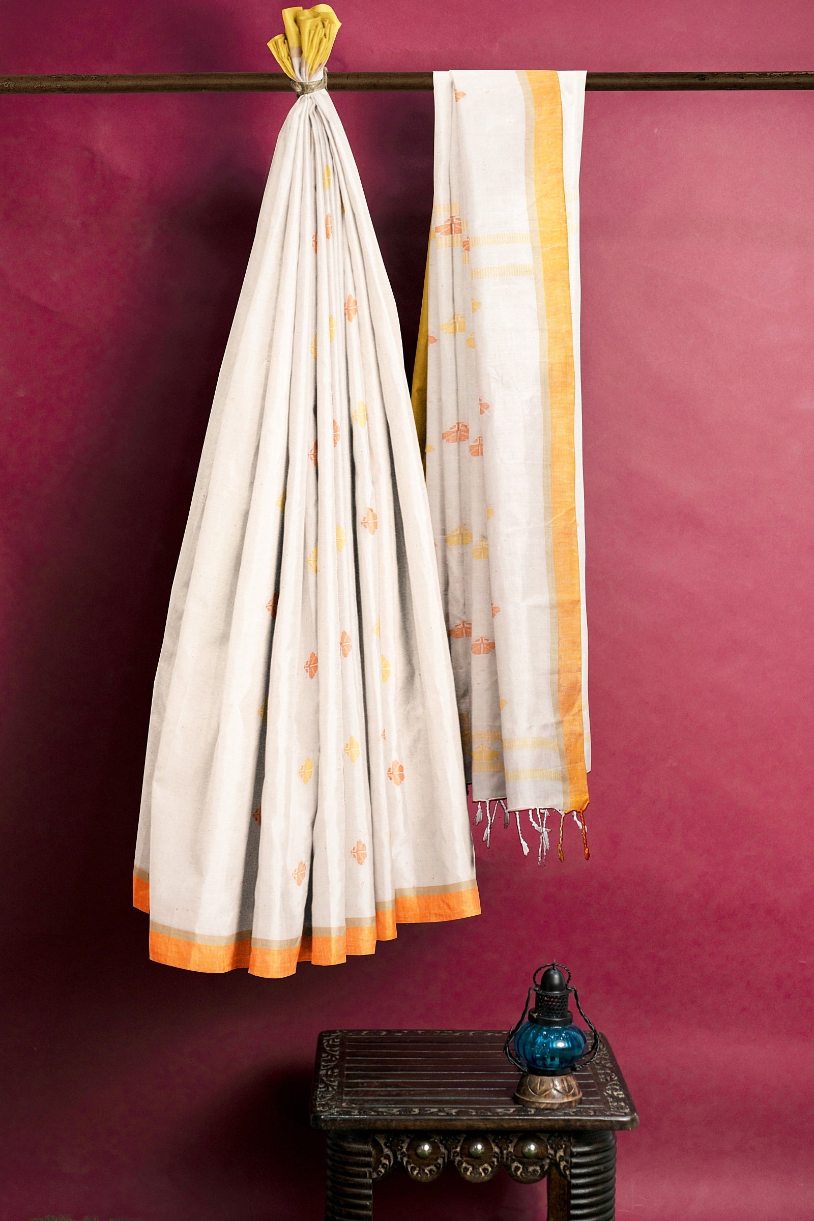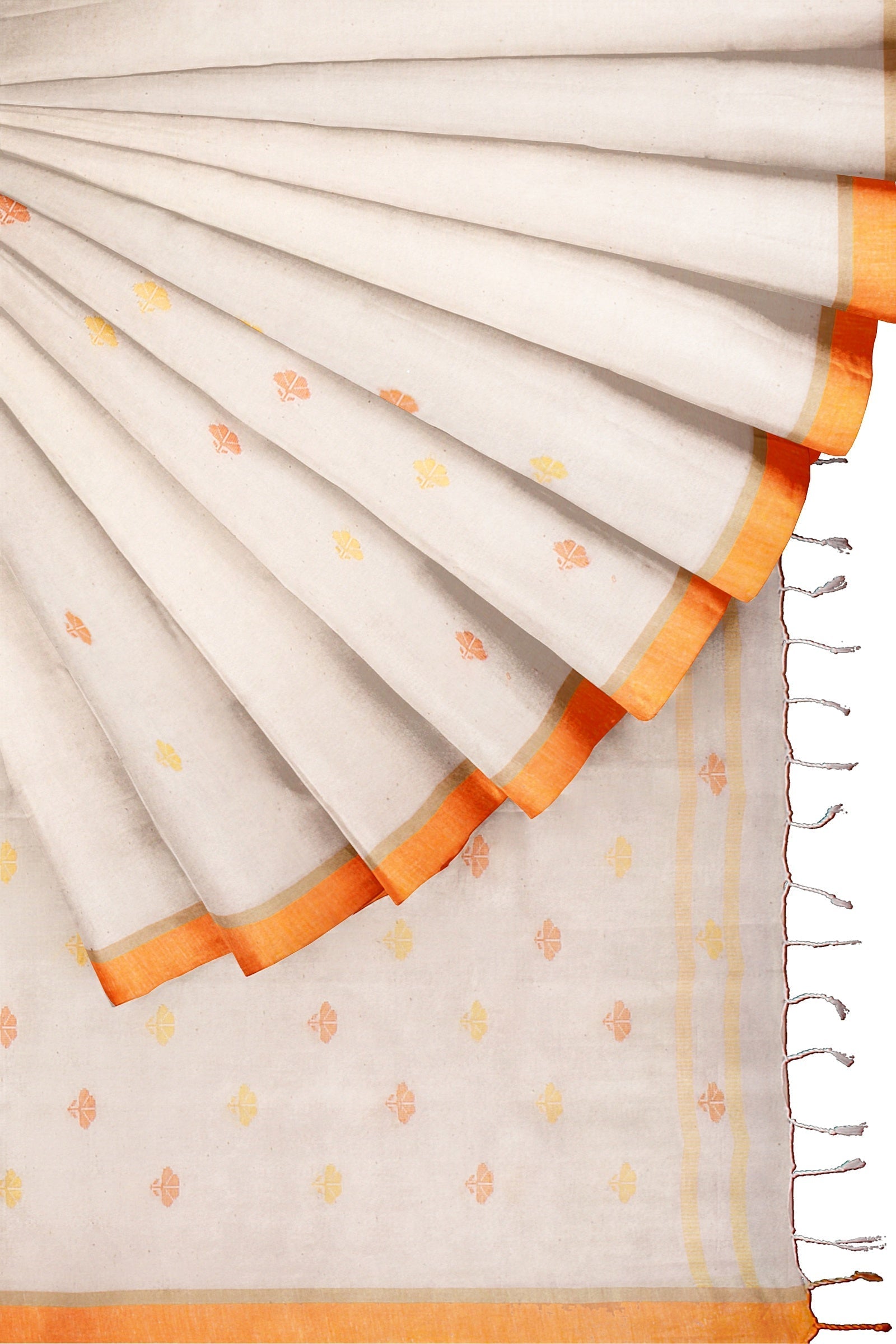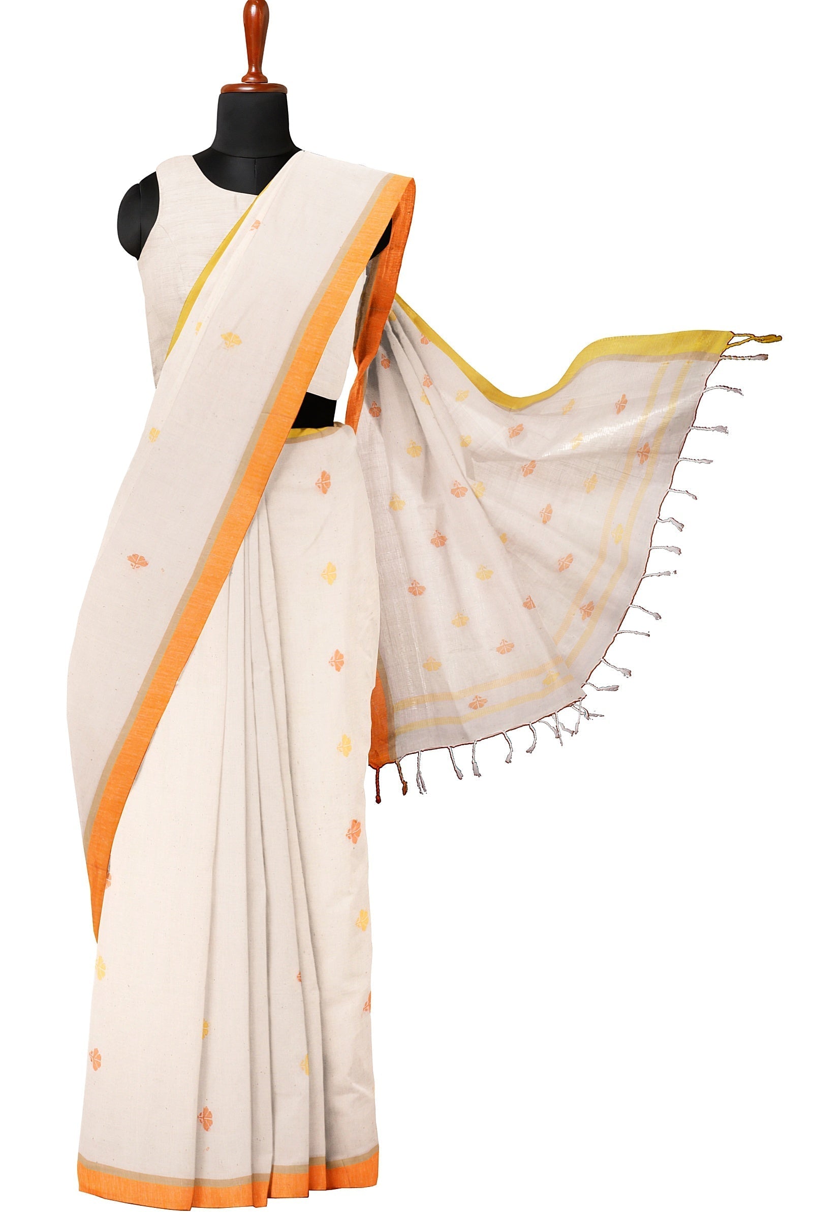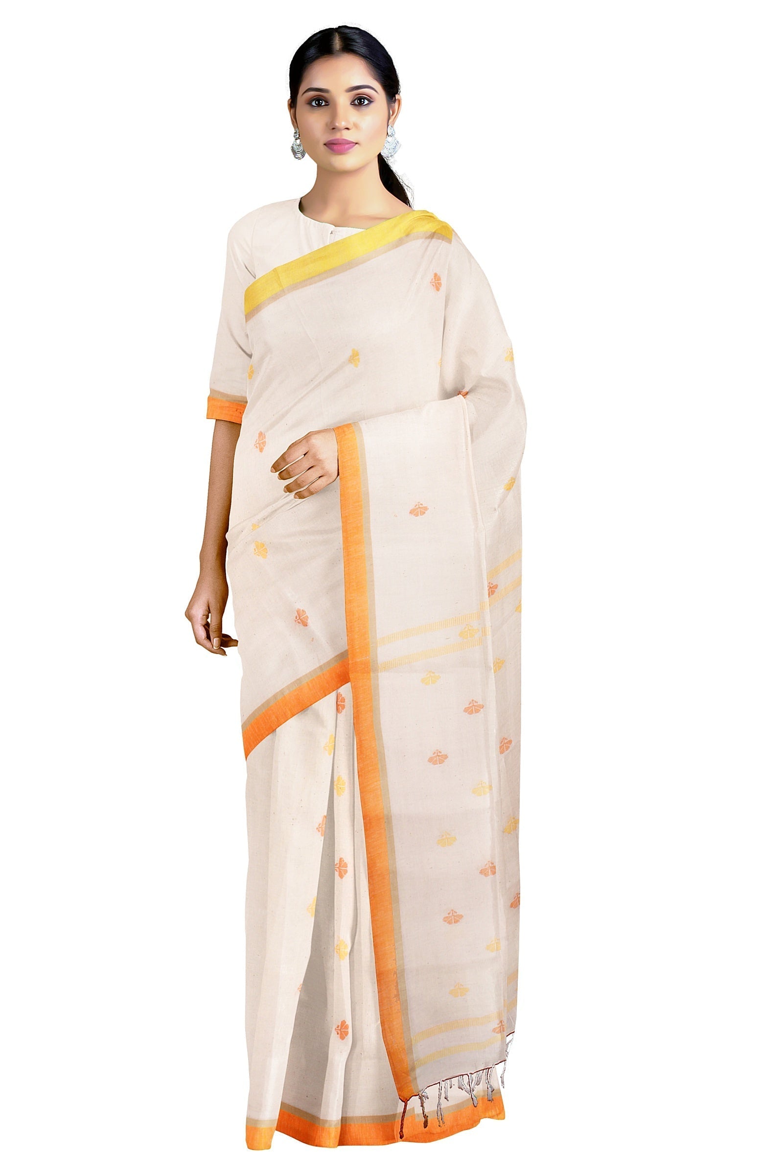 Off White Saree with Beige, Yellow and Orange Border and Butis