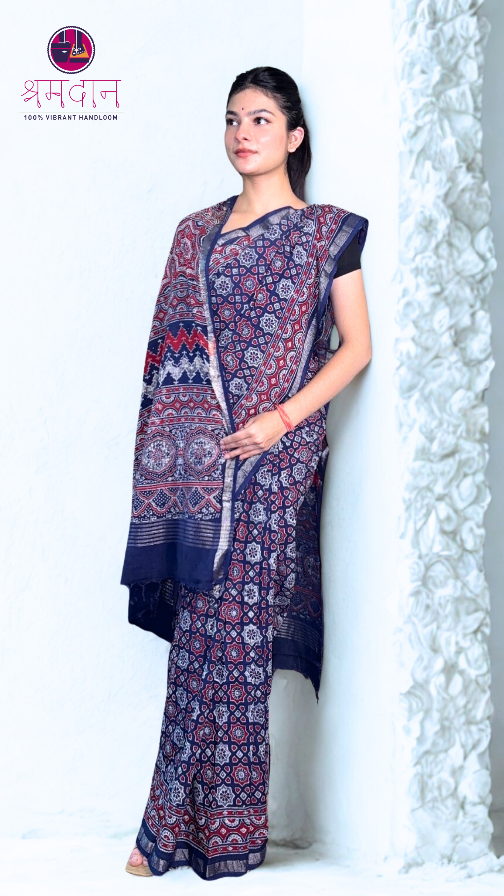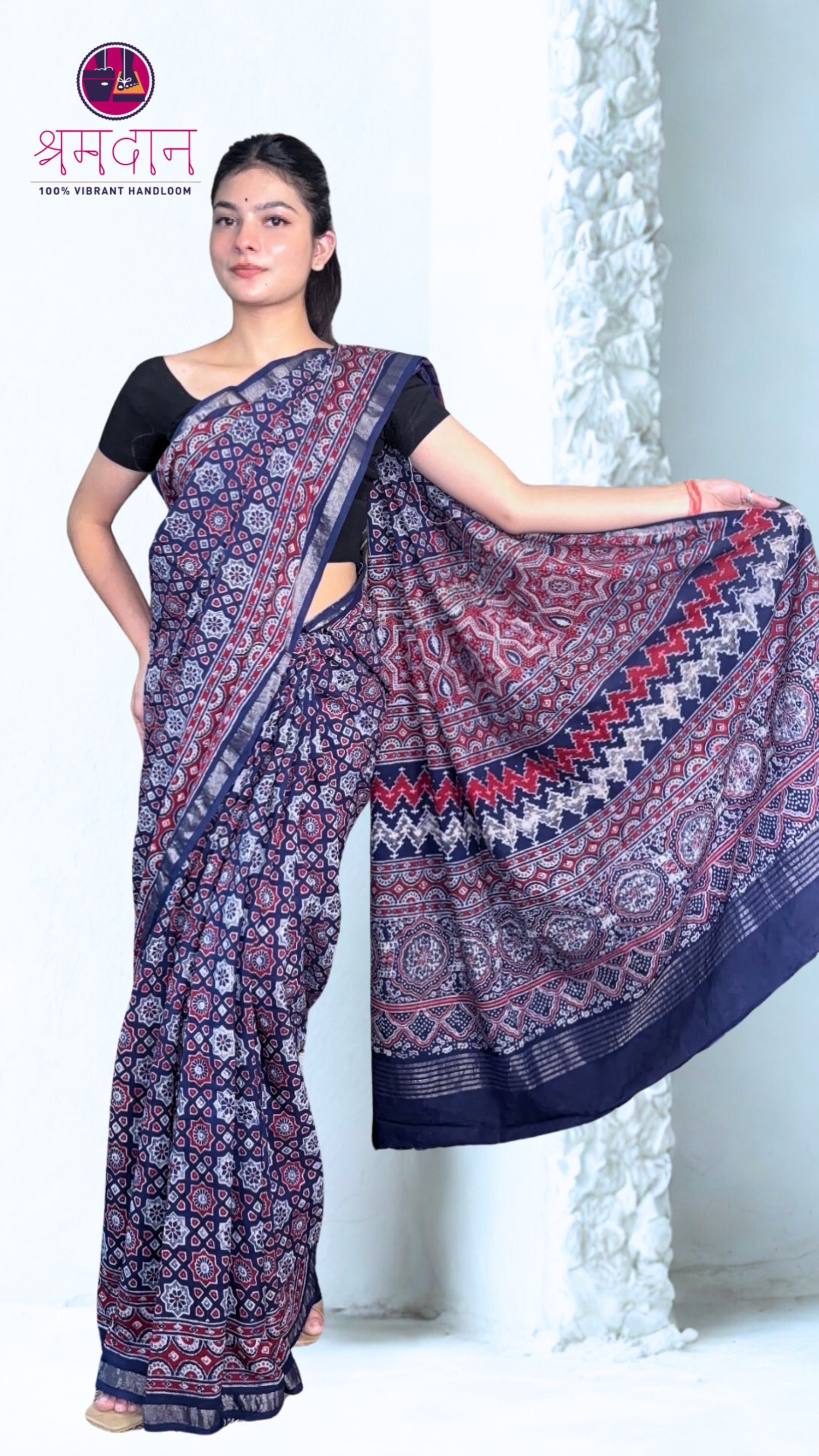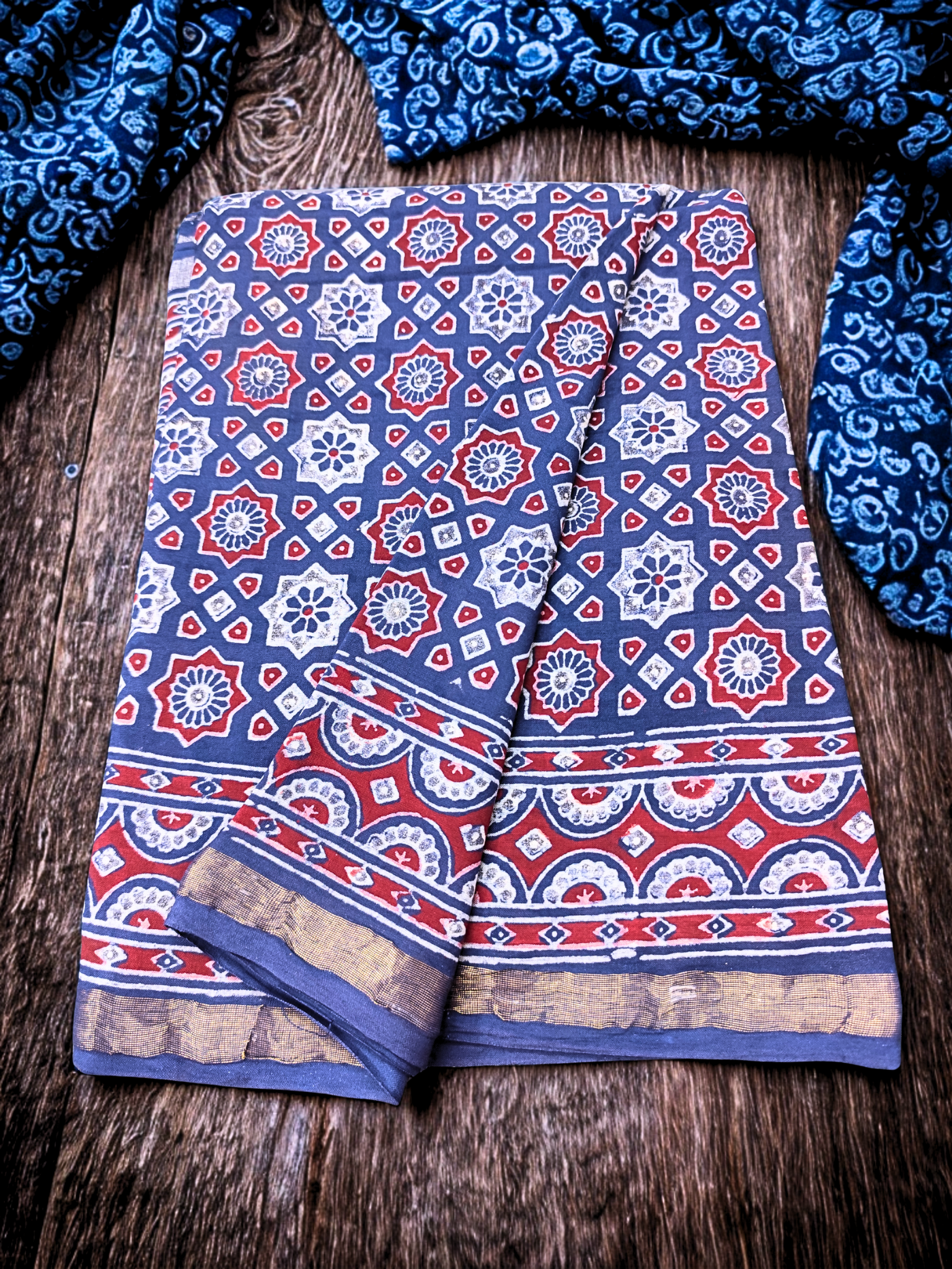 Handcrafted Blue Ajrakh Cotton Saree – A Timeless Expression of Indian Craftsmanship