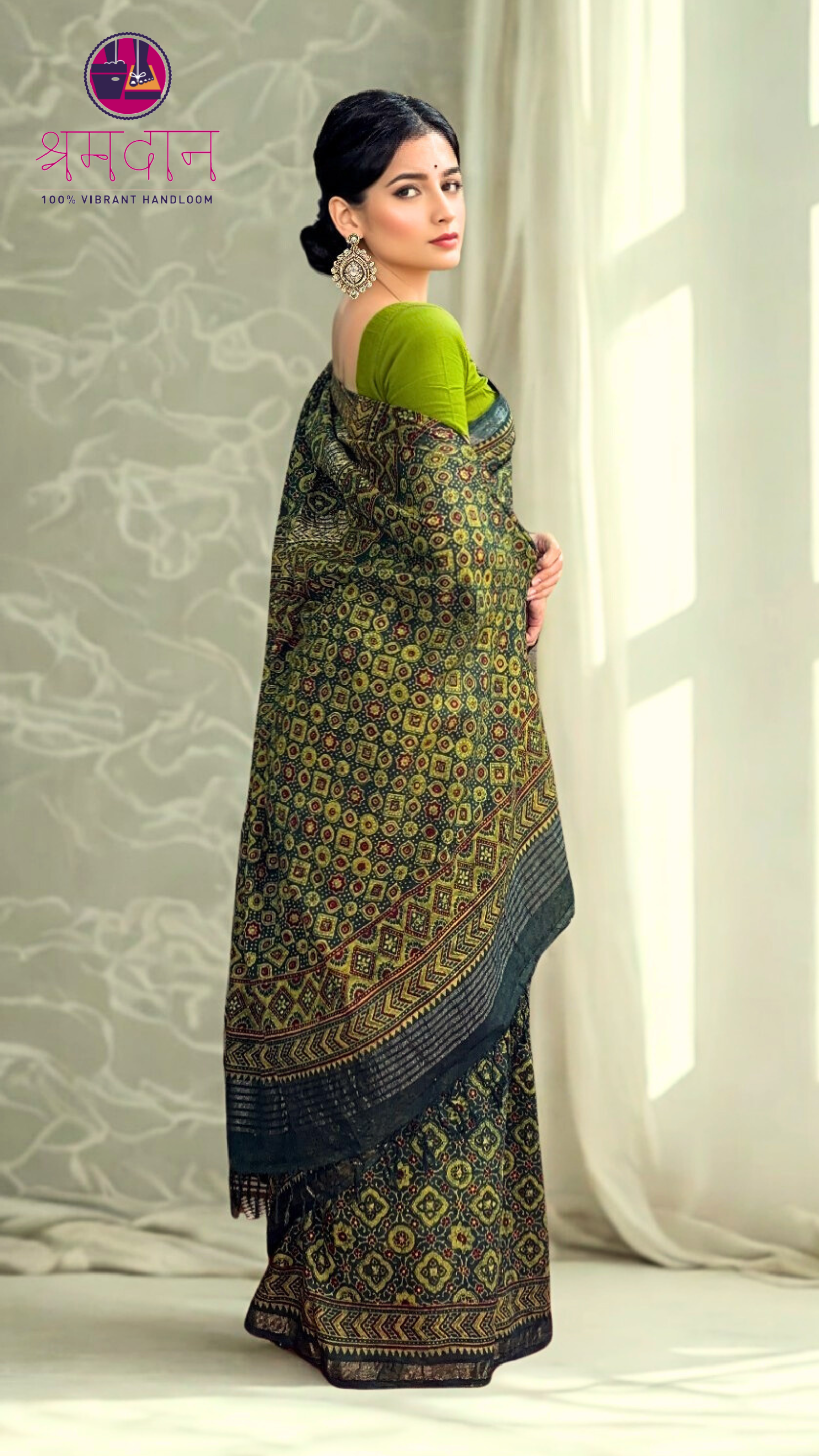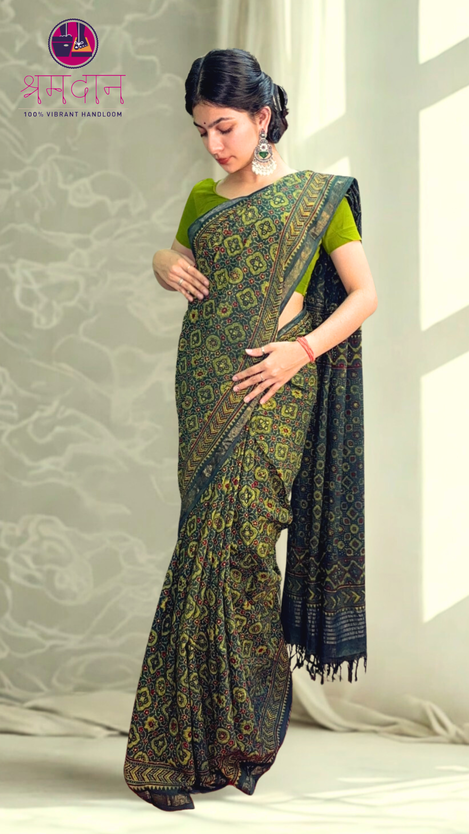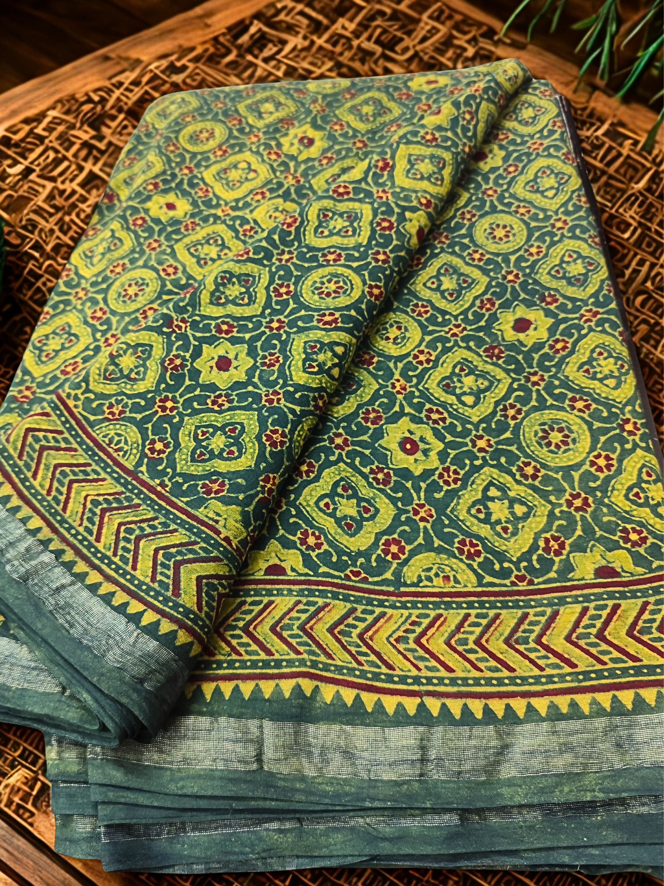 Handcrafted Green Ajrakh Cotton Saree with Elegant Zari Border – A Blend of Tradition and Grace