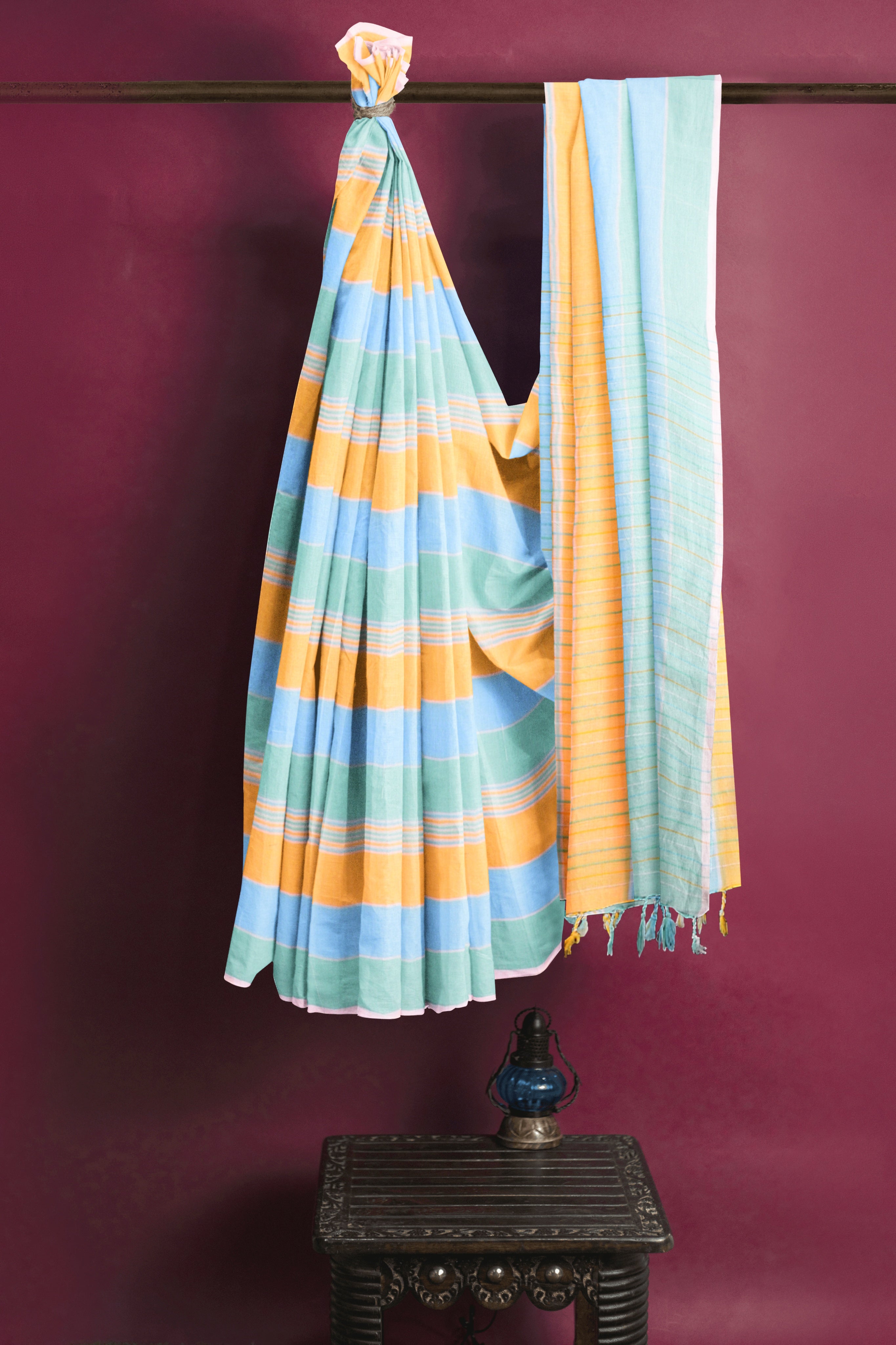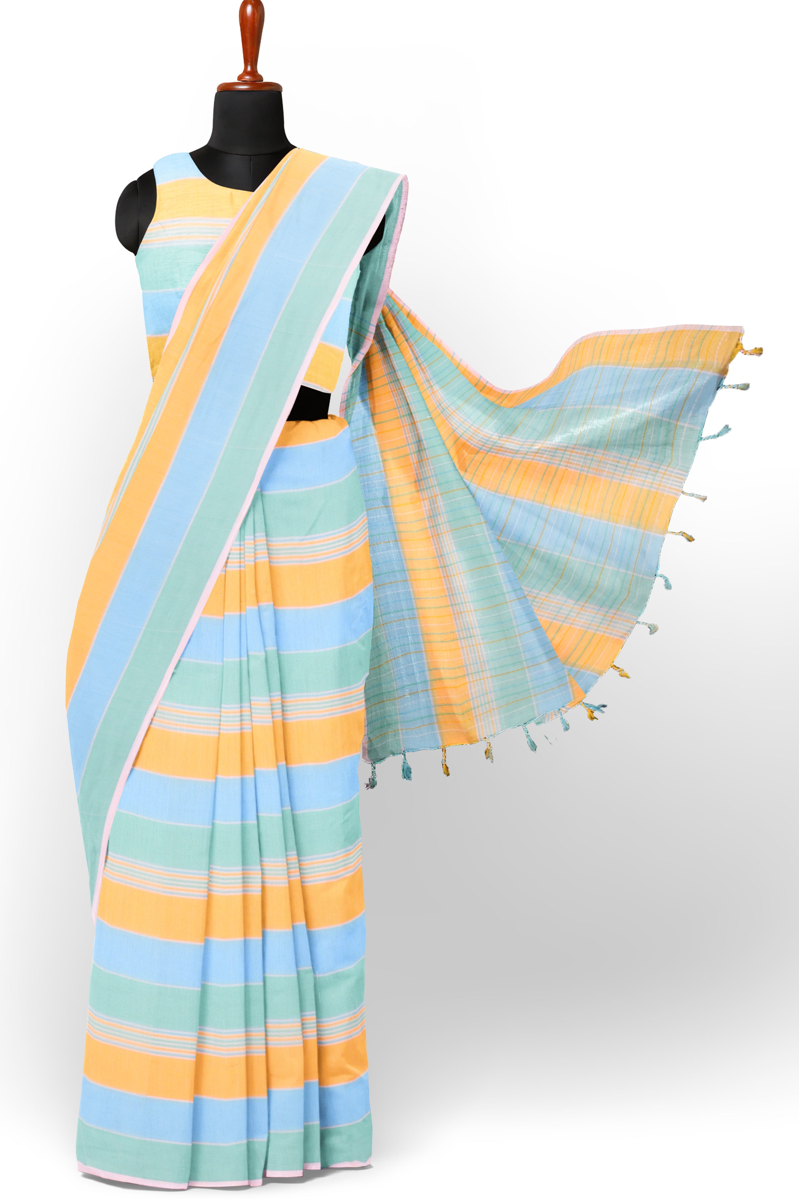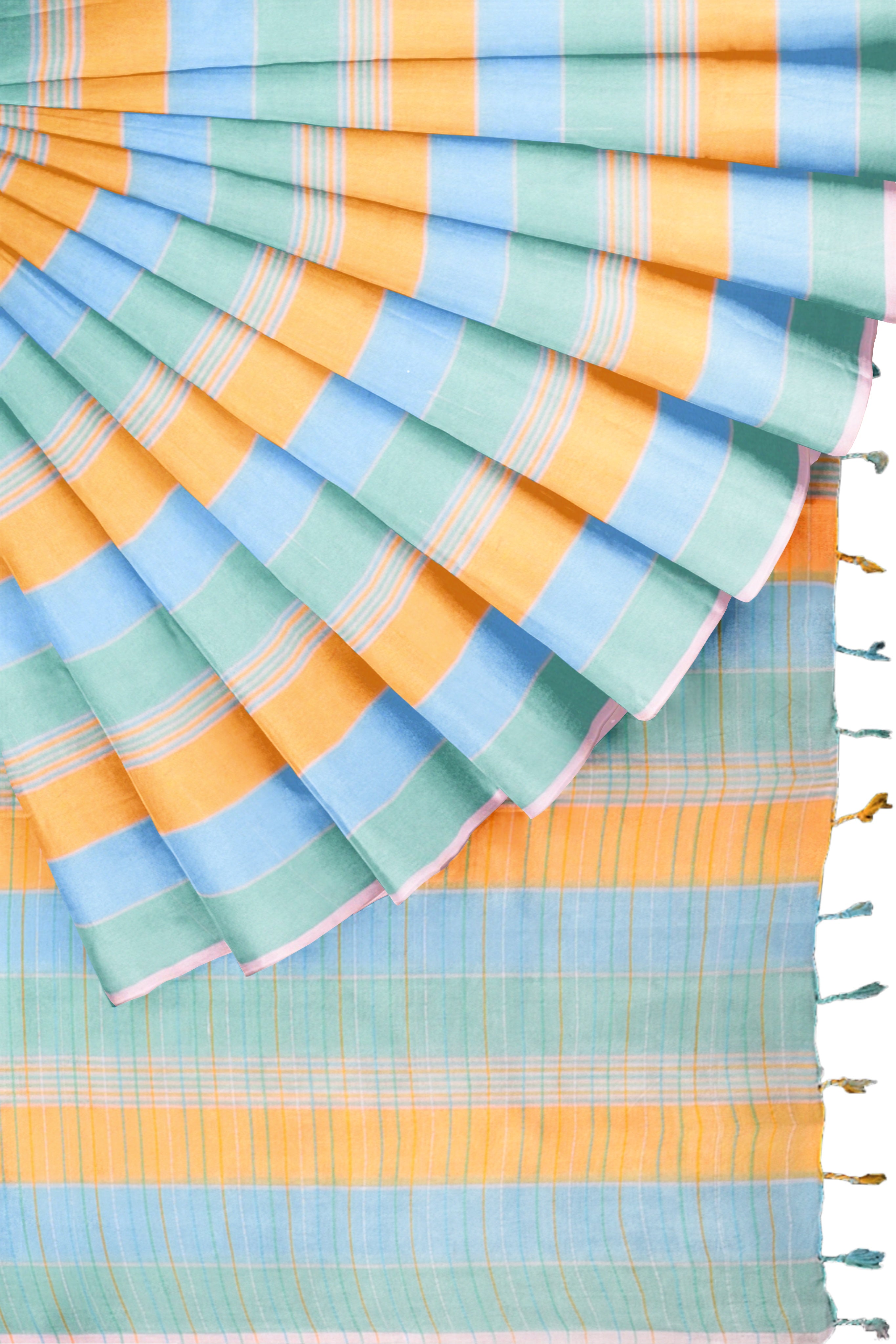 Lemon Yellow, Sky Blue and Sea Green Multi Saree with White Border